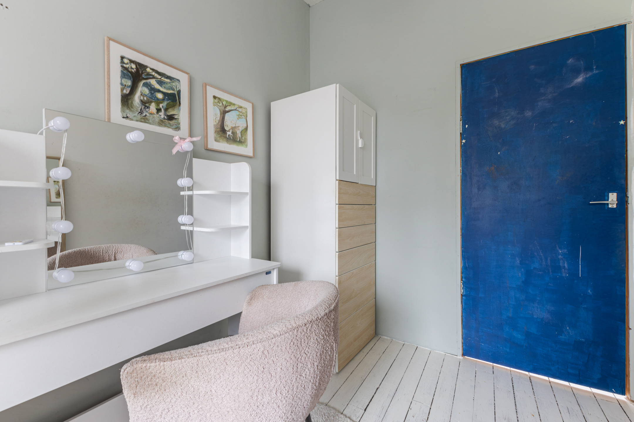 From the landing, there is access to both the living room and the kitchen. The space enjoys pleasant natural light and features a beautiful wooden floor.