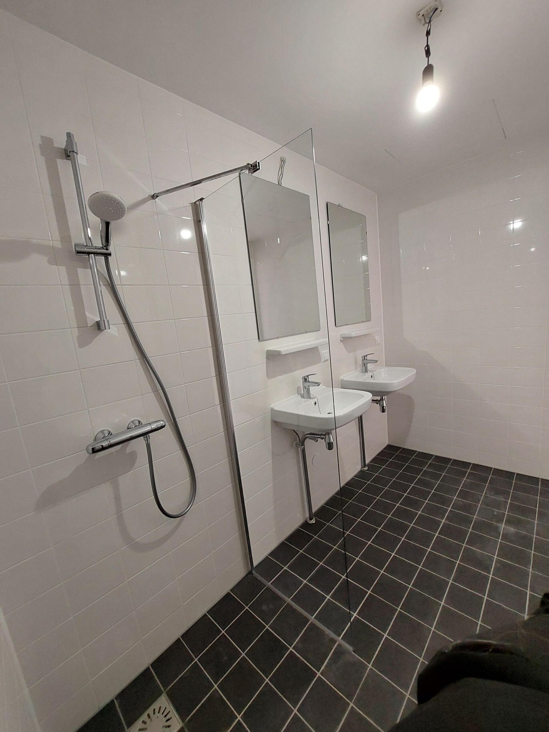 - De badkamer is voorzien van een glazen douchewand en 2 wasbakken