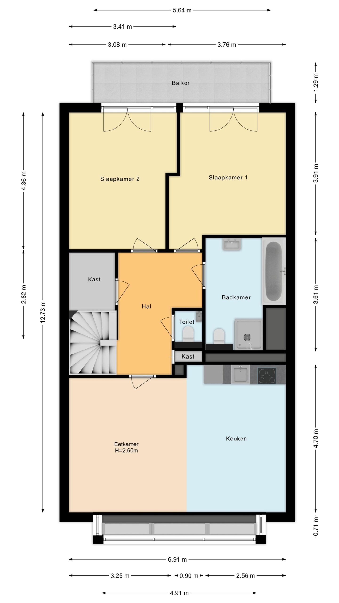 Op deze etage vinden we een ruime eetkamer met compleet uitgeruste keuken die door het grote erkerraam van een grote hoeveelheid lichtinval geniet.