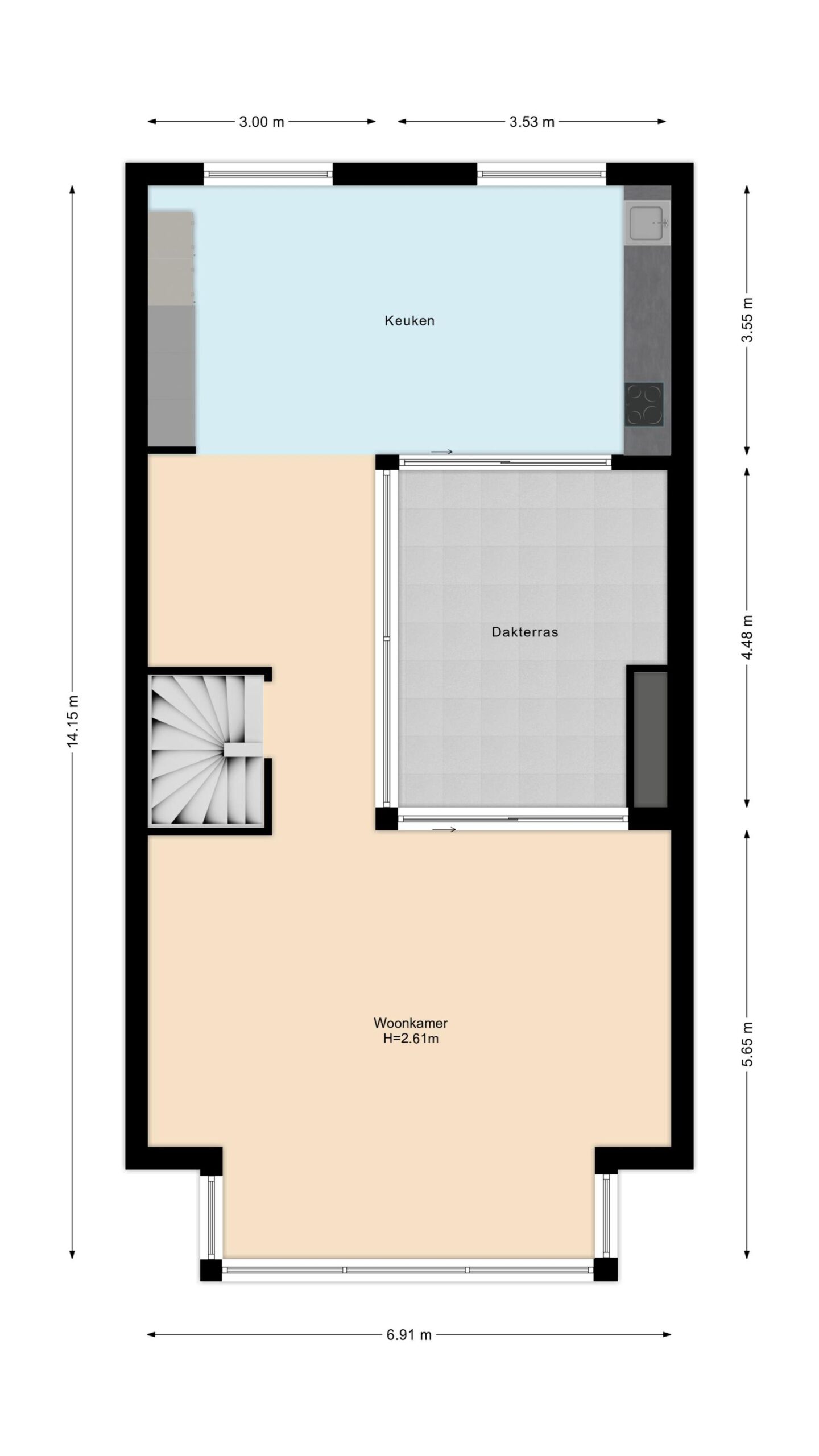 De grote woonkamer met open leefkeuken bevindt zich op de bovenste woonlaag van de woning en wordt gekenmerkt door een prettige en open sfeer en een grote hoeveelheid lichtinval door de vele raampartijen. 2 schuifpuien bieden toegang tot het royale dakterras dat een erg beschutte ligging heeft en van lekker veel zon profiteert.