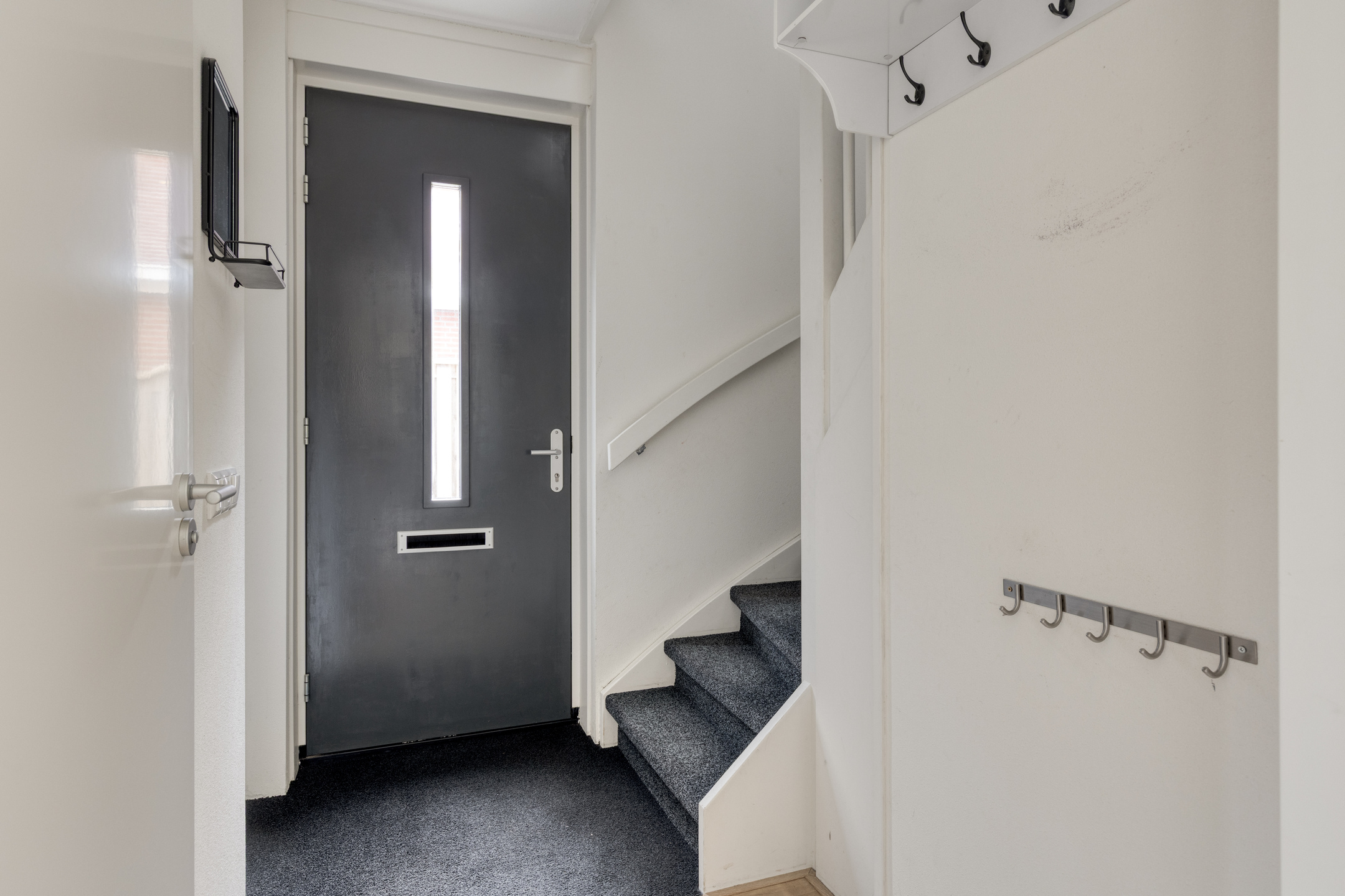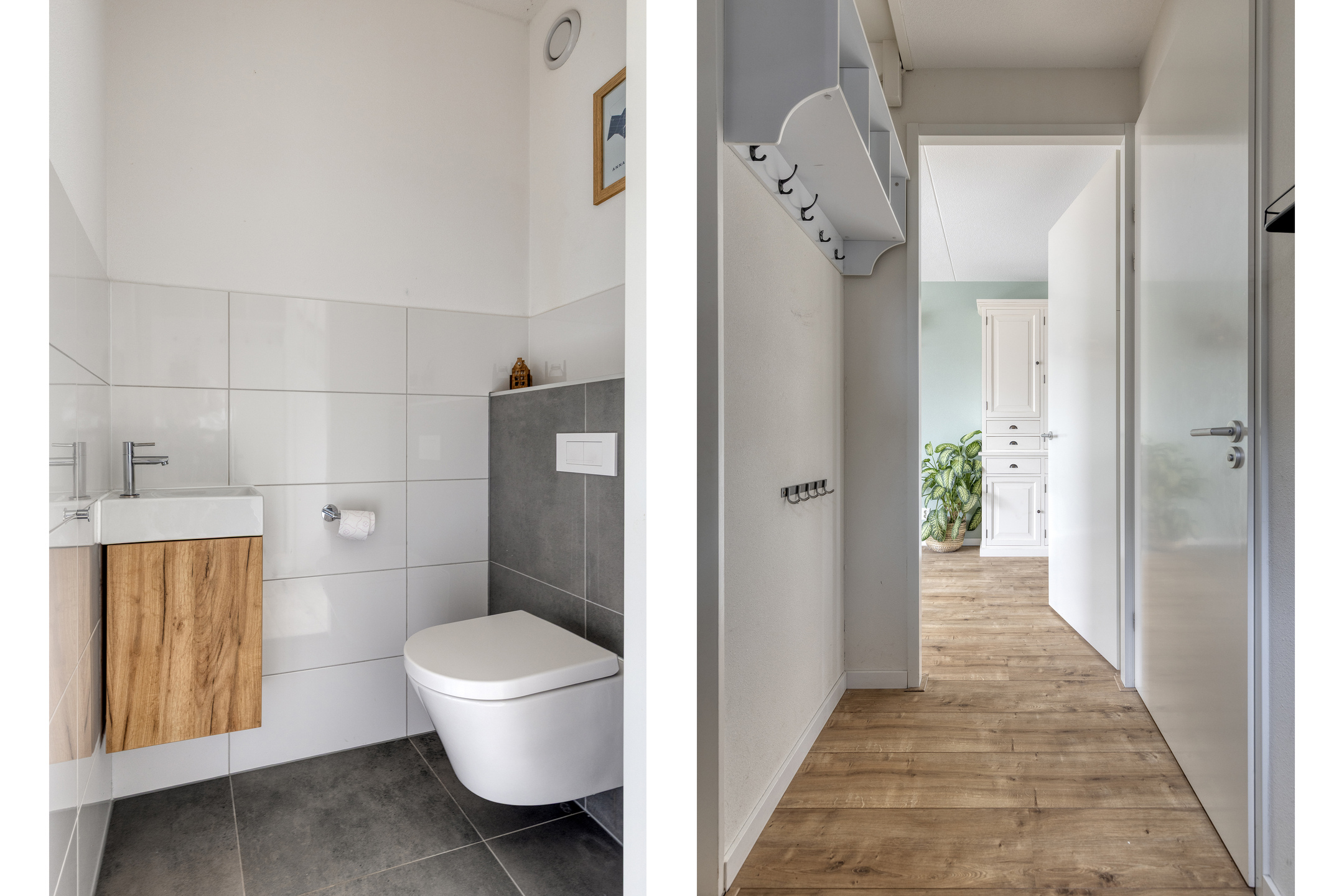 Via de entree kom je binnen in de hal met de meterkast, trapopgang en het moderne toilet met wandcloset en fonteintje.