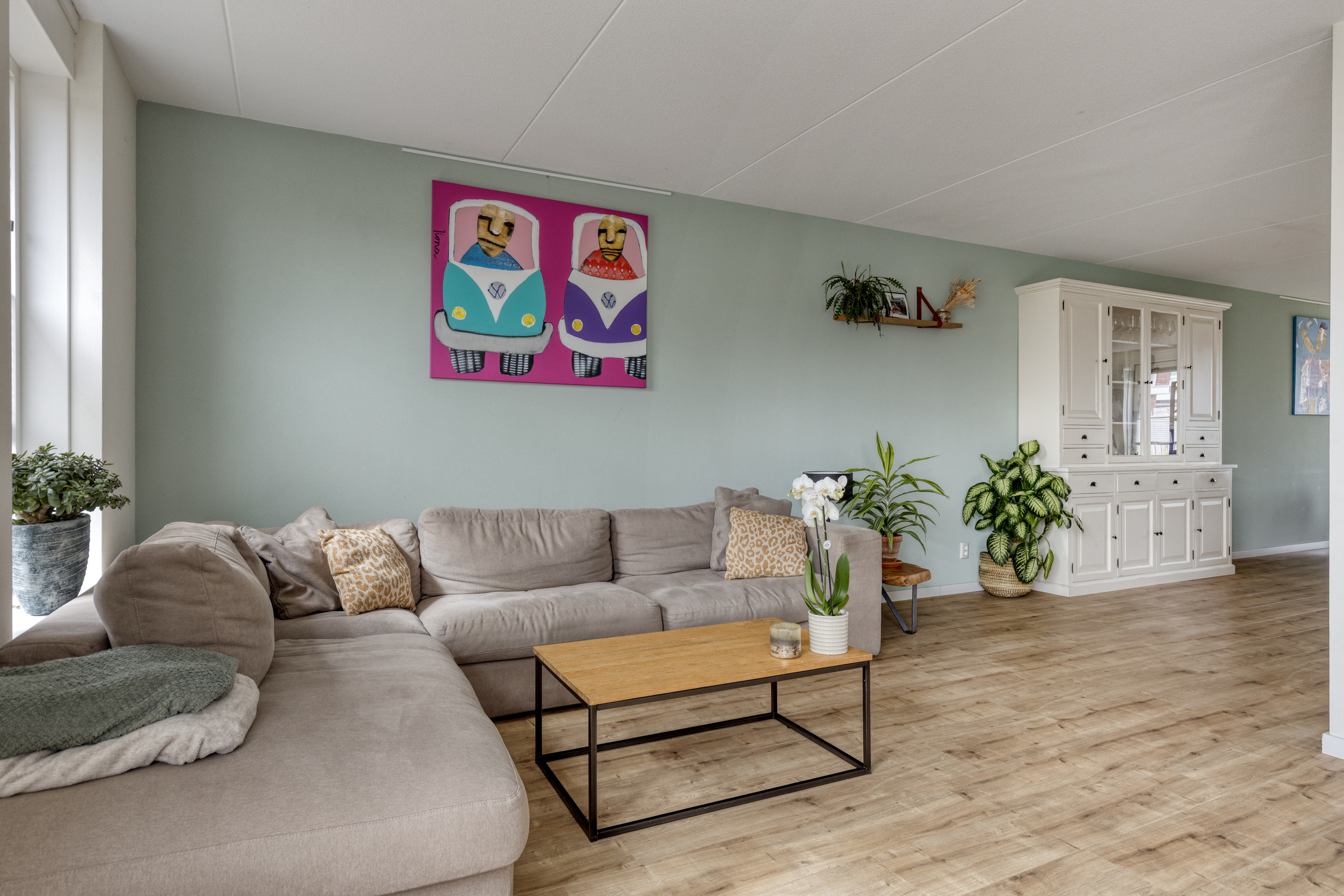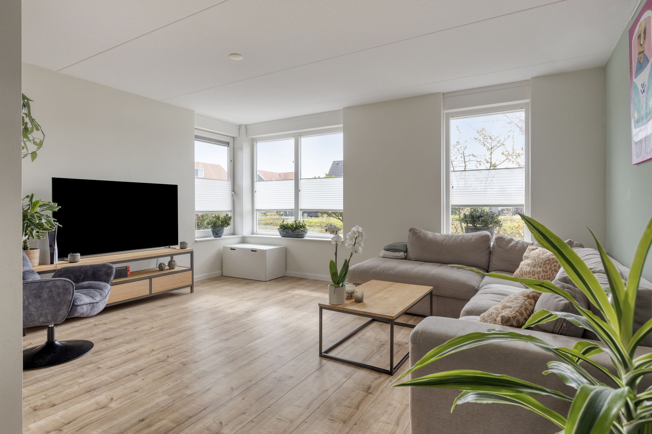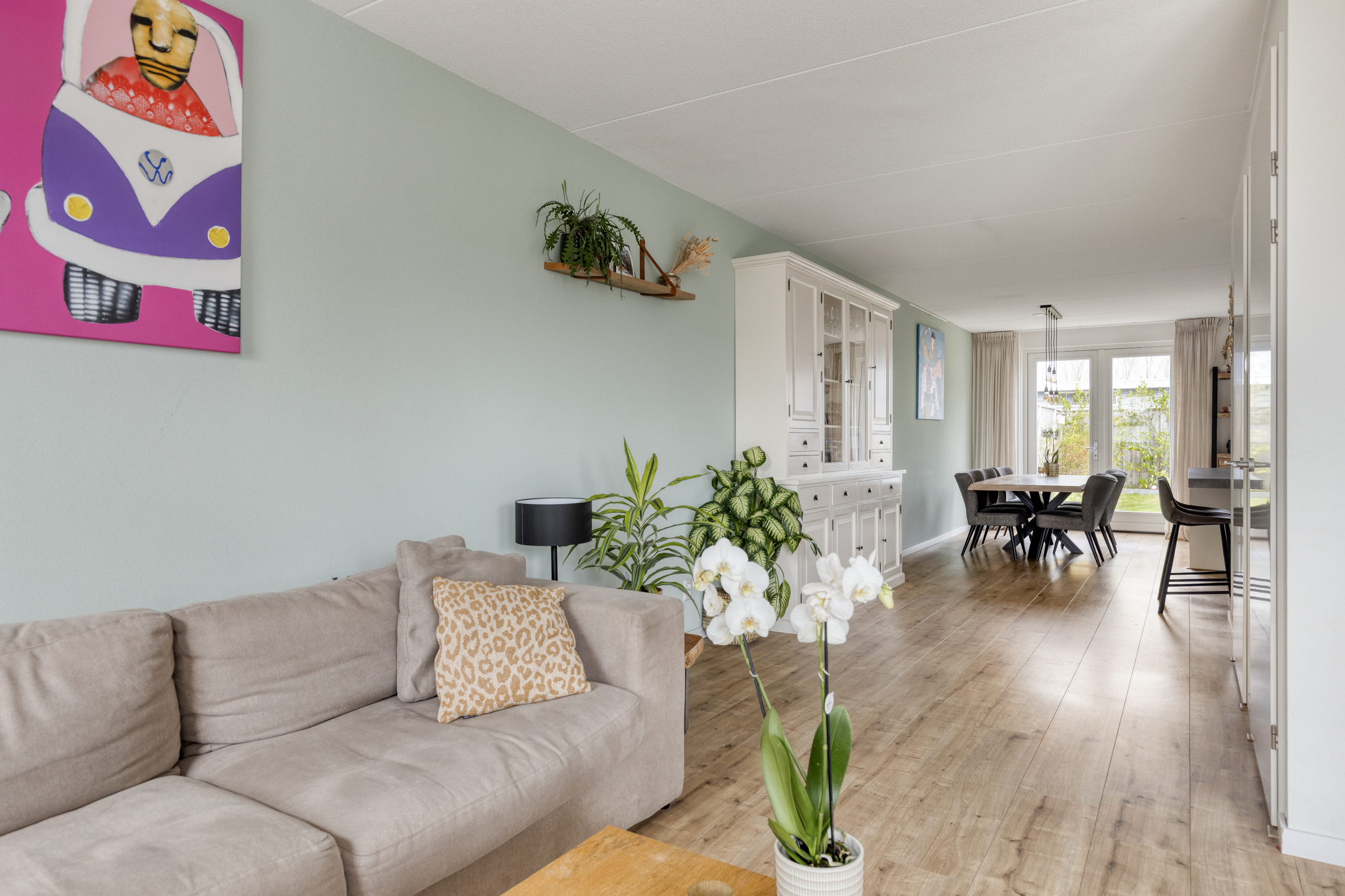 De woonkamer ligt aan de voorzijde van de woning en is ruim opgezet. Dankzij de grote raampartijen en de lange zichtlijn richting de achterzijde voelt de ruimte open en licht aan. Er is genoeg plek voor een royale zithoek en een eettafel past mooi bij de keuken.