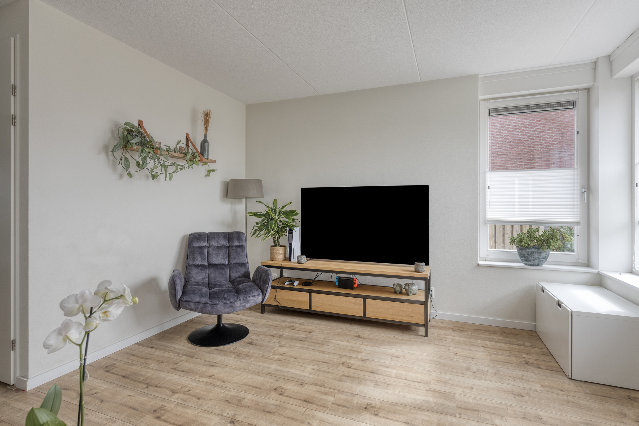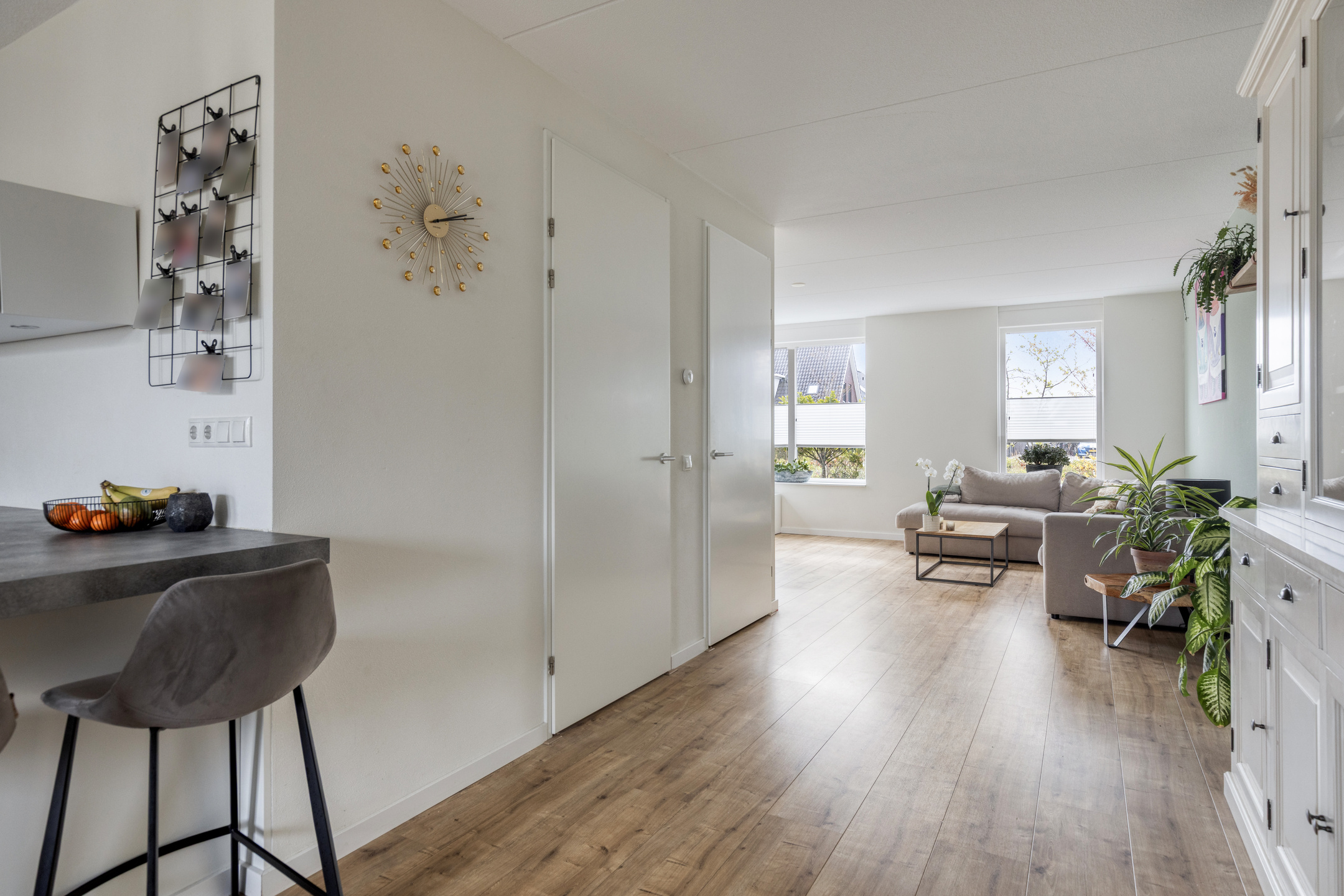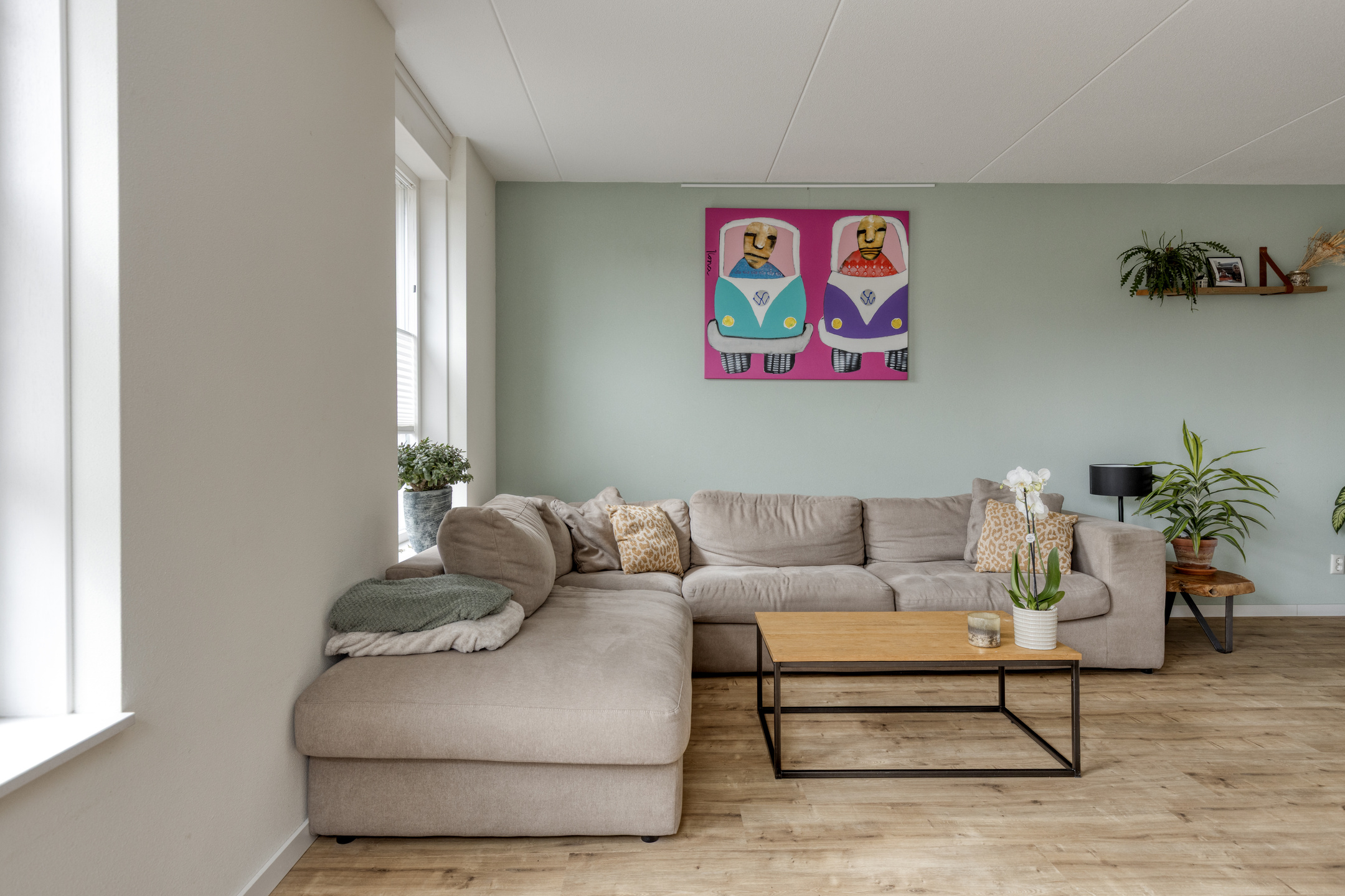 De woonkamer ligt aan de voorzijde van de woning en is ruim opgezet. Dankzij de grote raampartijen en de lange zichtlijn richting de achterzijde voelt de ruimte open en licht aan. Er is genoeg plek voor een royale zithoek en een eettafel past mooi bij de keuken.