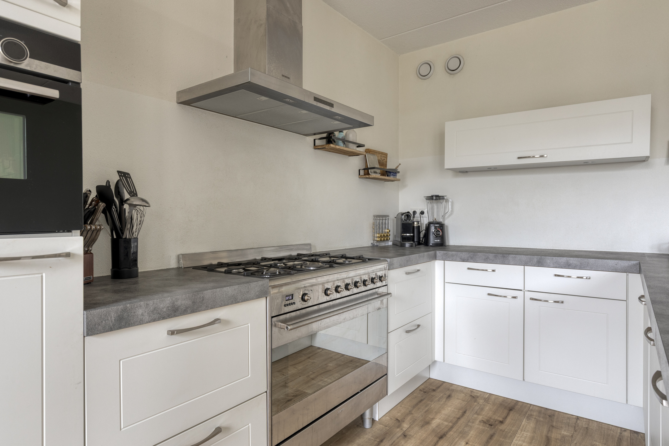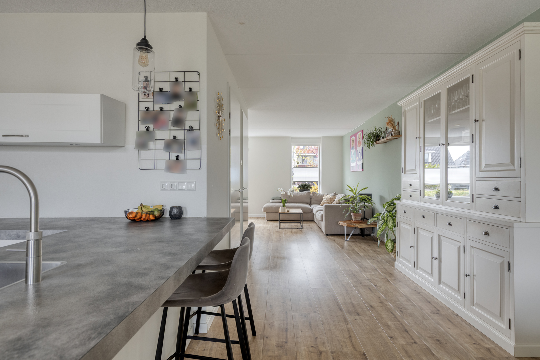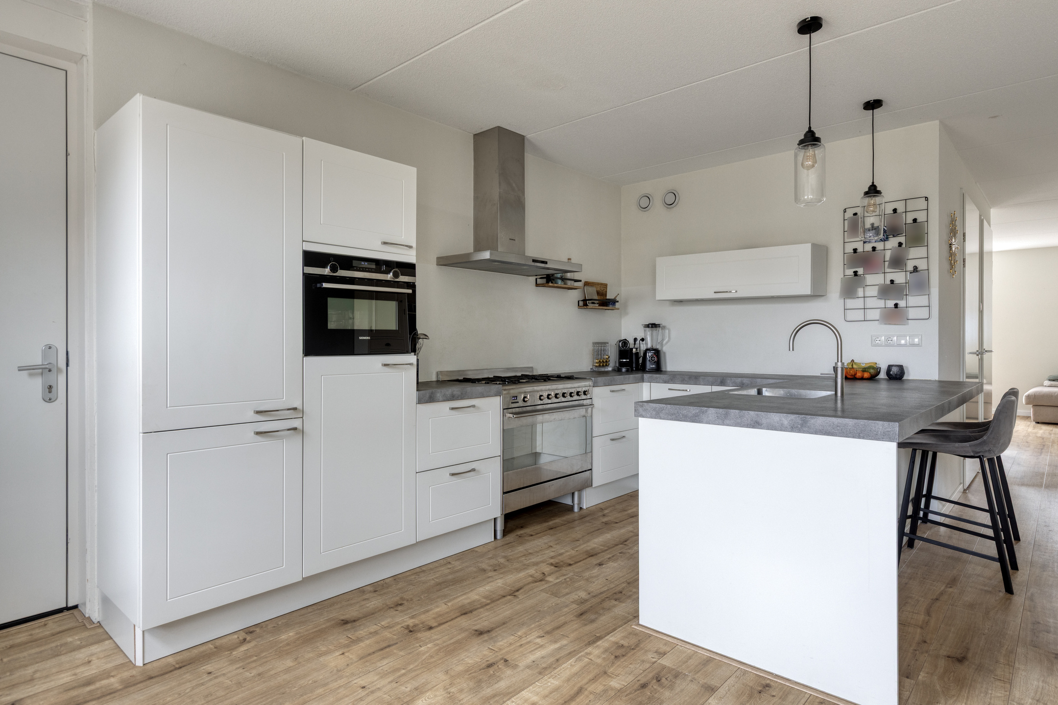 Aan de tuinzijde bevindt zich de royale leefkeuken. Deze is modern uitgevoerd en voorzien van een spoeleiland met ontbijtbar. Daarnaast is de keuken uitgerust met veel werk- en kastruimte en diverse apparatuur (breed gasfornuis, afzuigkap, combi-oven, vaatwasser, koel-/vriescombinatie en Quooker). Vanuit de keuken is er toegang tot de achtertuin Ʃn tot de garage.