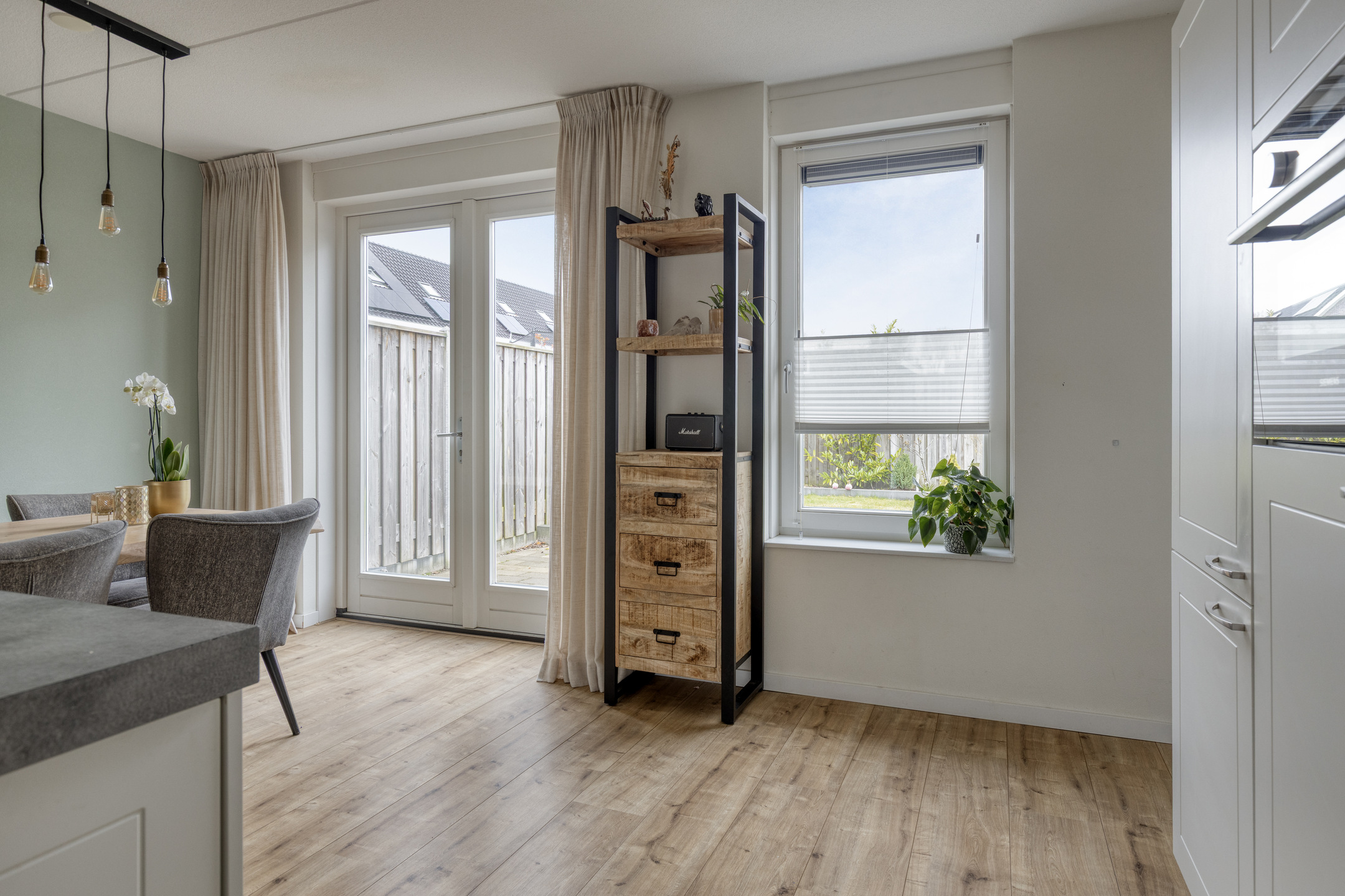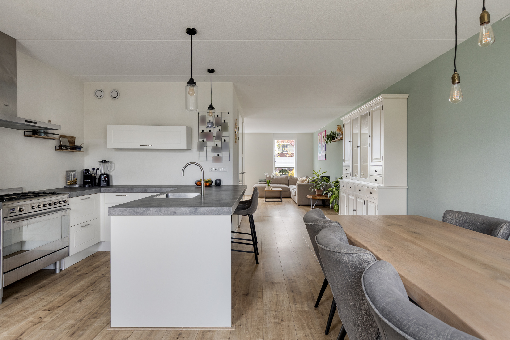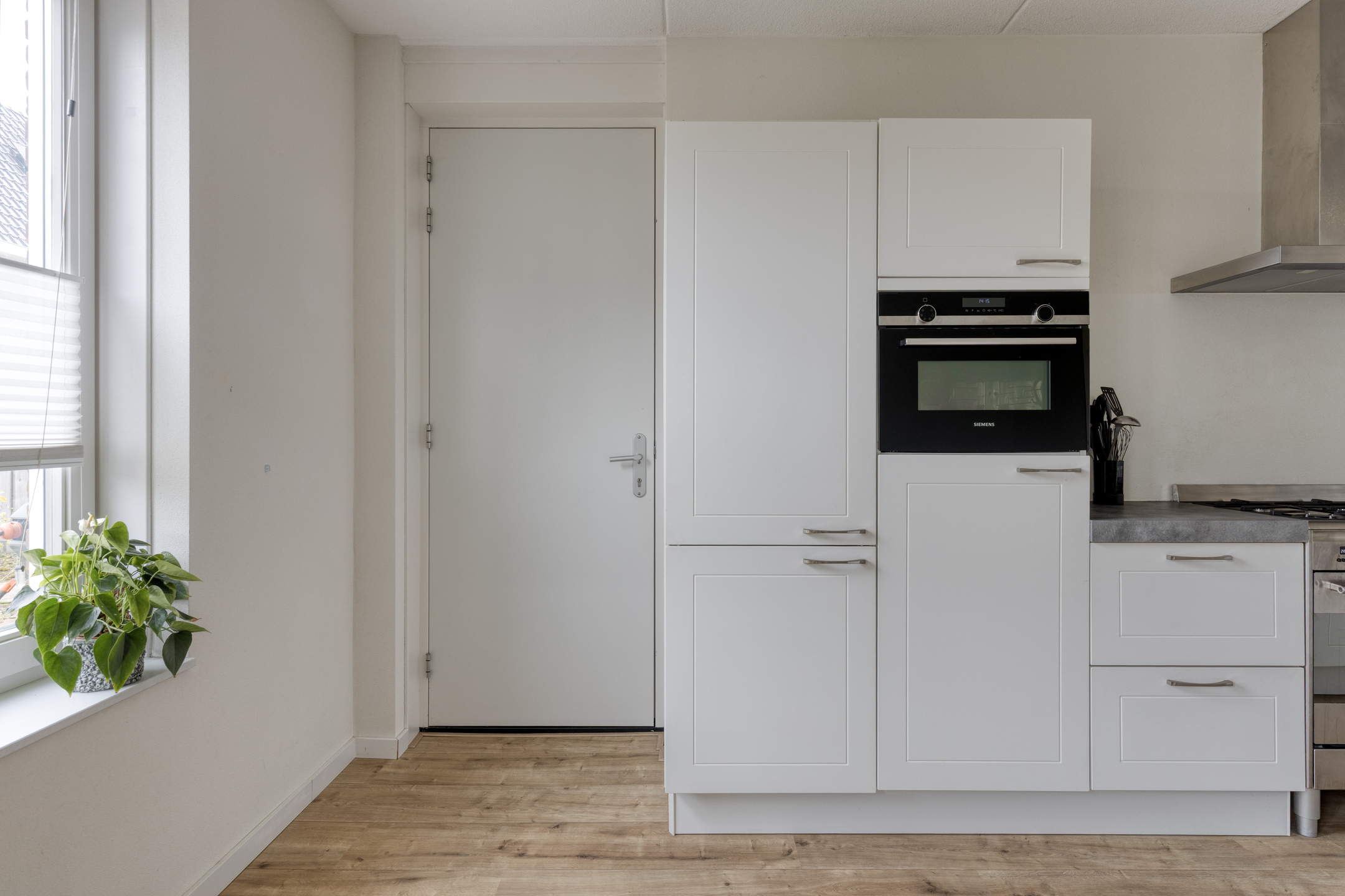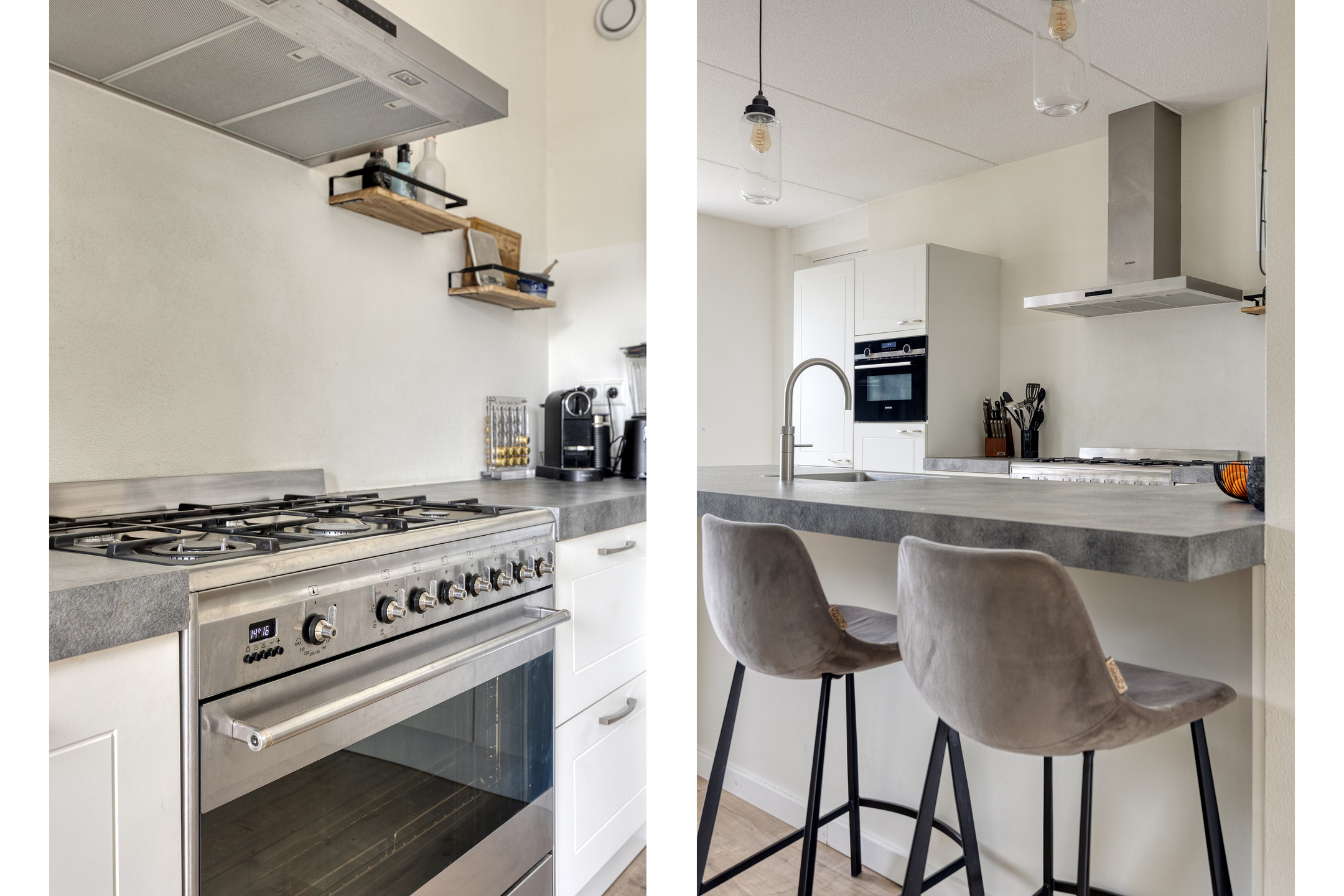 Aan de tuinzijde bevindt zich de royale leefkeuken. Deze is modern uitgevoerd en voorzien van een spoeleiland met ontbijtbar. Daarnaast is de keuken uitgerust met veel werk- en kastruimte en diverse apparatuur (breed gasfornuis, afzuigkap, combi-oven, vaatwasser, koel-/vriescombinatie en Quooker). Vanuit de keuken is er toegang tot de achtertuin Ʃn tot de garage.