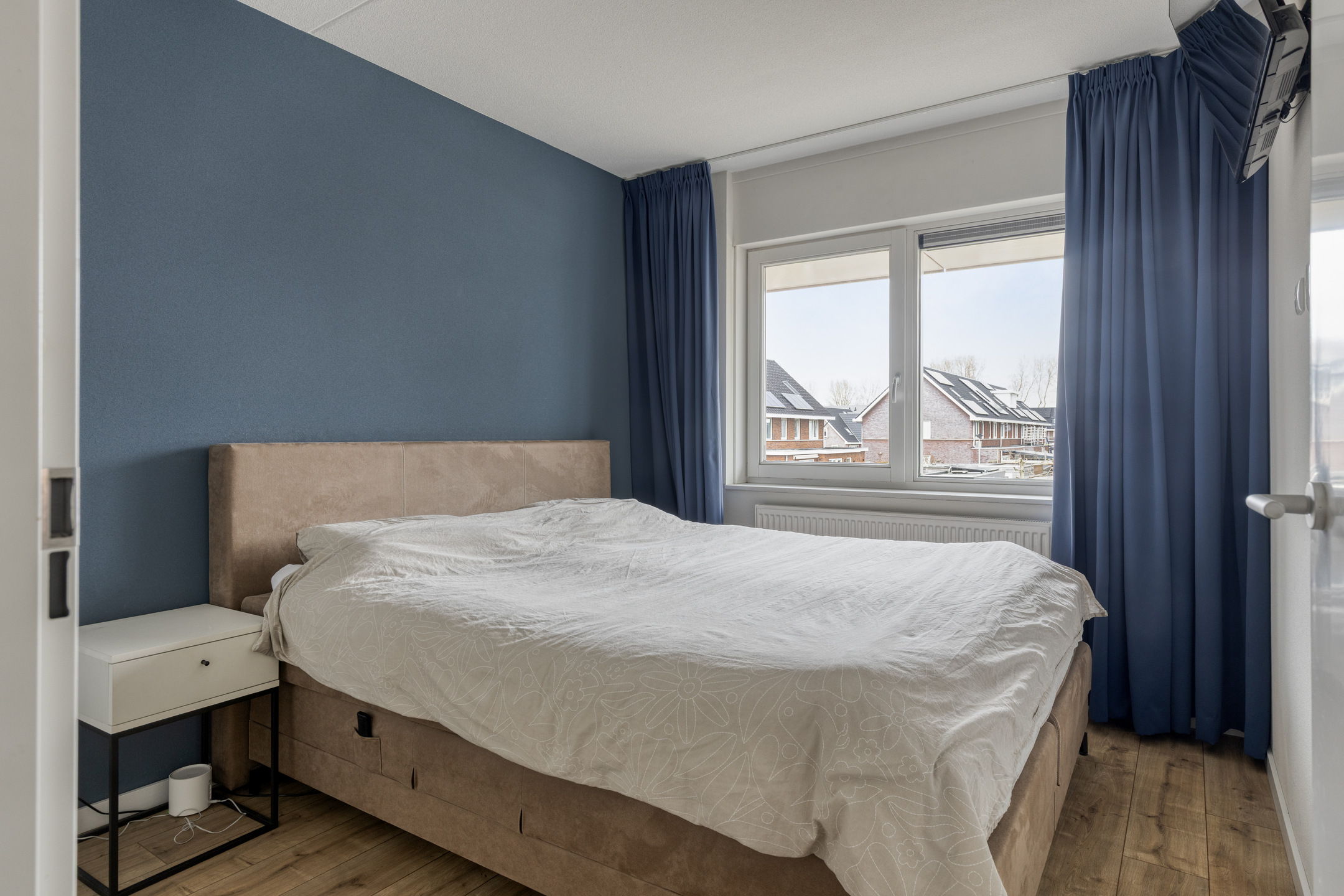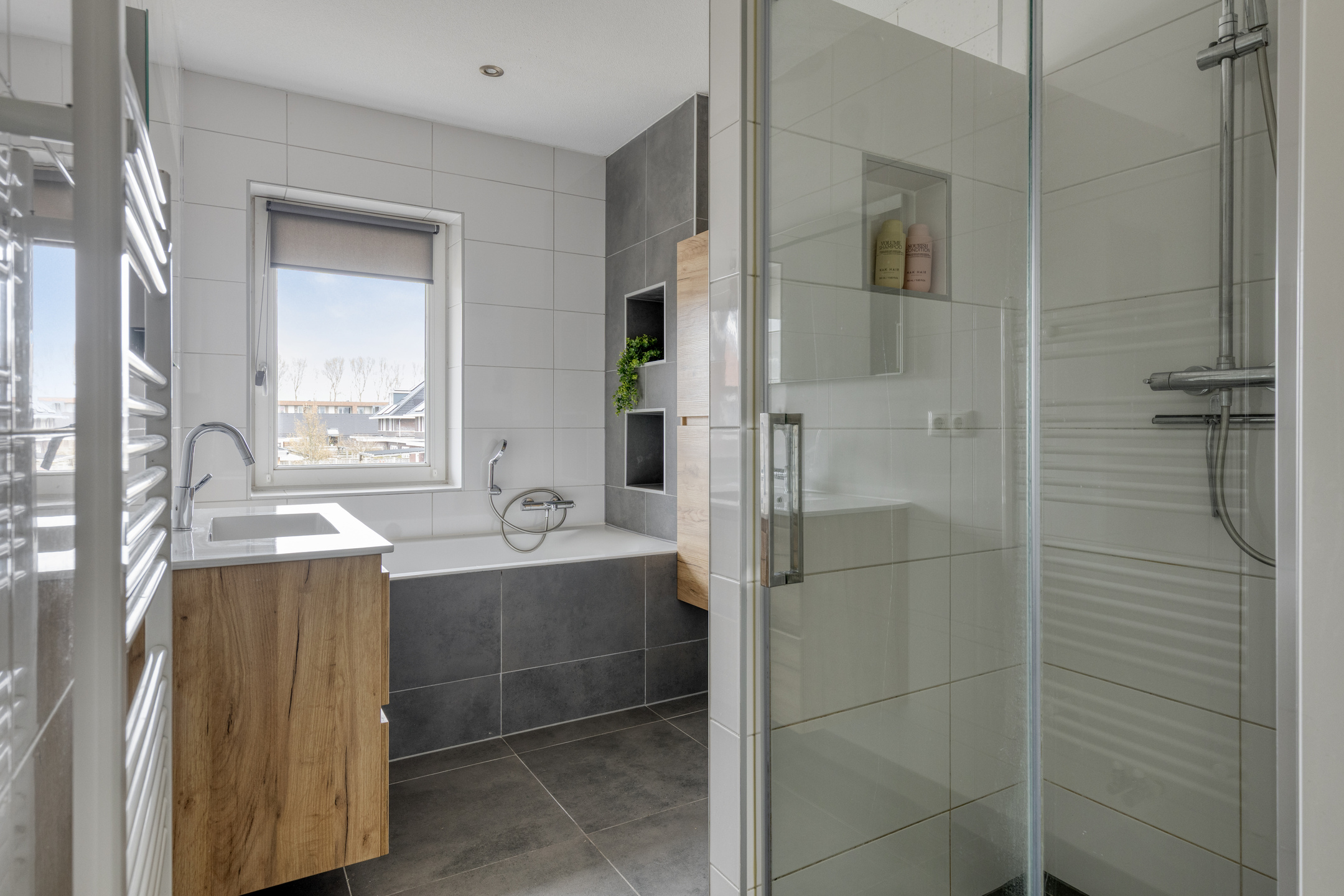 De overloop geeft toegang tot drie slaapkamers en de badkamer. De slaapkamers zijn stuk voor stuk netjes afgewerkt. De grootste slaapkamer ligt aan de achterzijde, de andere twee kamers bevinden zich aan de voorzijde van de woning. De badkamer is modern uitgevoerd en compleet ingericht met een ligbad, aparte douche, wastafelmeubel met verlichte spiegel, hangkast en wandcloset.