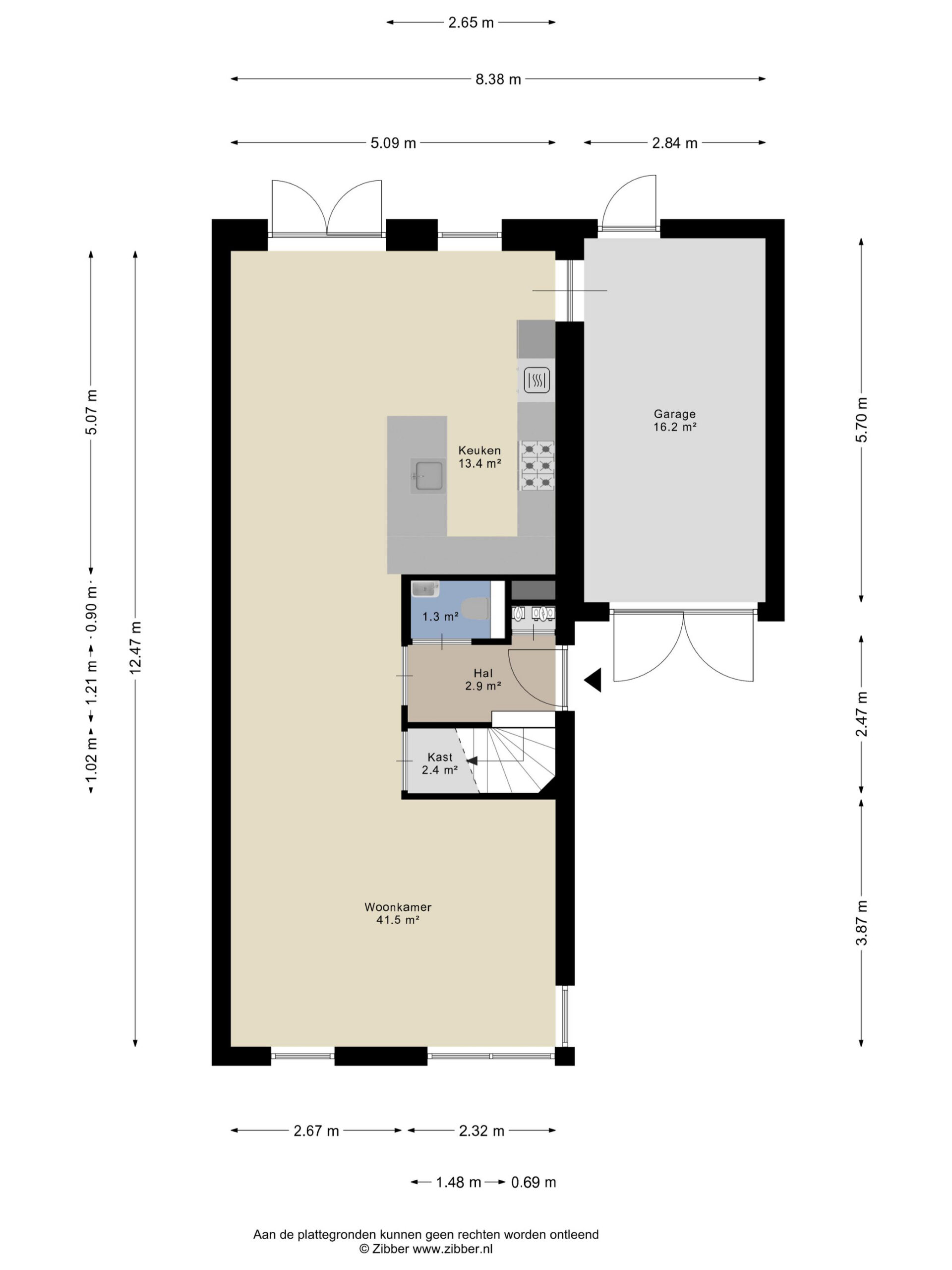 Through the entrance, you enter the hallway with the meter cupboard, staircase, and modern toilet with wall-mounted closet and sink.