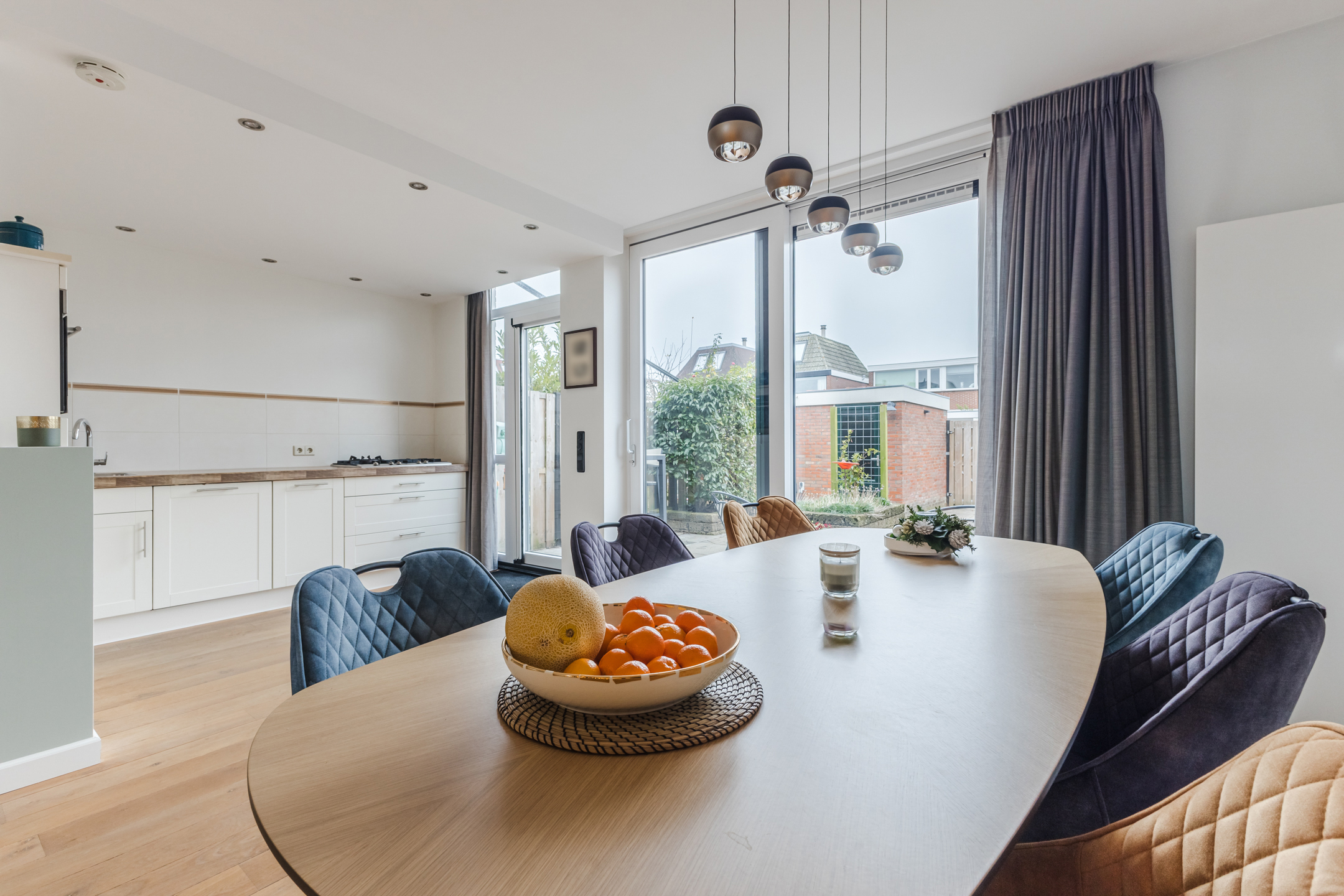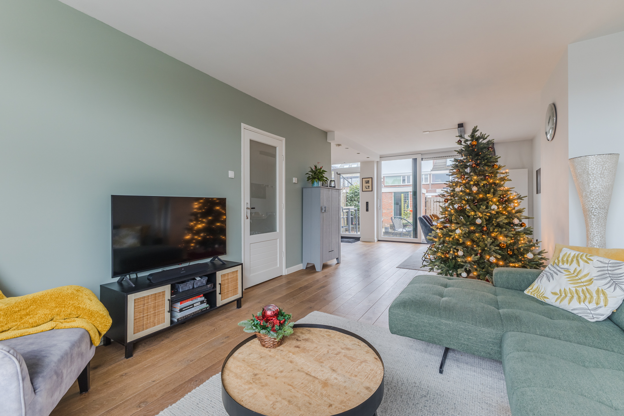 De woonkamer is heerlijk licht en mooi afgewerkt met een houten vloer. De schuifpui biedt directe toegang tot de tuin.
