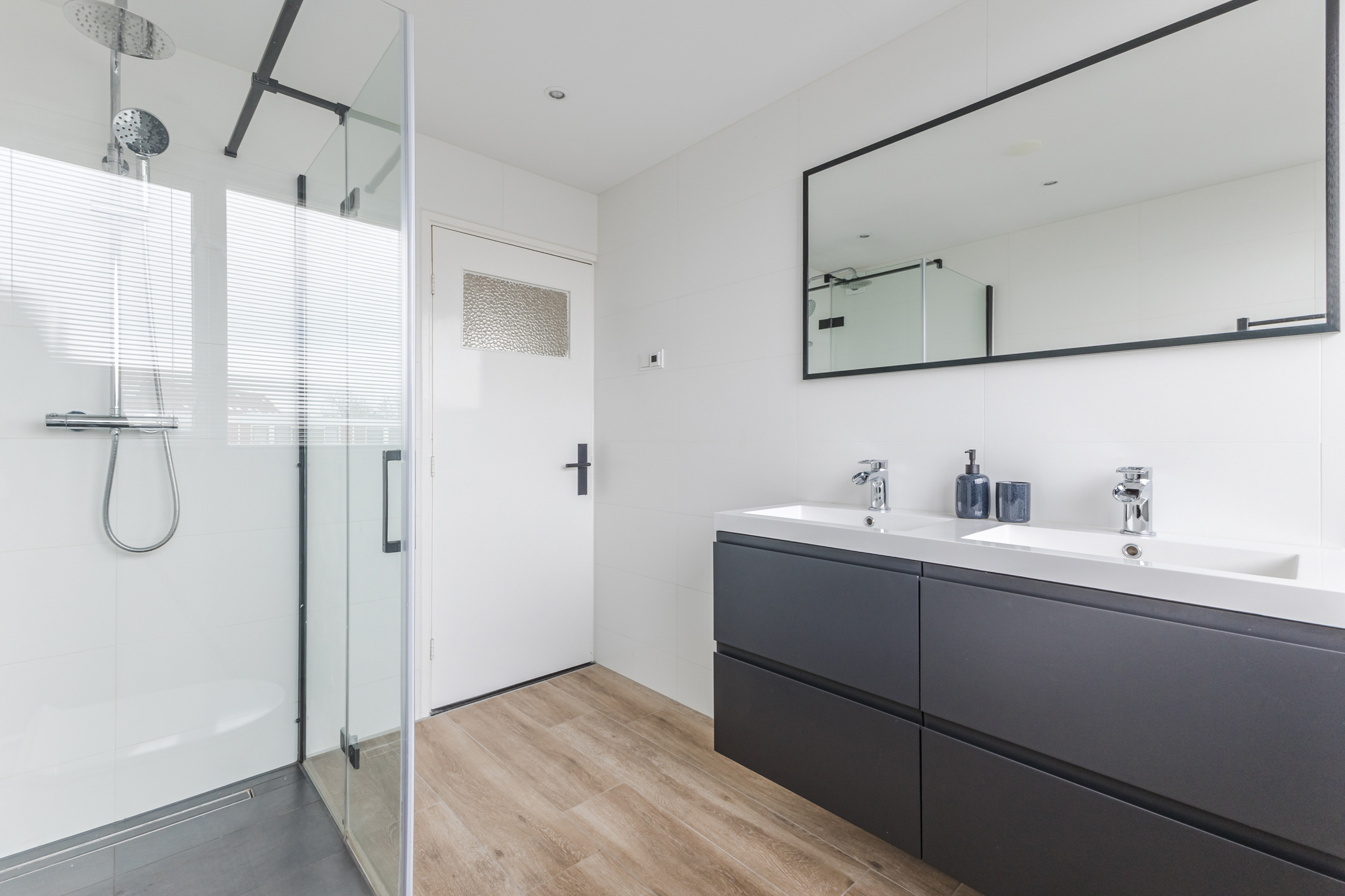 Via de trap in de hal bereiken we de overloop van de eerste verdieping met drie keurig afgewerkte slaapkamers, een apart washok/berging en de luxe badkamer met inbouwspots, tweede toilet, dubbele wastafel met meubel en een inloopregendouche.