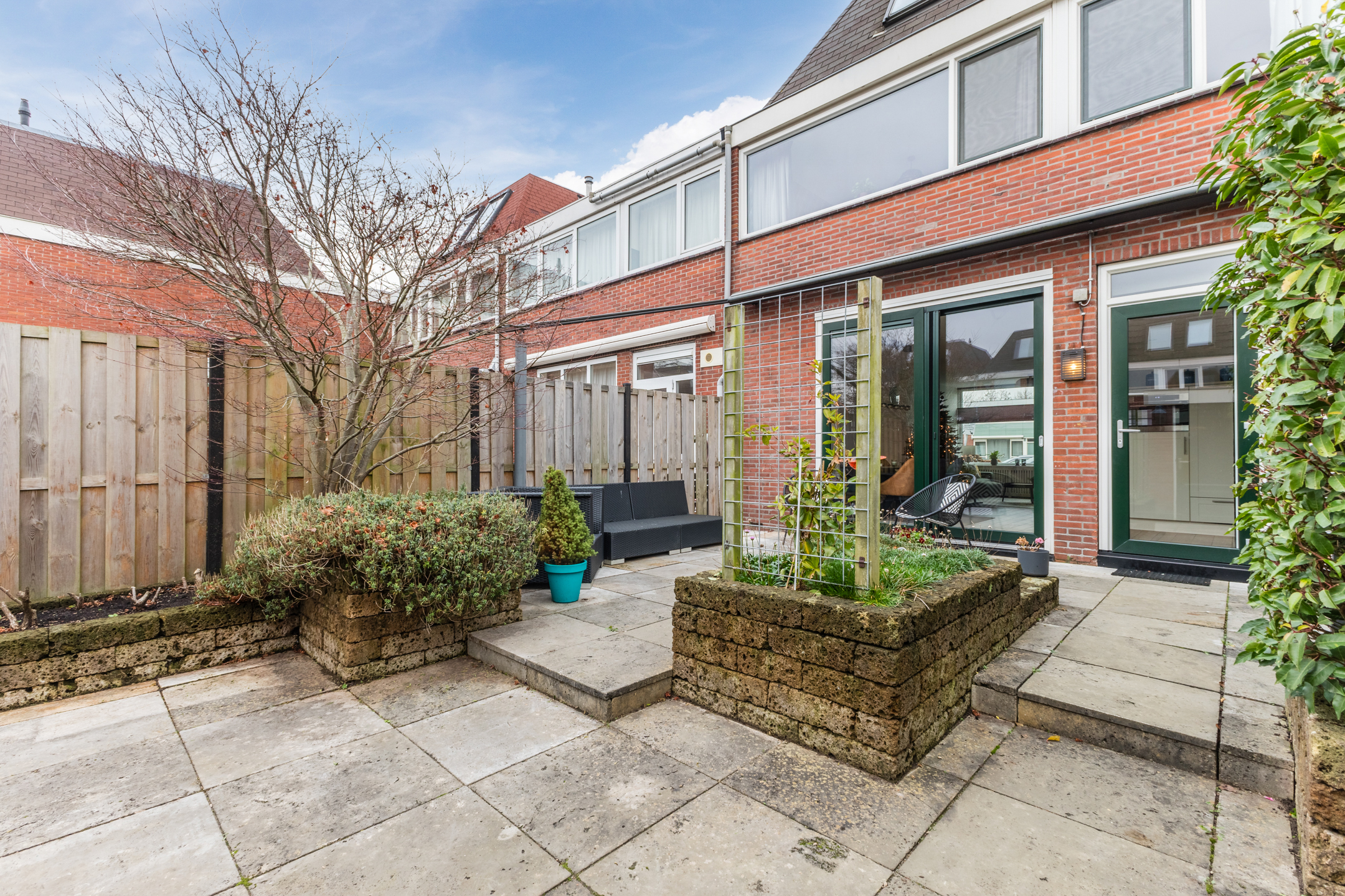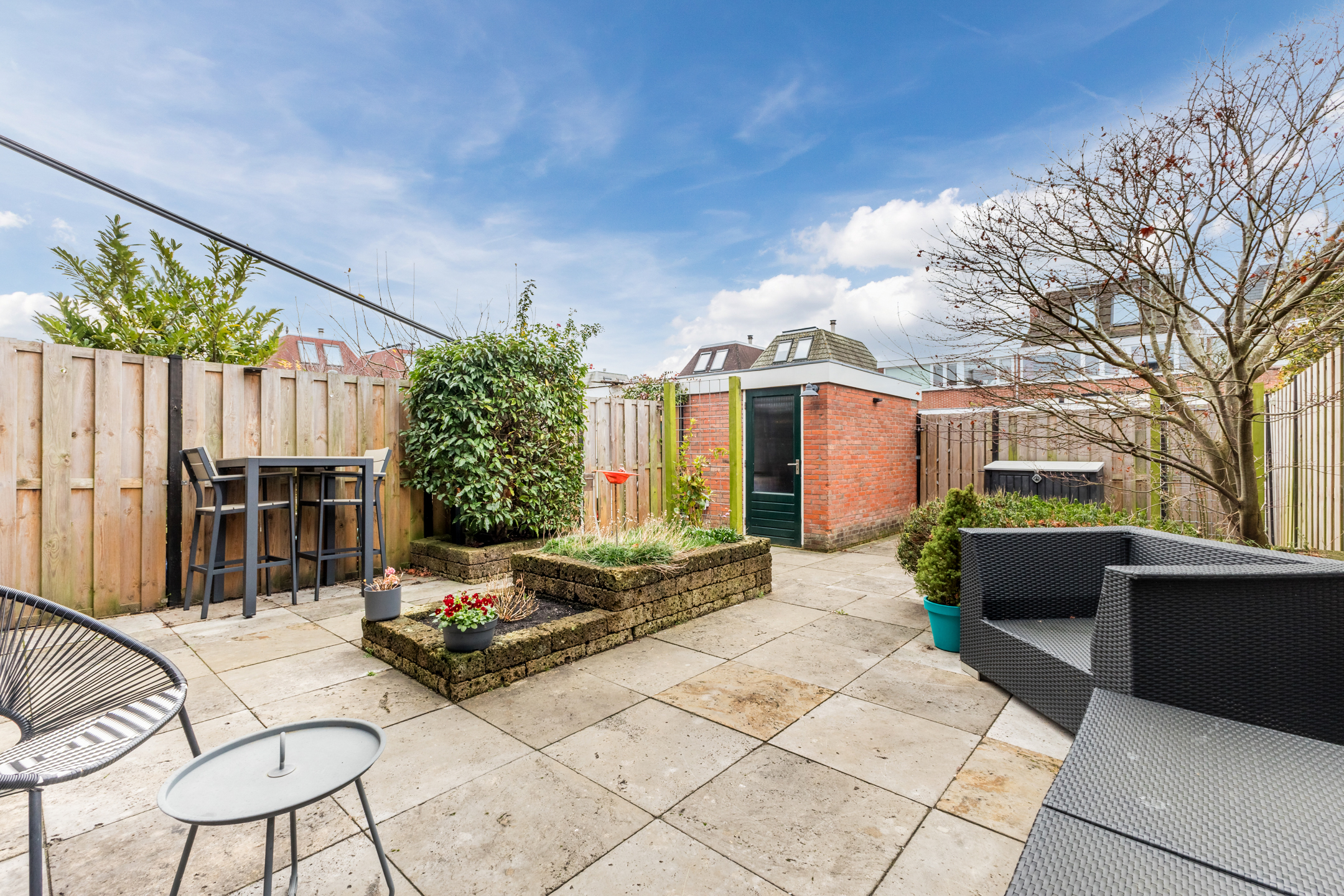 De onderhoudsvriendelijke achtertuin is gelegen op het zuidwesten en beschikt over een ruim terras met afwisselend groene borders. Achterin de tuin staat een handige stenen berging met elektriciteit. De tuin is omsloten door een degelijke houten schutting en beschikt over een achterom.