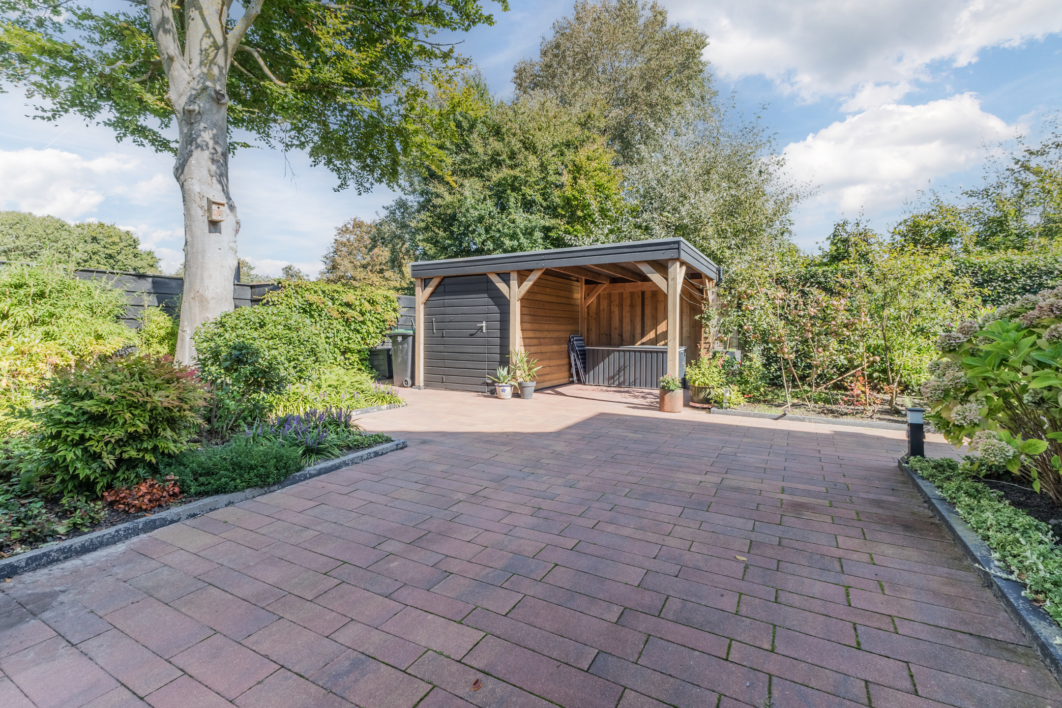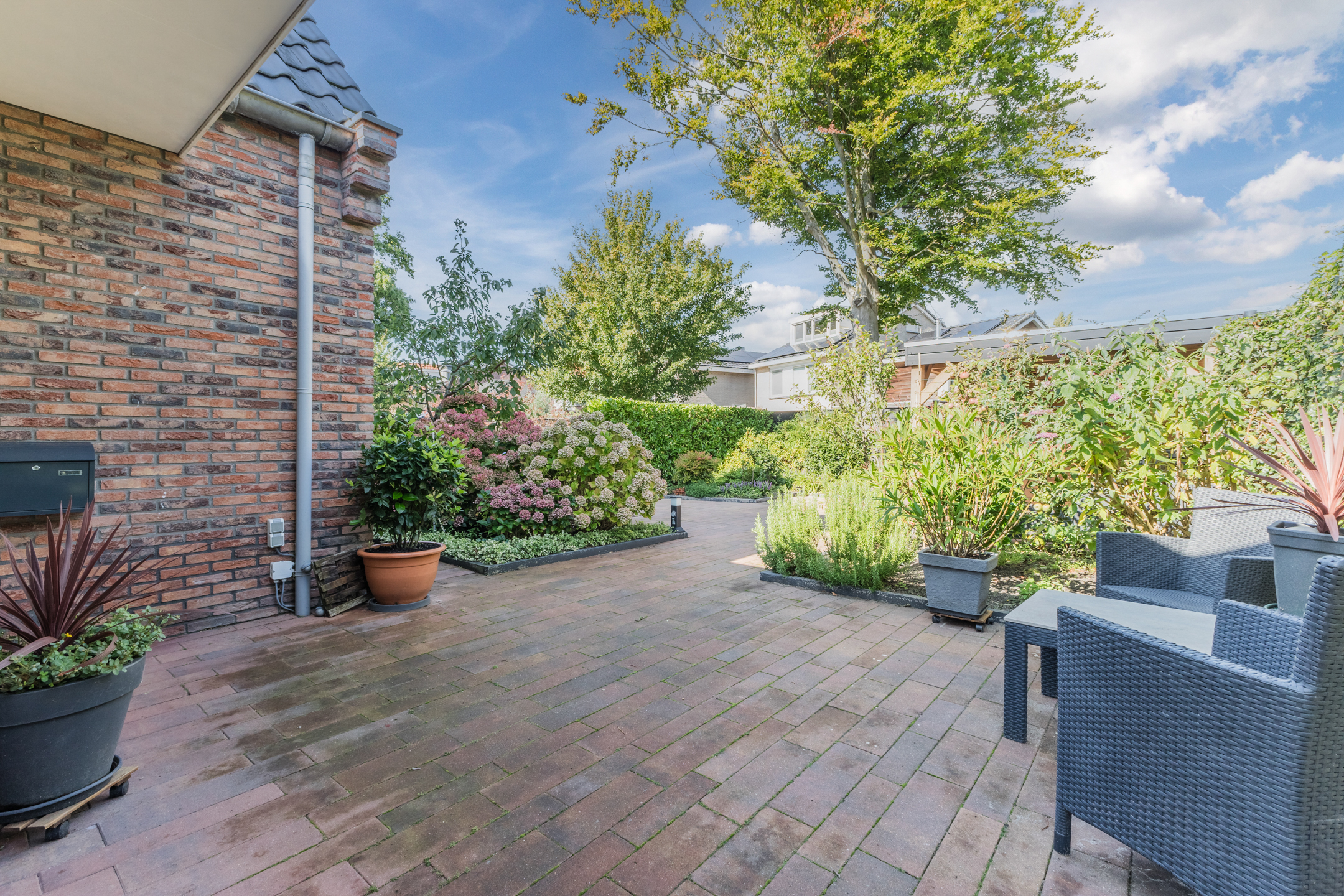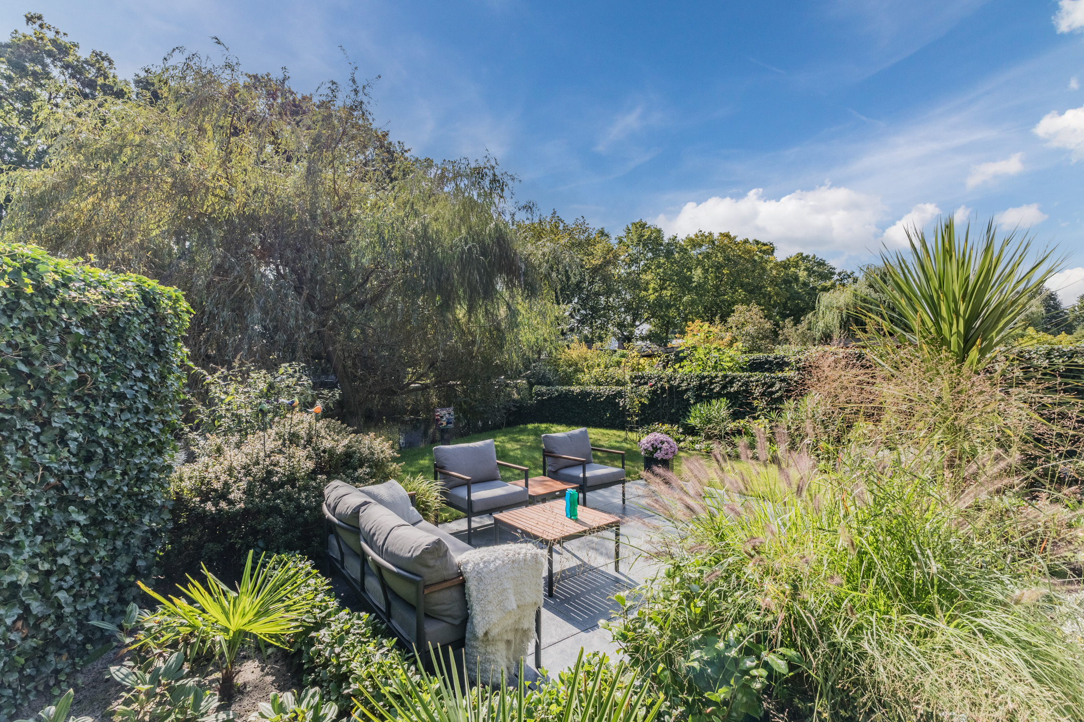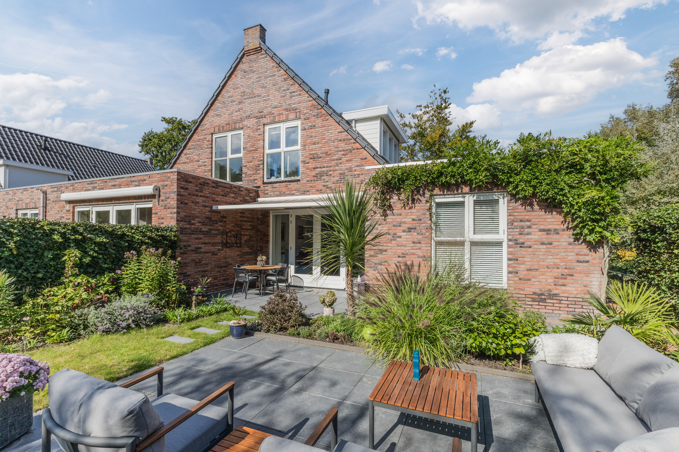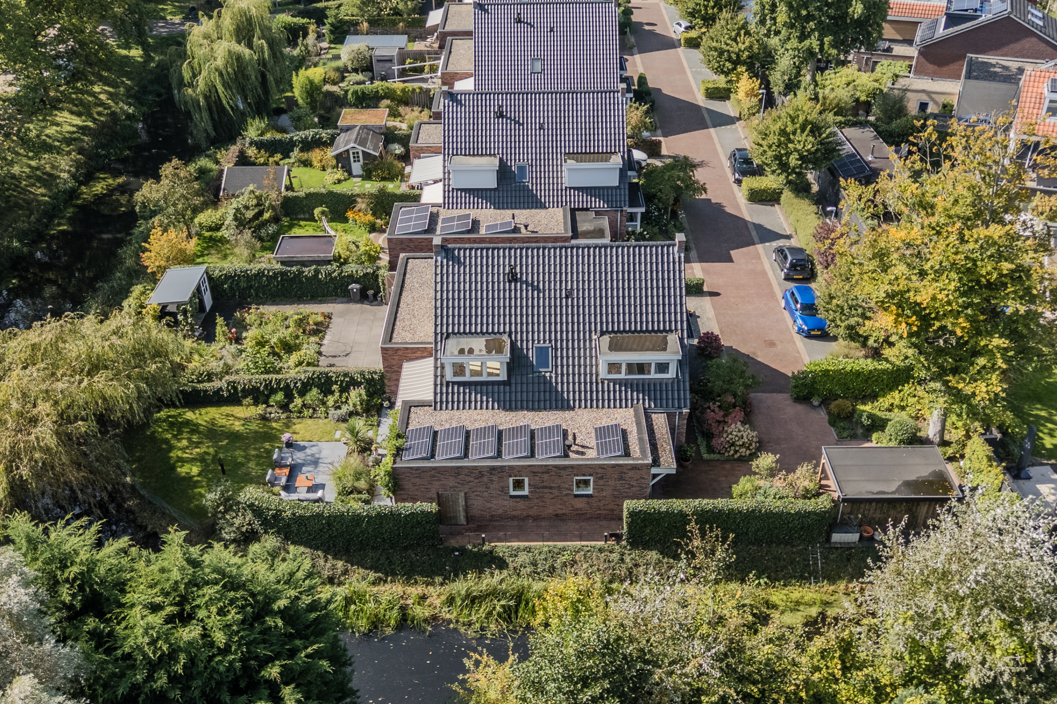 De woning is gelegen op een ruim hoekperceel met een grote tuin op het zuidoosten. De tuin is fraai aangelegd met direct achter het huis een groot betegeld terras met zonnescherm dat wordt omlijst door fraaie groene borders en een groot grasveld met oever aan de waterkant. Omdat de woning grenst aan breed water met aan de overkant een groenstrook, is de tuin heerlijk rustig en privƩ. In de voortuin is een fijne berging met overkapping aanwezig.