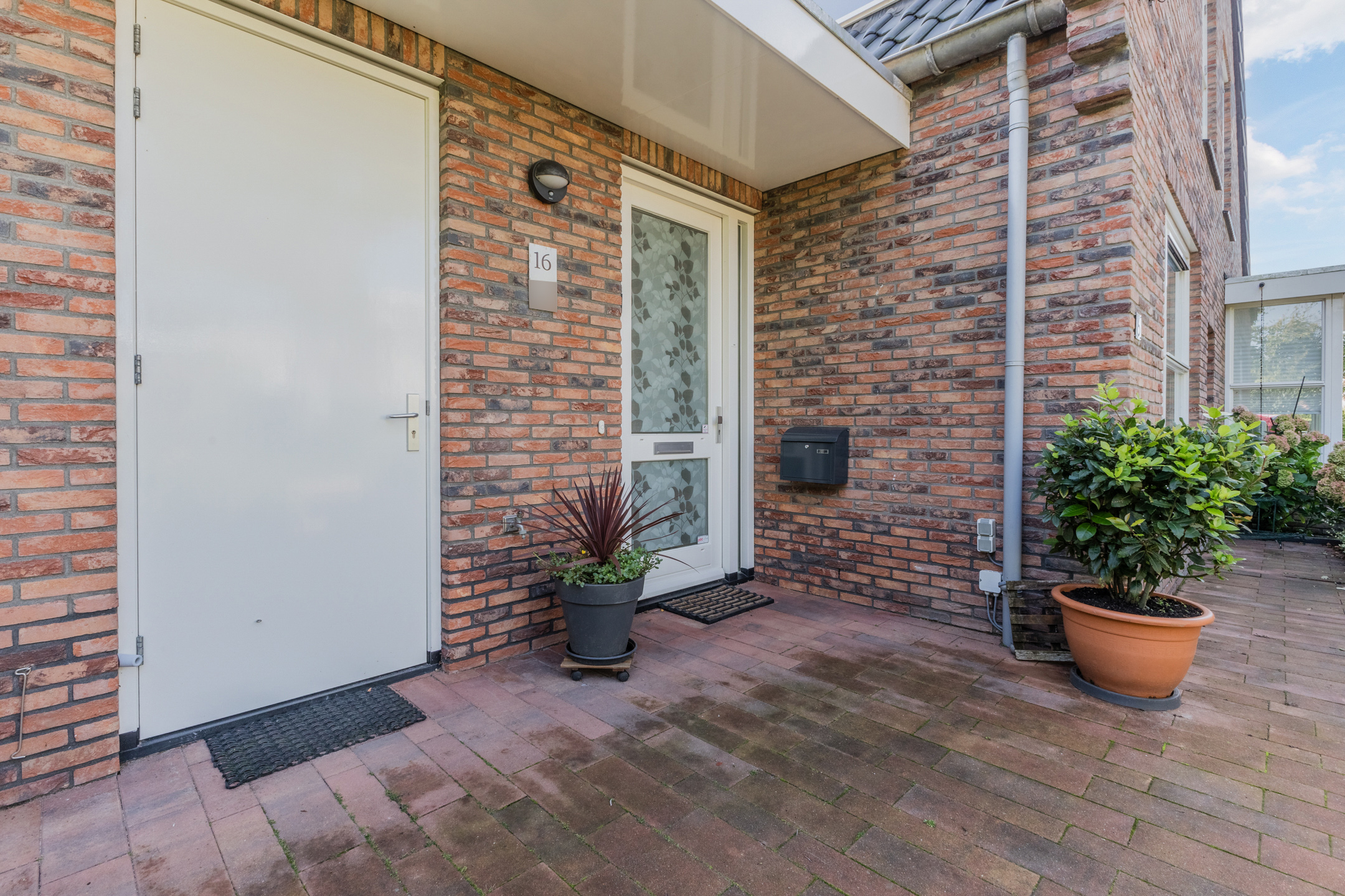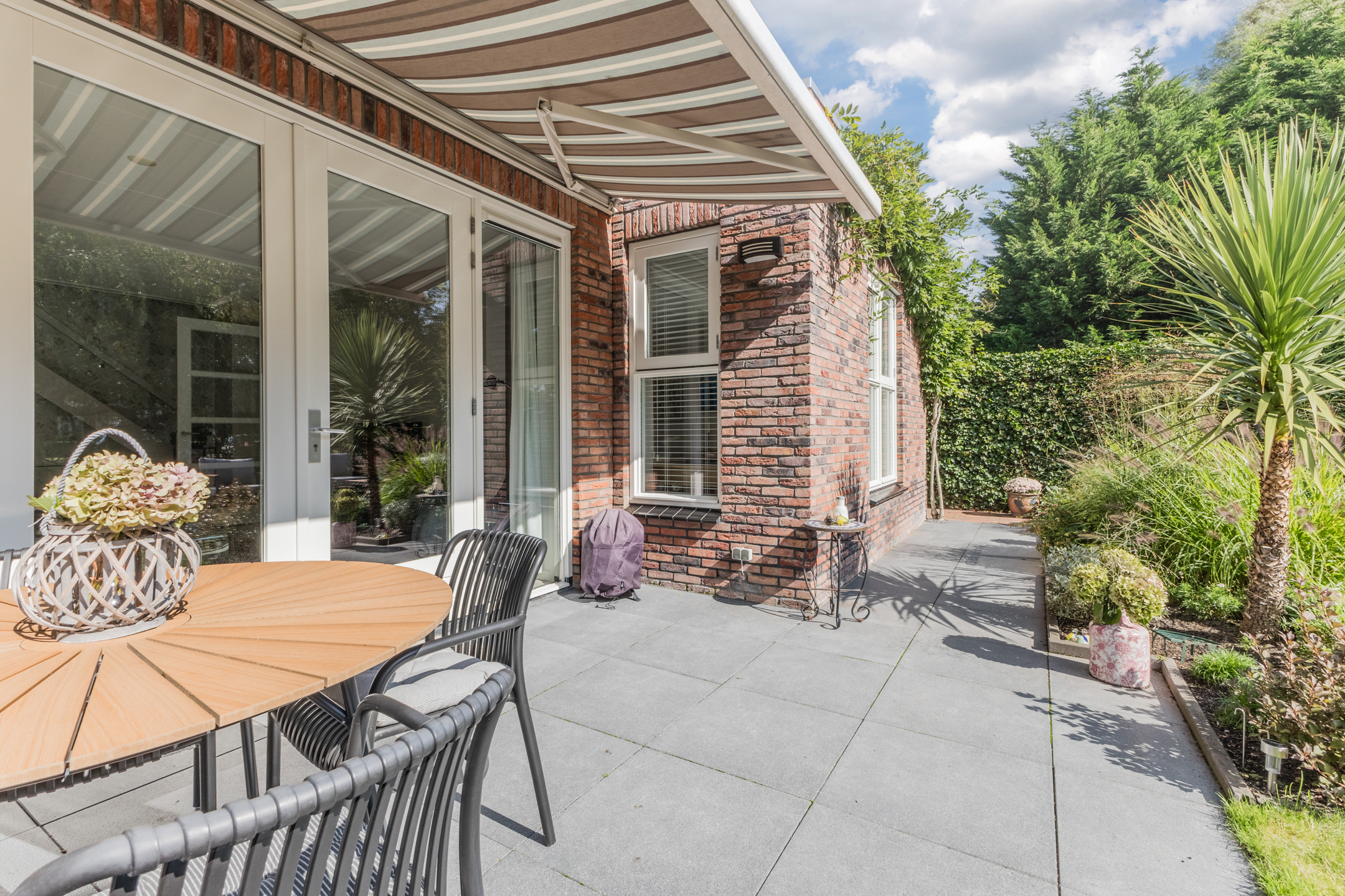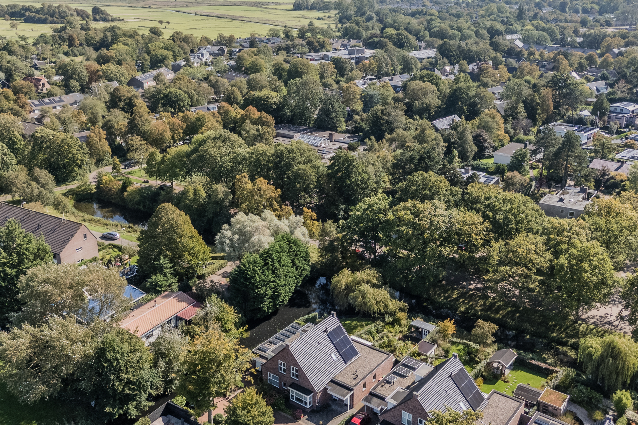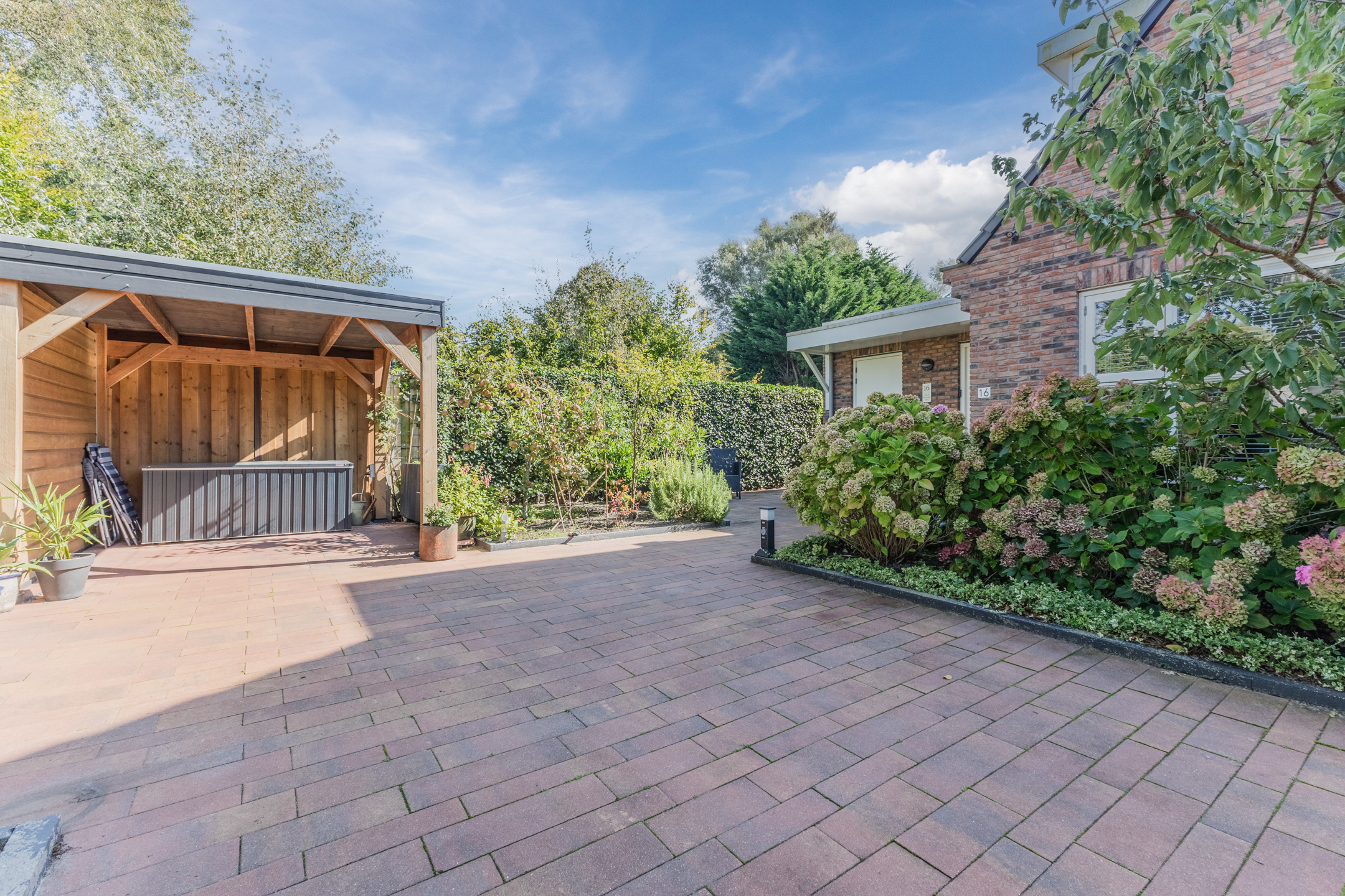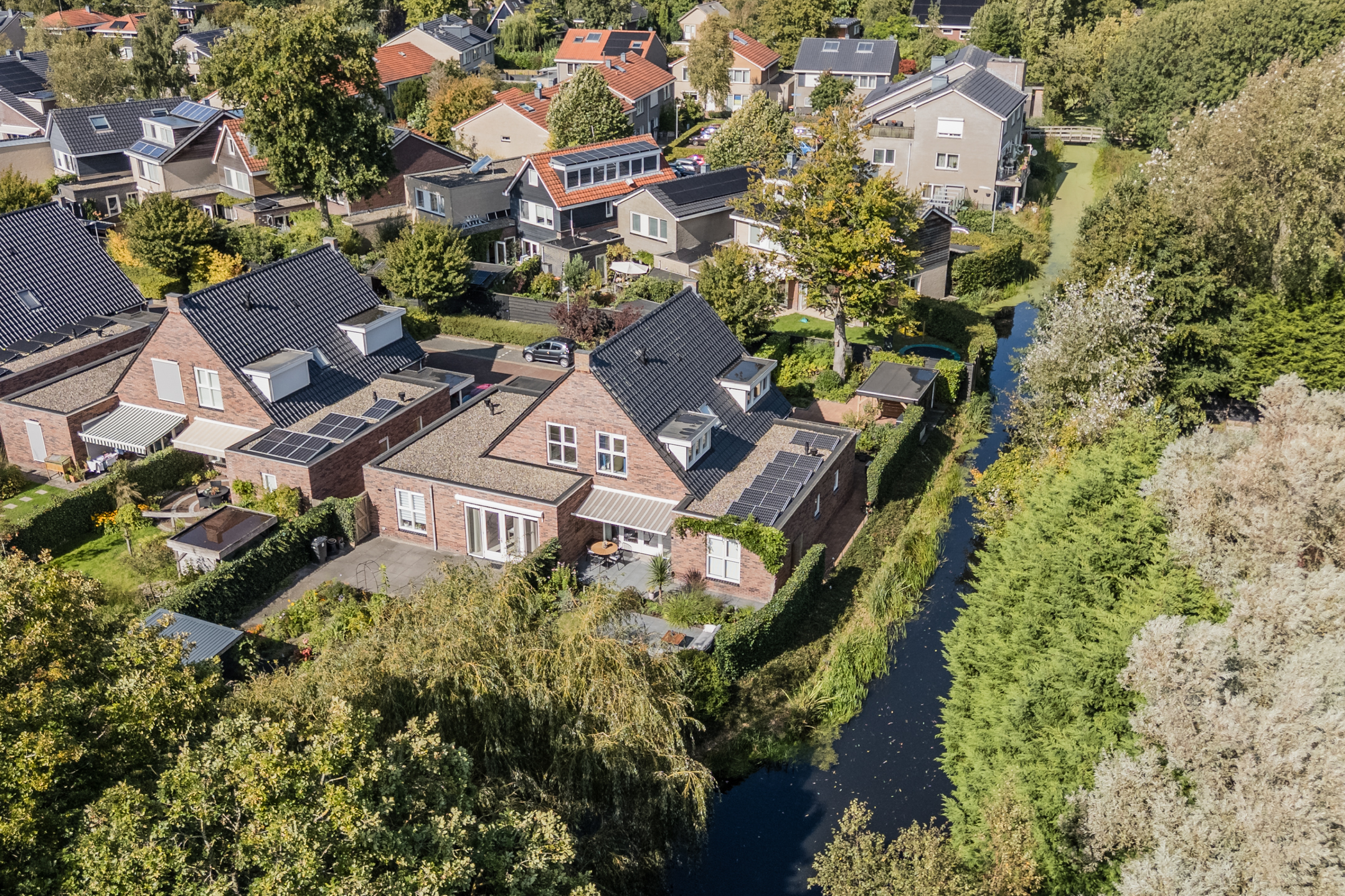 De woning is gelegen op een ruim hoekperceel met een grote tuin op het zuidoosten. De tuin is fraai aangelegd met direct achter het huis een groot betegeld terras met zonnescherm dat wordt omlijst door fraaie groene borders en een groot grasveld met oever aan de waterkant. Omdat de woning grenst aan breed water met aan de overkant een groenstrook, is de tuin heerlijk rustig en privƩ. In de voortuin is een fijne berging met overkapping aanwezig.