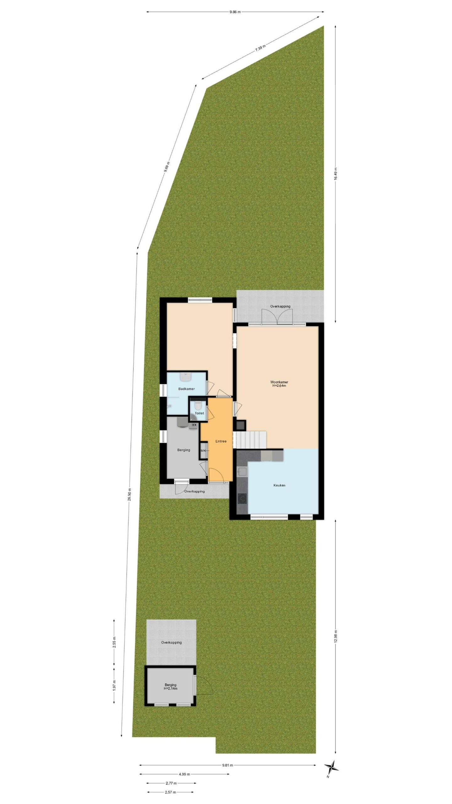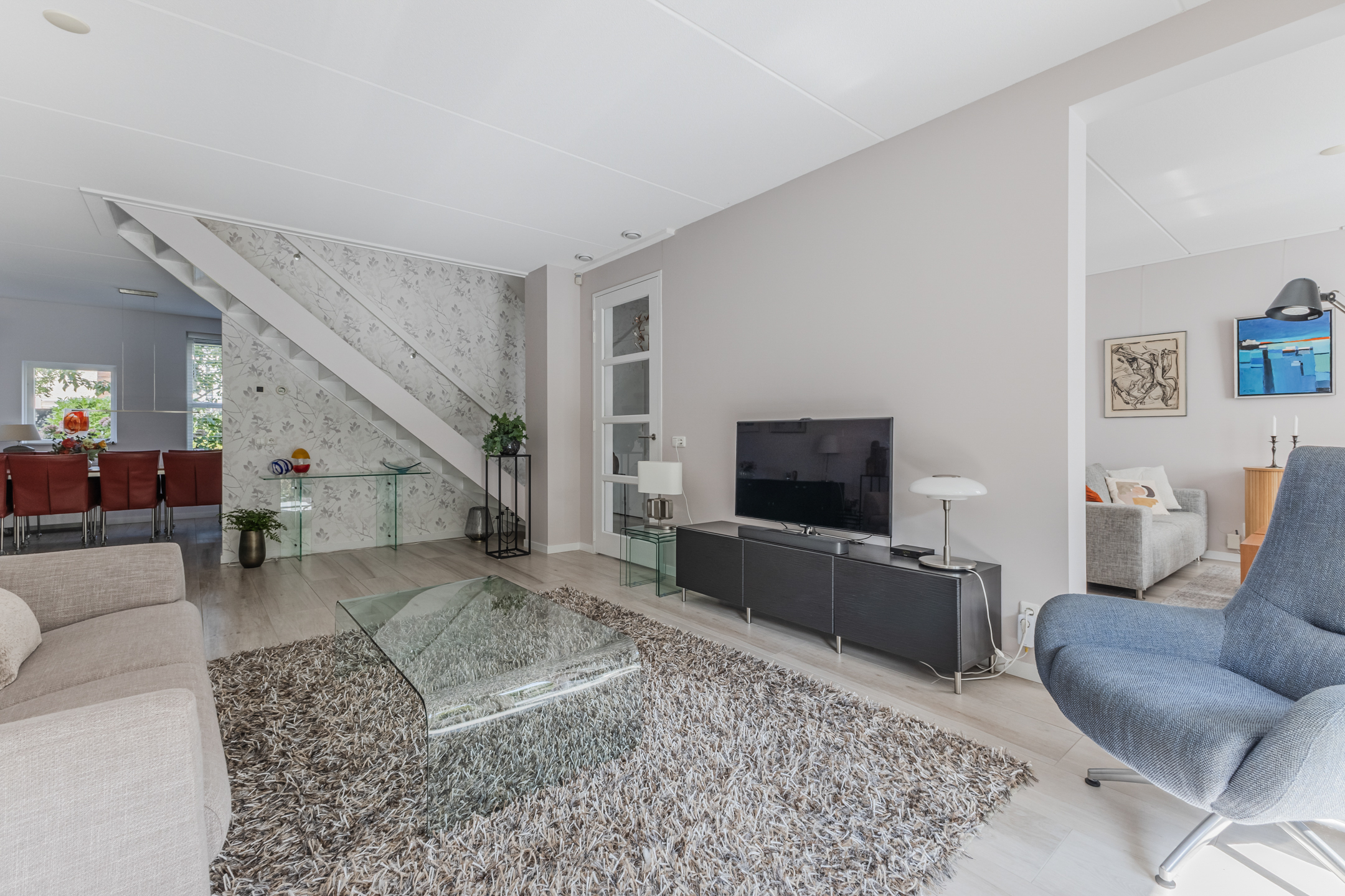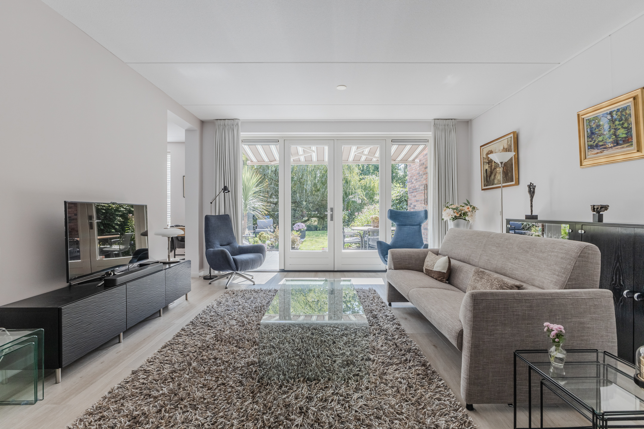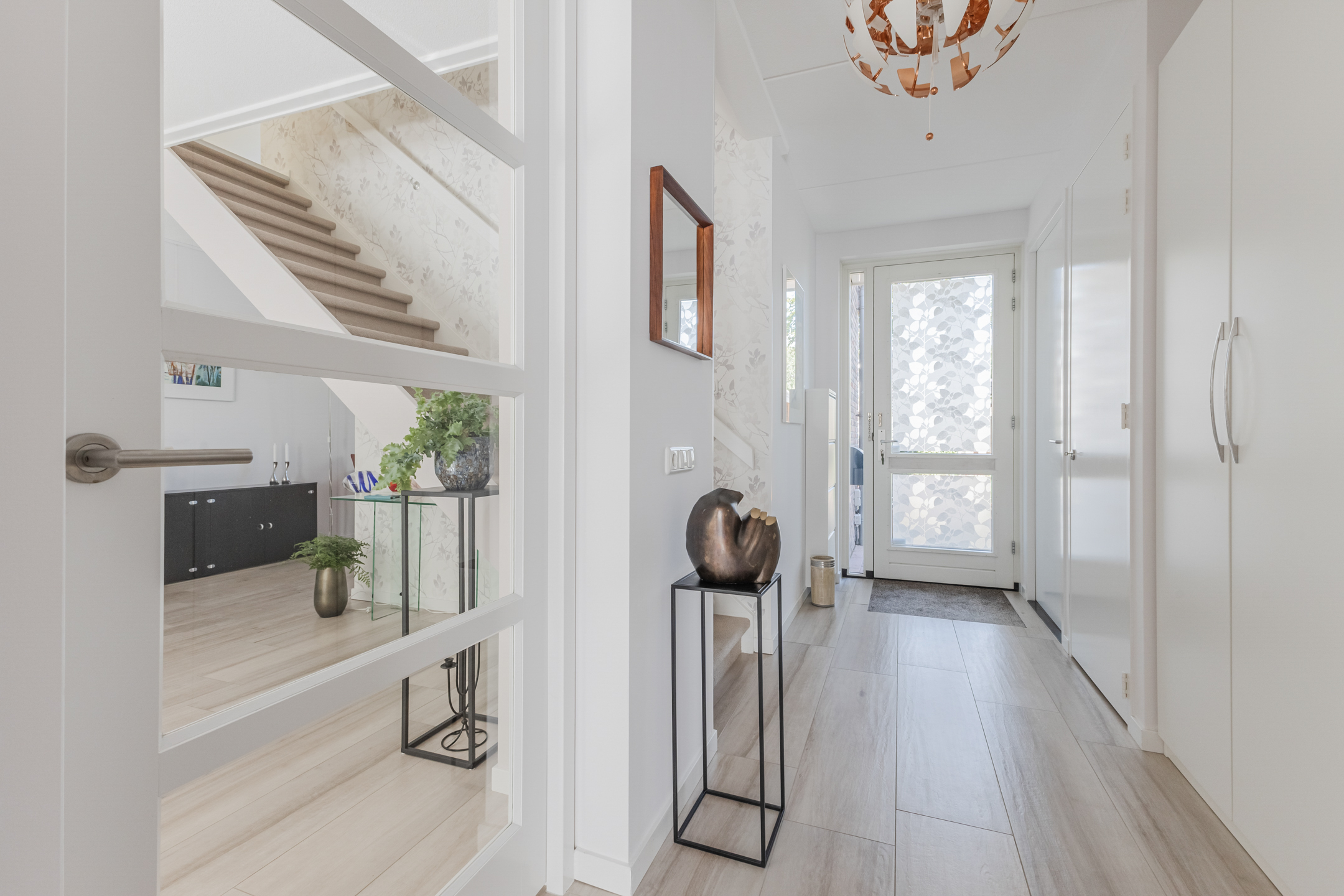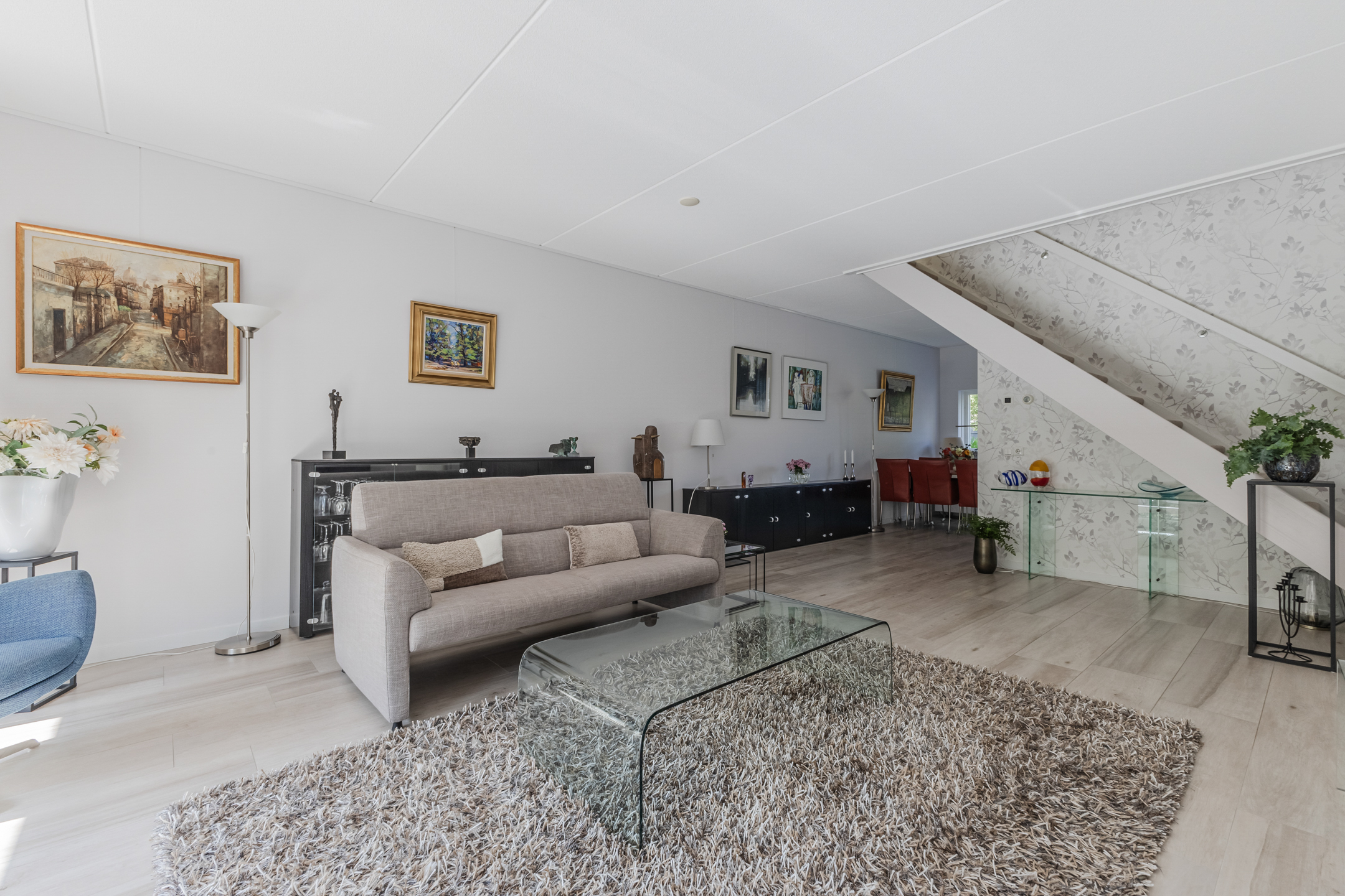 De woning is gelegen op een ruim hoekperceel met een grote tuin op het zuidoosten. De tuin is fraai aangelegd met direct achter het huis een groot betegeld terras met zonnescherm dat wordt omlijst door fraaie groene borders en een groot grasveld met oever aan de waterkant. Omdat de woning grenst aan breed water met aan de overkant een groenstrook, is de tuin heerlijk rustig en privƩ. In de voortuin is een fijne berging met overkapping aanwezig.