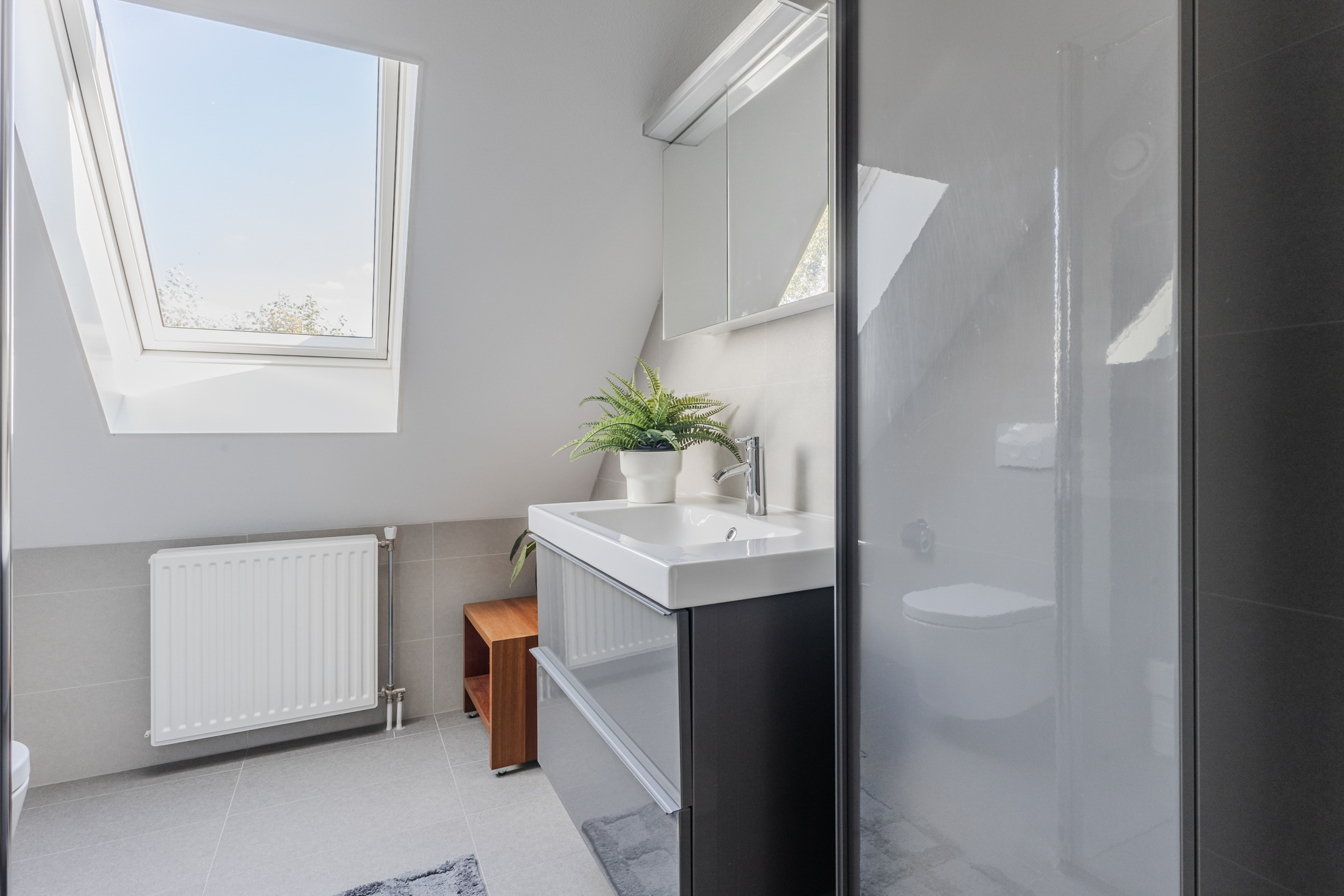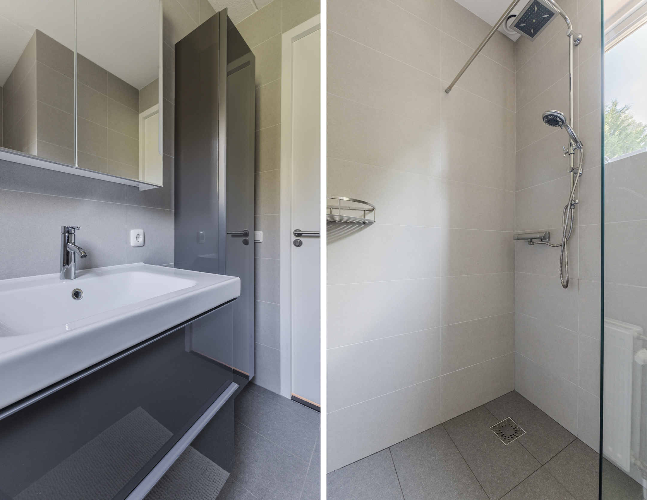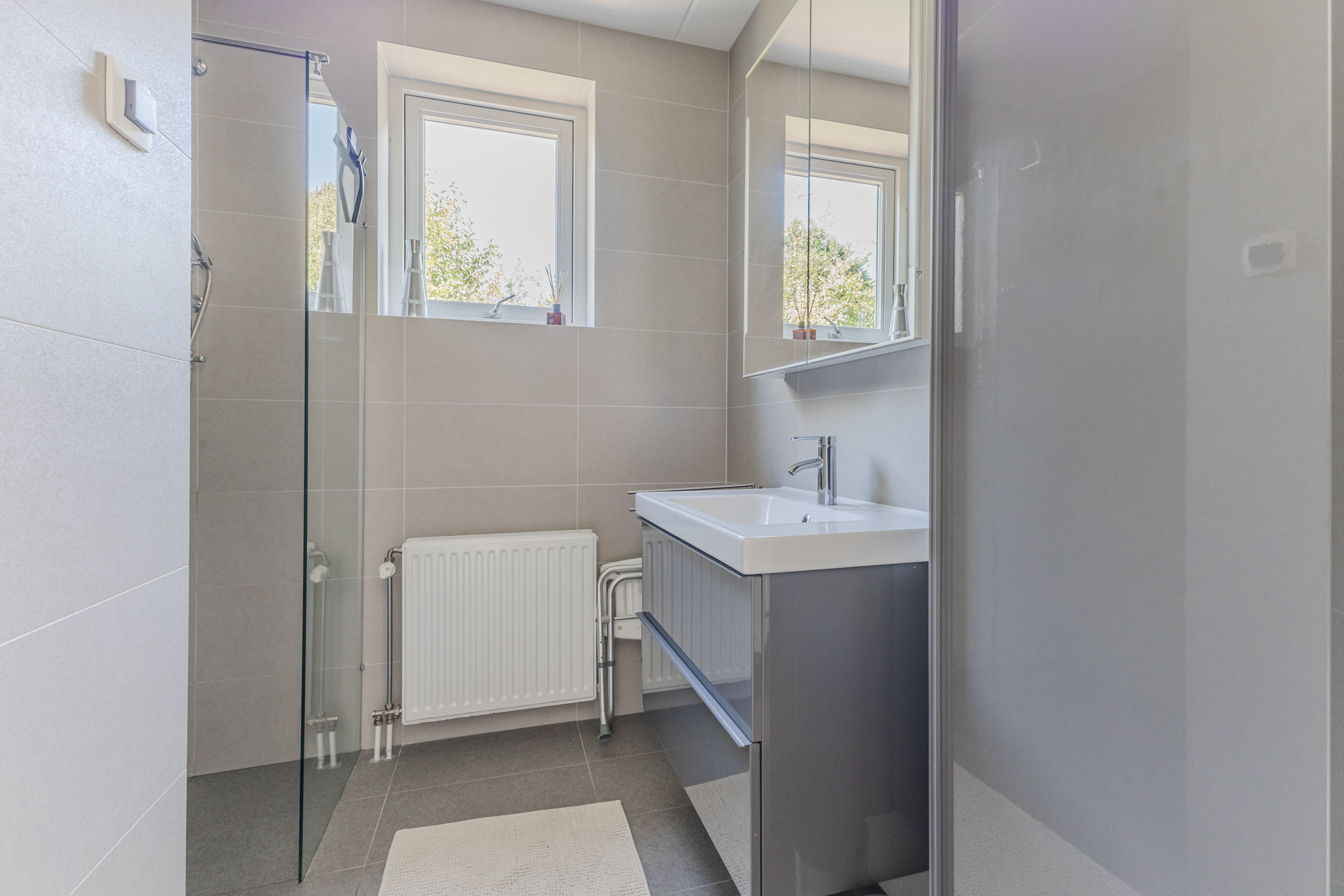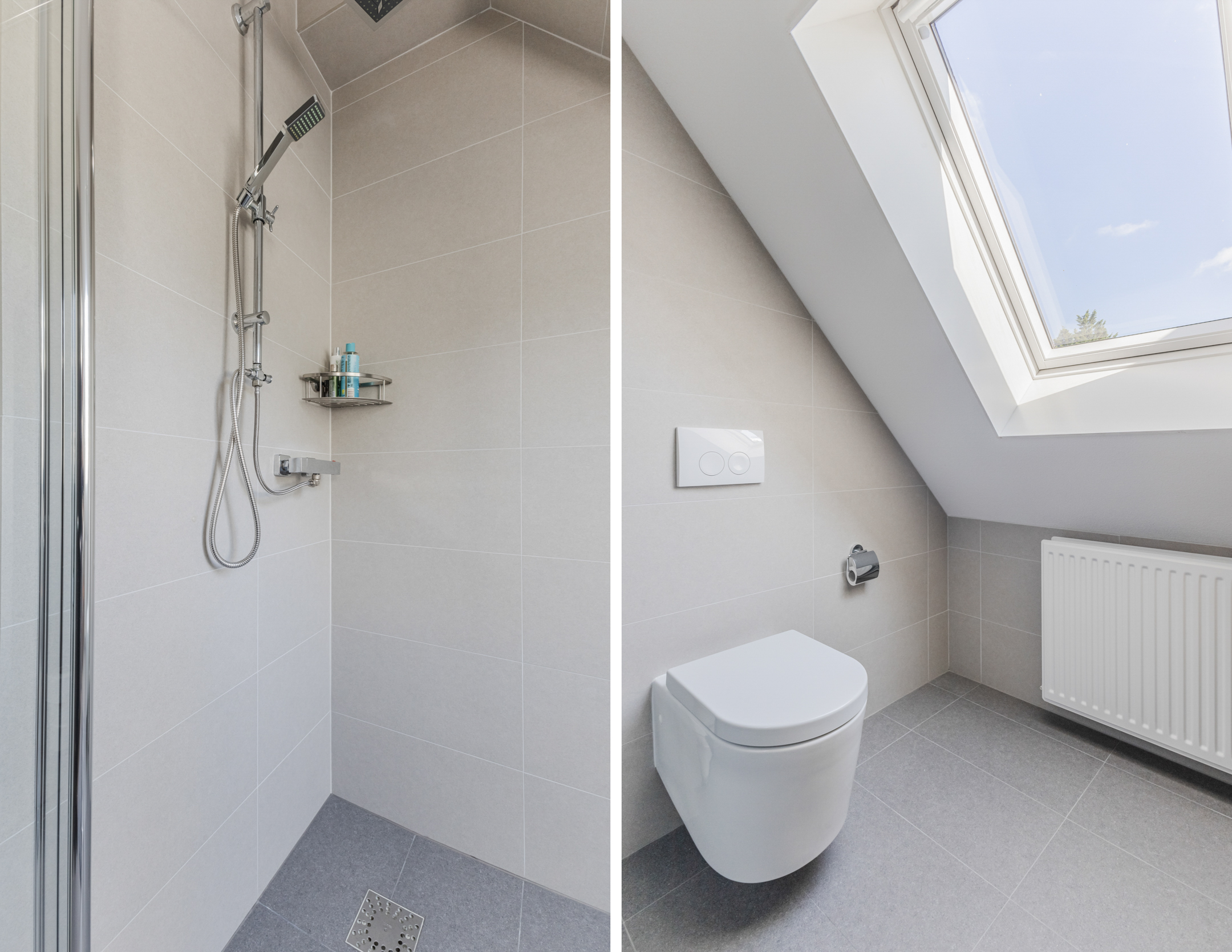 Vanaf de overloop is er toegang tot 2 ruime slaapkamers en tot de nette en complete badkamer met zwevend toilet, wastafel met meubel, inloopdouche en vloerverwarming.