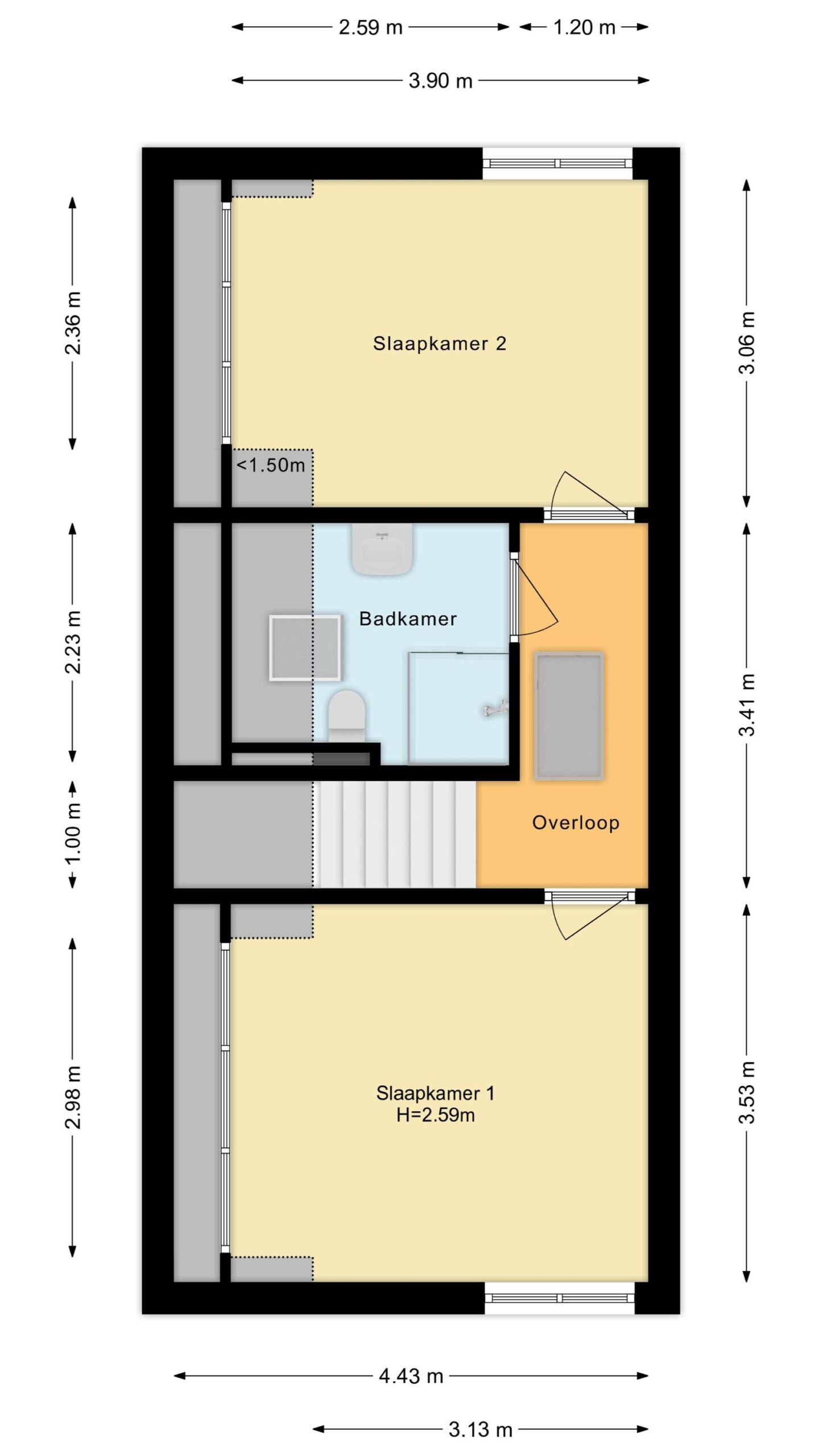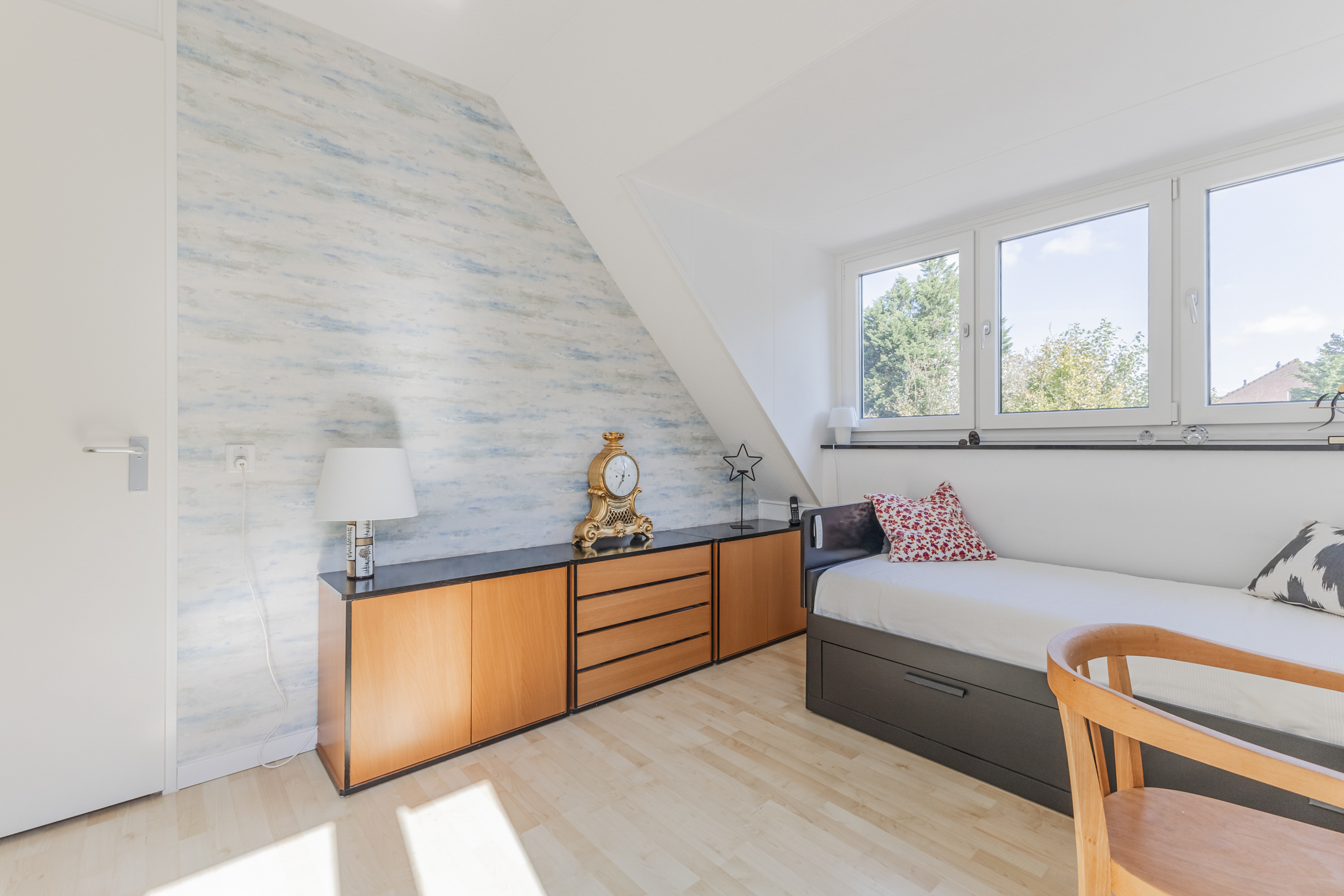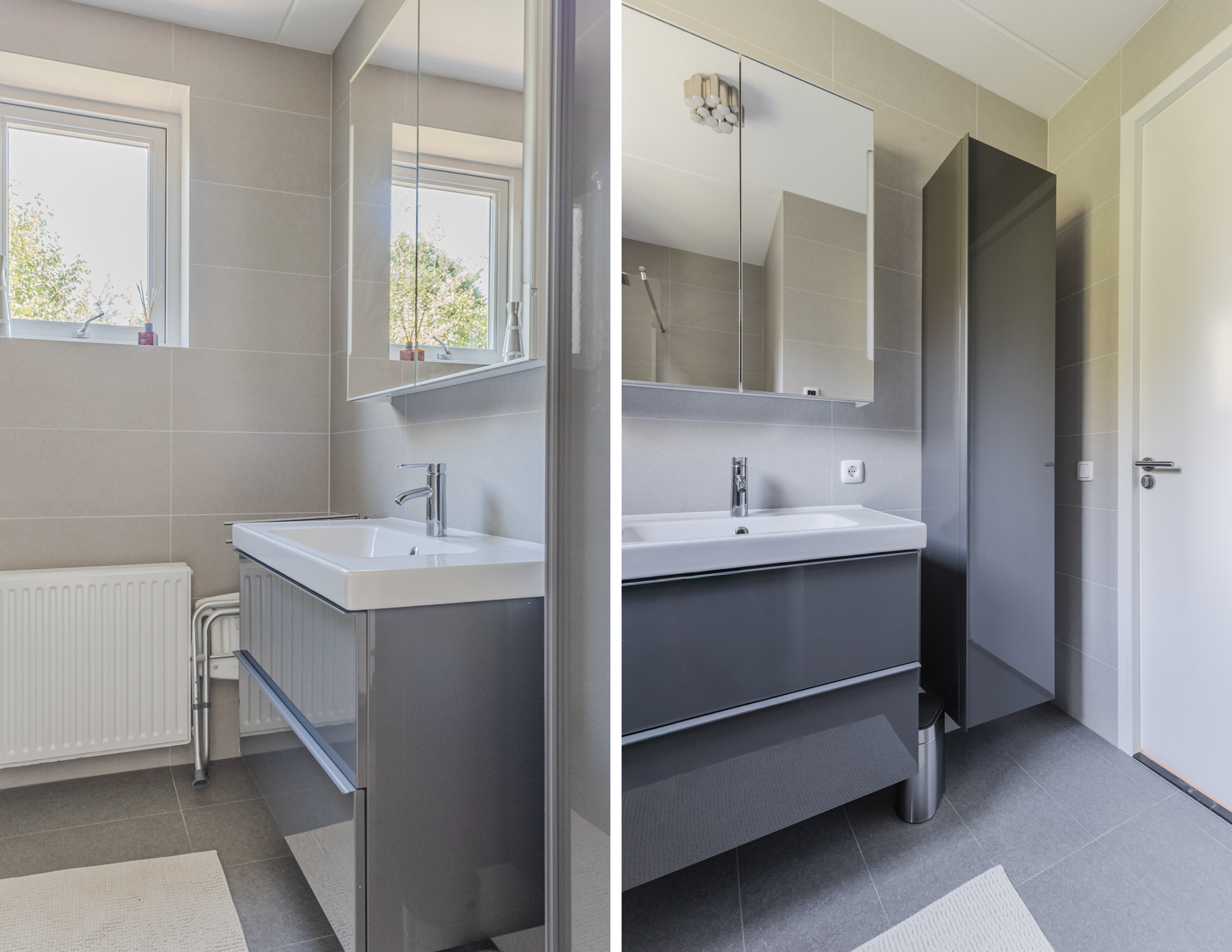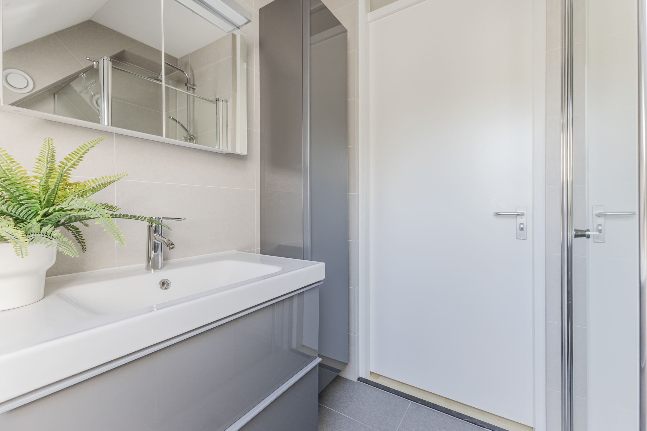 Vanaf de overloop is er toegang tot 2 ruime slaapkamers en tot de nette en complete badkamer met zwevend toilet, wastafel met meubel, inloopdouche en vloerverwarming.