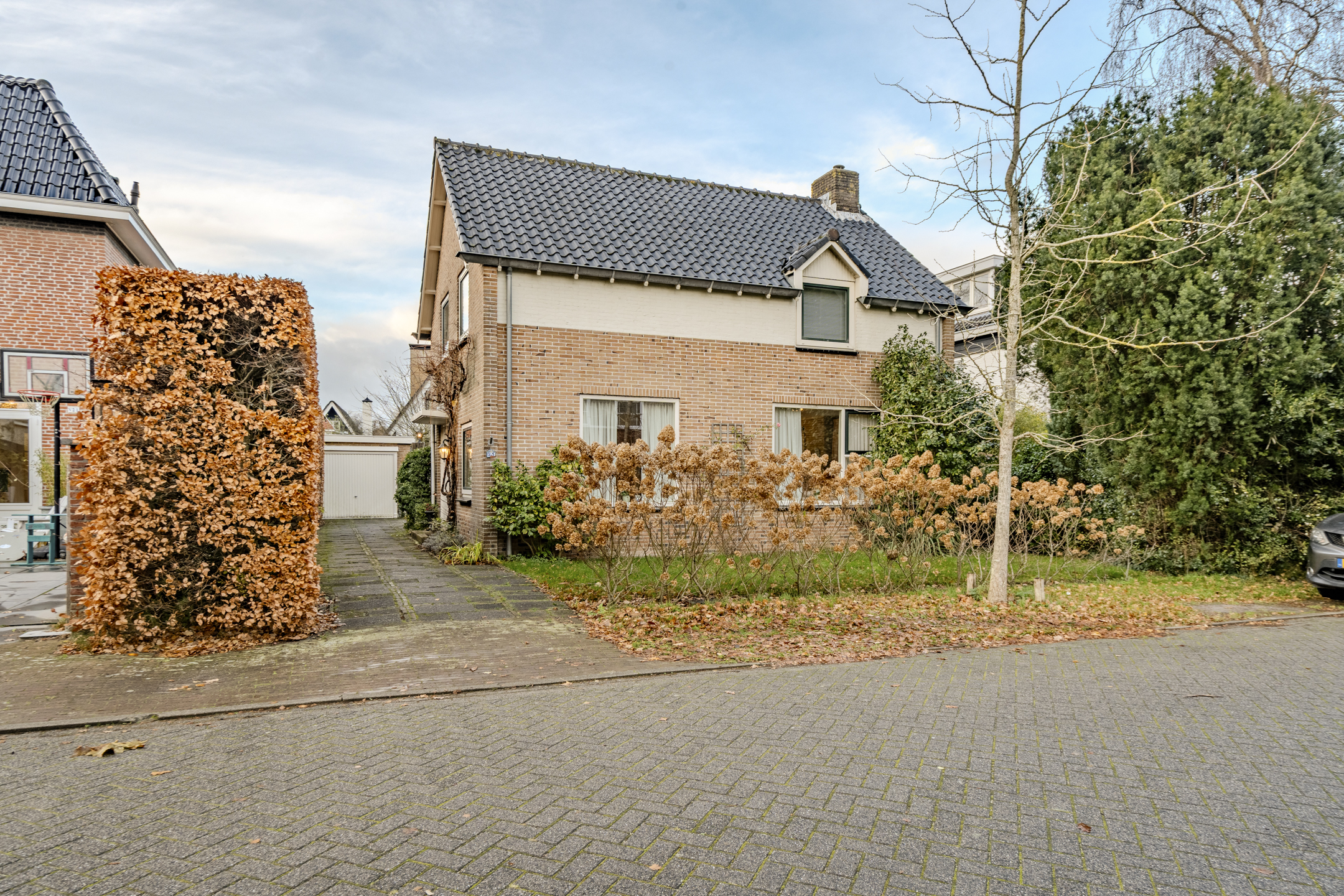 Ruime, voortuin met gras, groene border en oprit richting de garage.