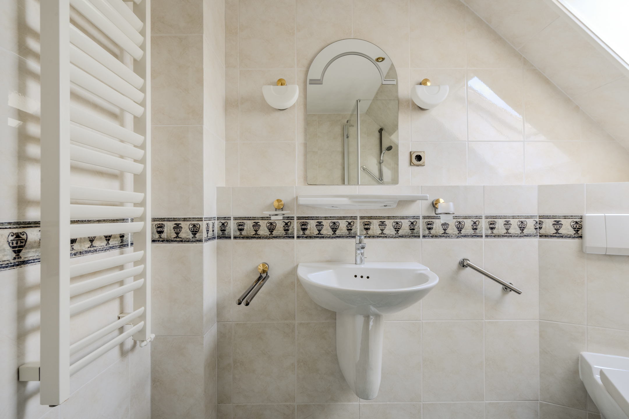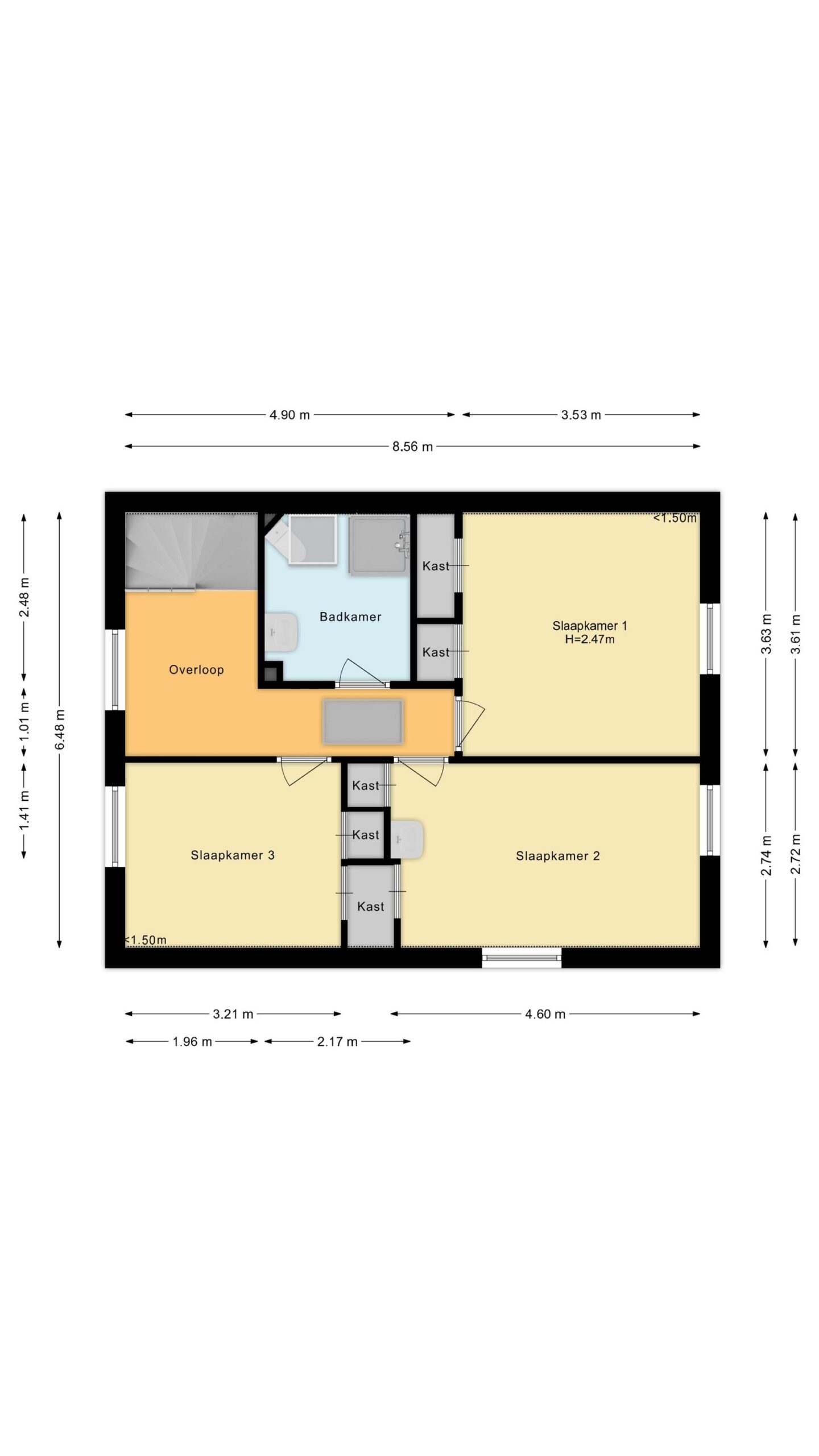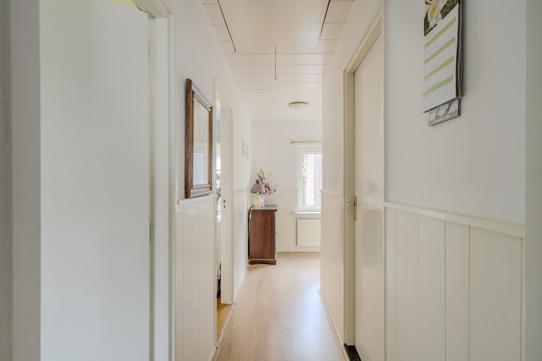 Overloop, 3 slaapkamers en de badkamer. Alle slaapkamers hebben ingebouwde kastruimte en 1 slaapkamer heeft een eigen wastafel. De nette en complete badkamer beschikt over een zwevend toilet, een wastafel en een douchecabine.