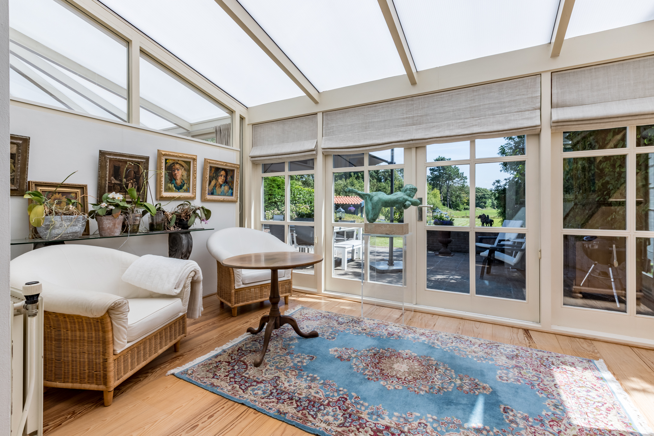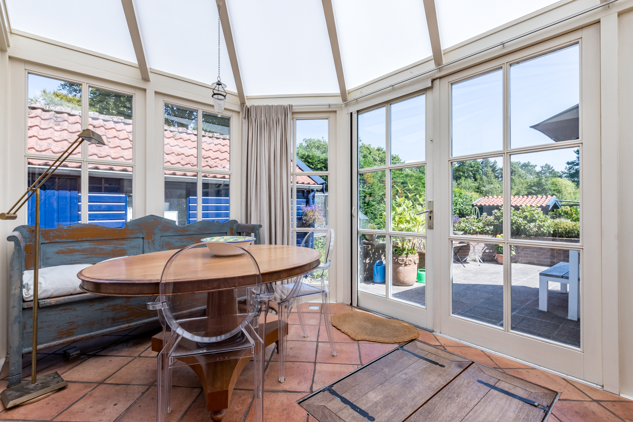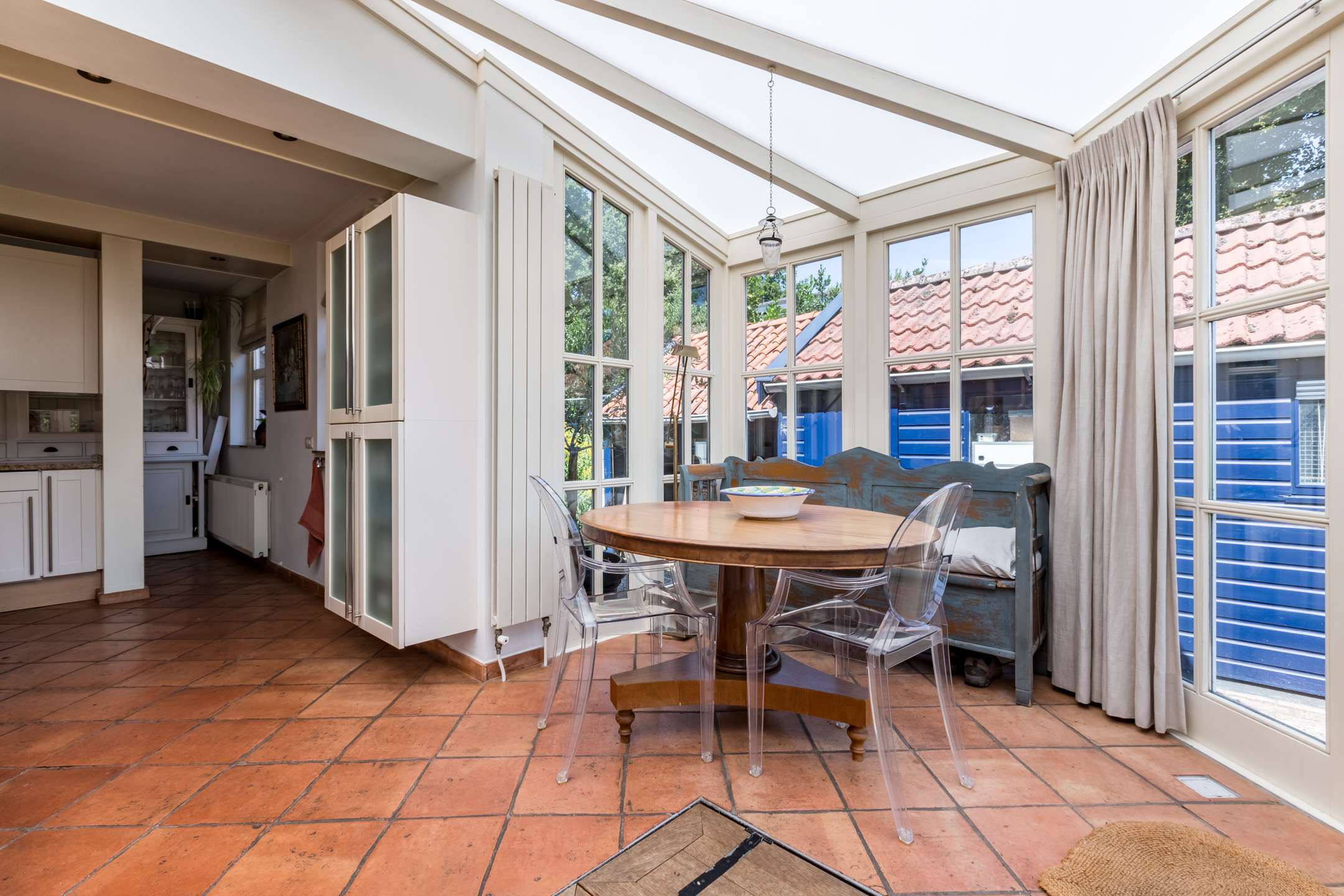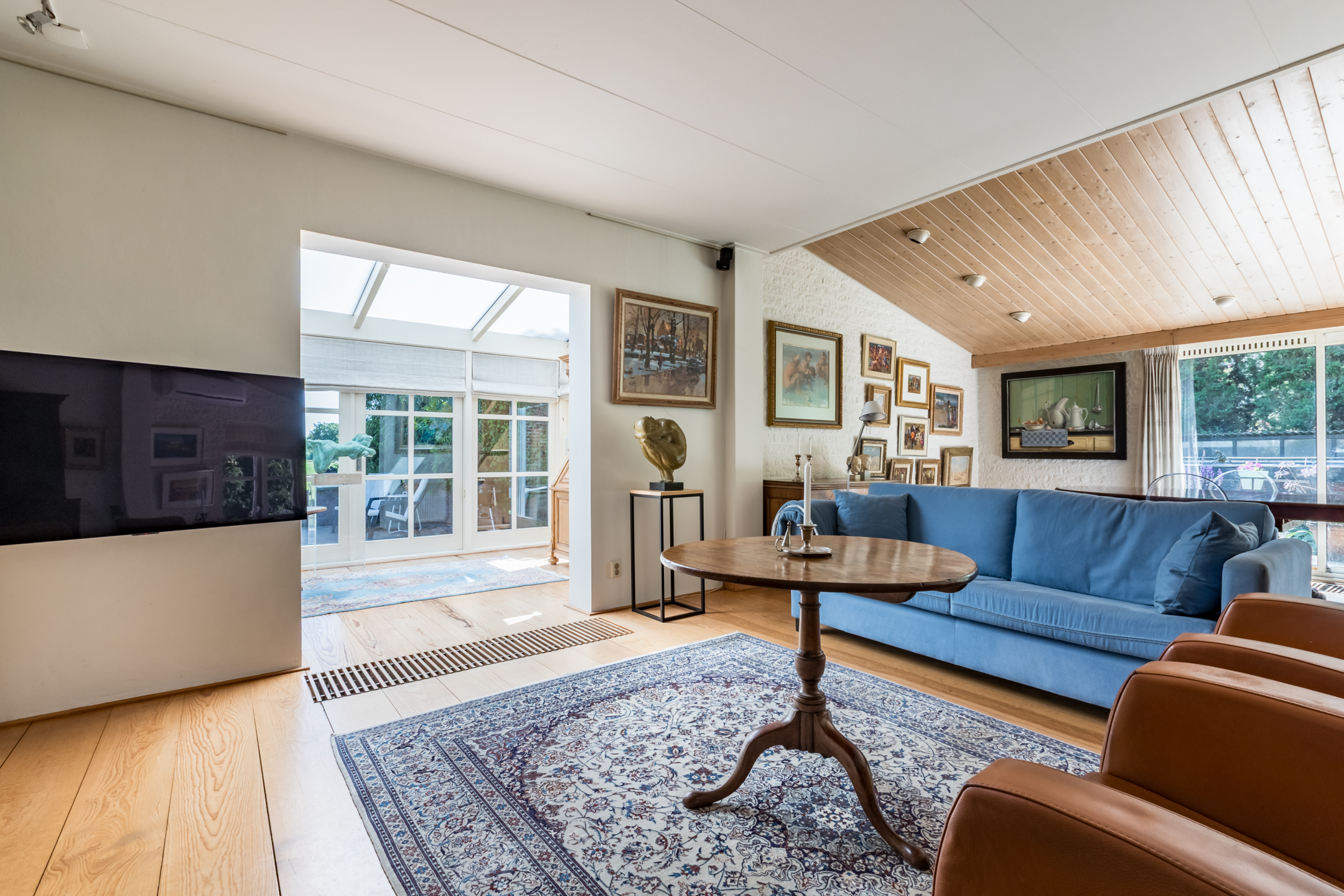 Riante, tuingerichte woonkamer met een houten vloer, grote raampartijen en een schuifpui naar de tuin. Geschakeld aan de woonkamer zit een grote glazen serre met openslaande tuindeuren en een schuifdeur.
