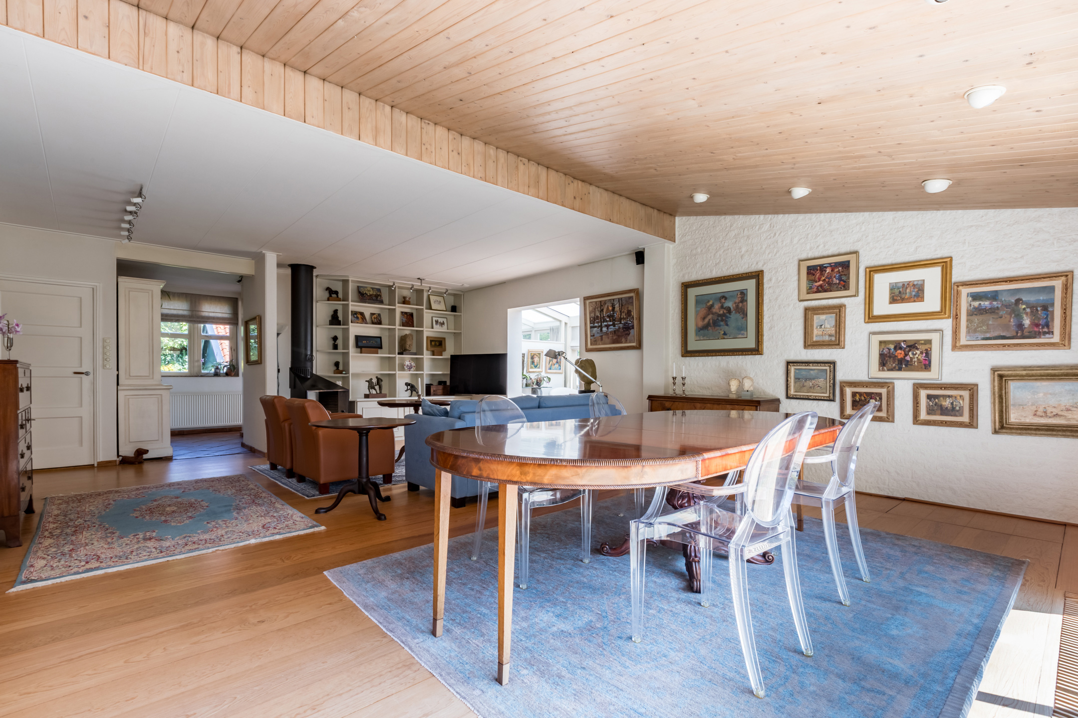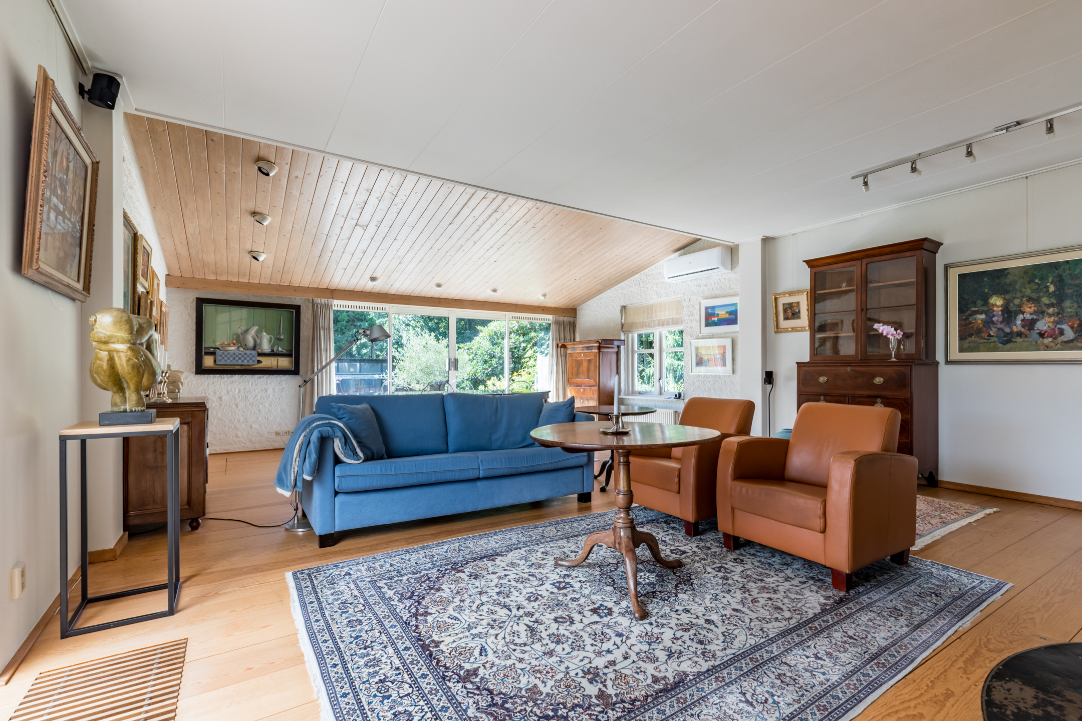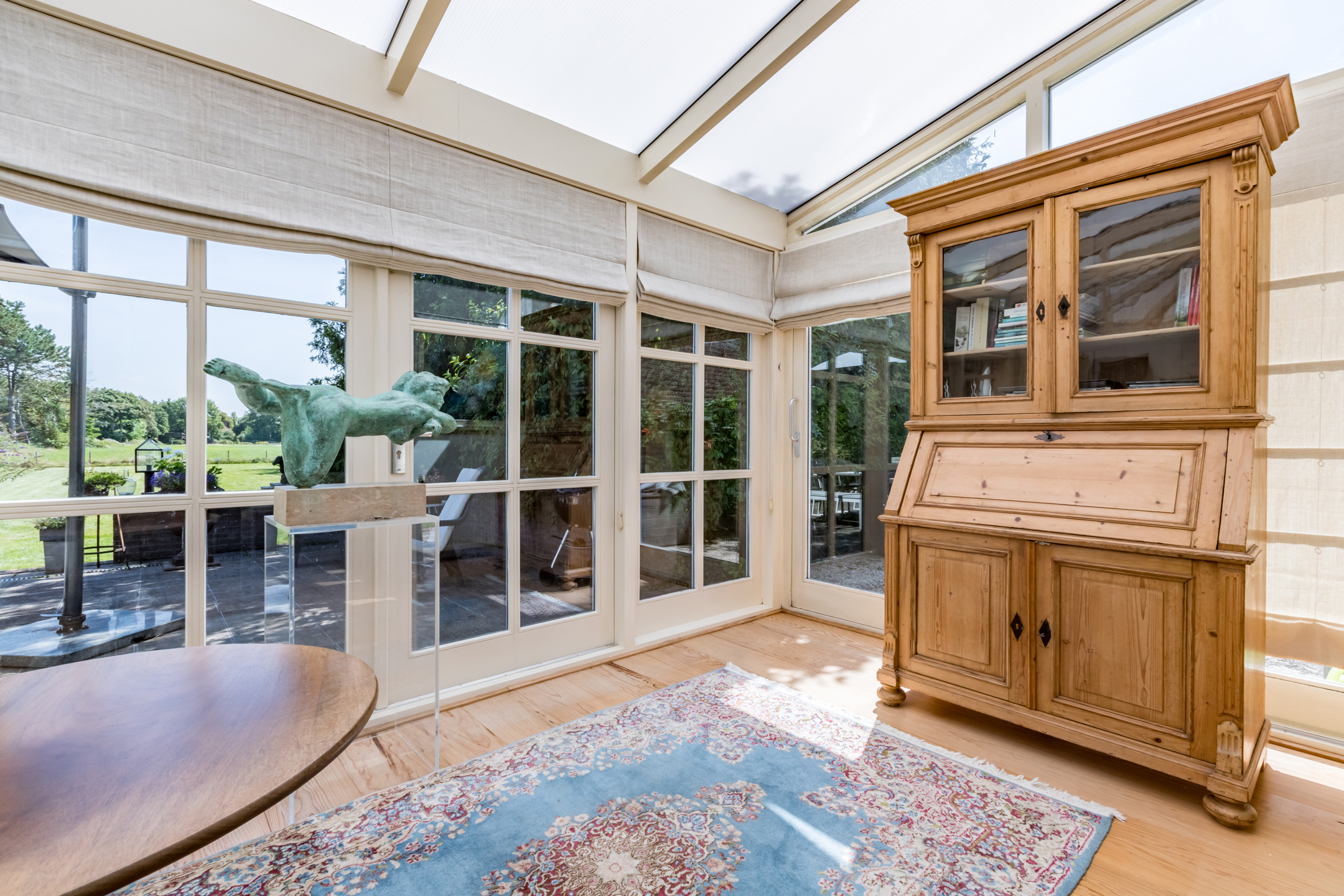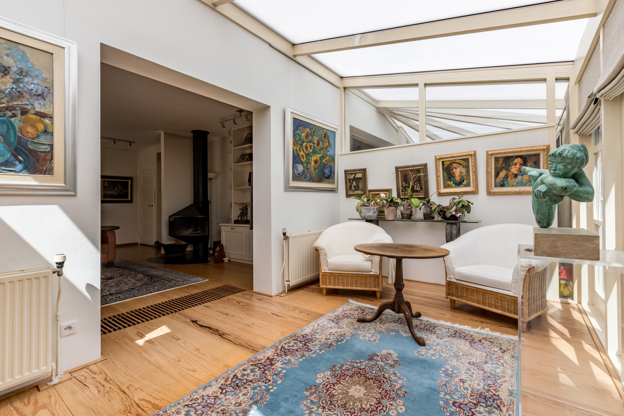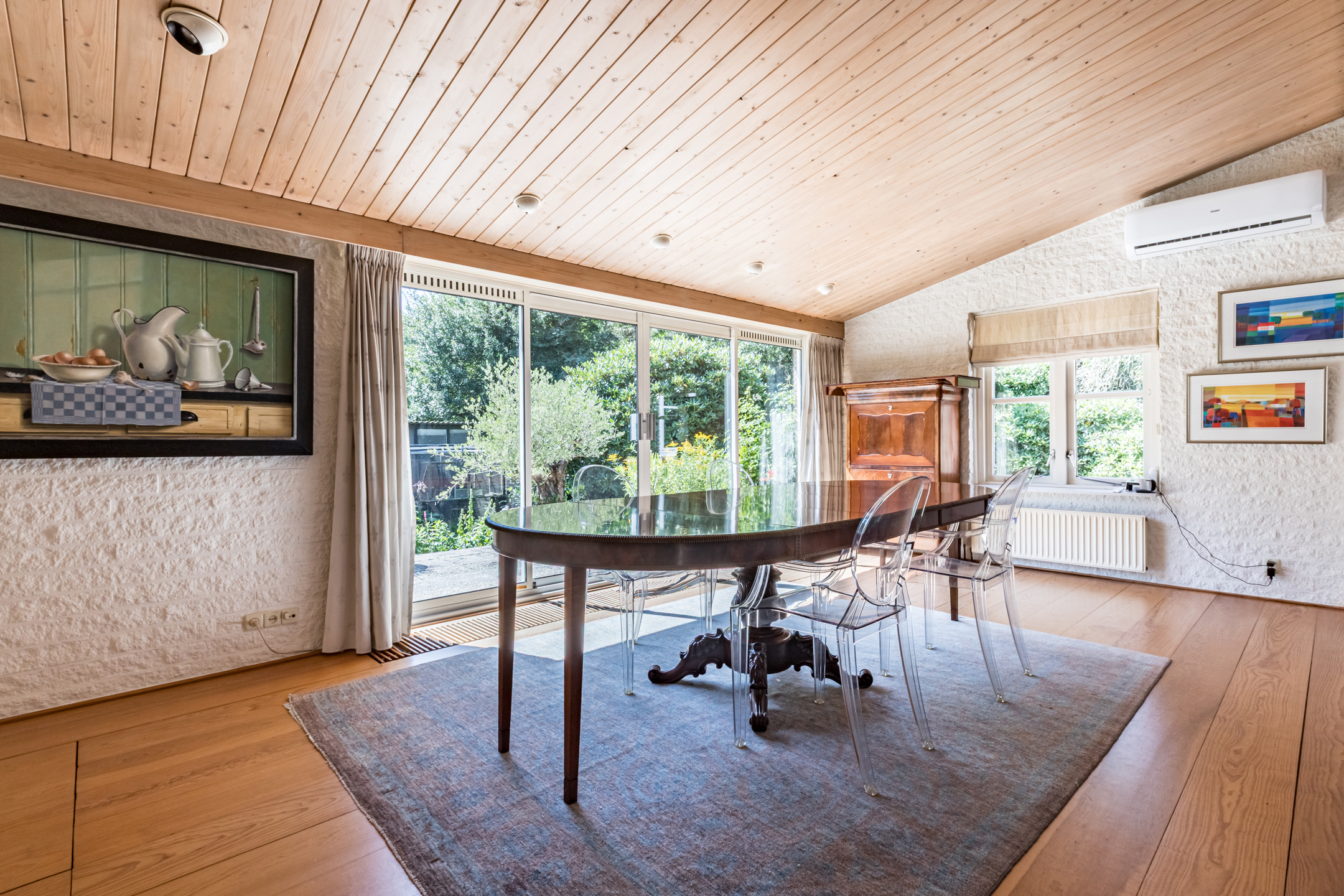 Riante, tuingerichte woonkamer met een houten vloer, grote raampartijen en een schuifpui naar de tuin. Geschakeld aan de woonkamer zit een grote glazen serre met openslaande tuindeuren en een schuifdeur.