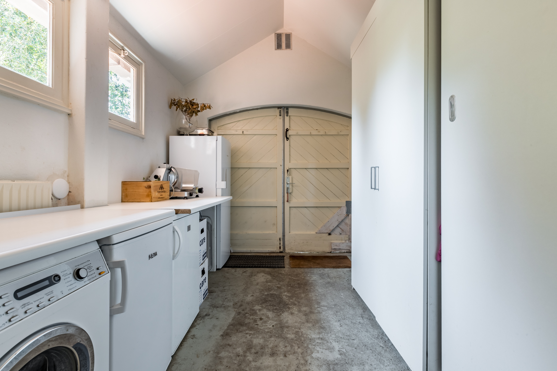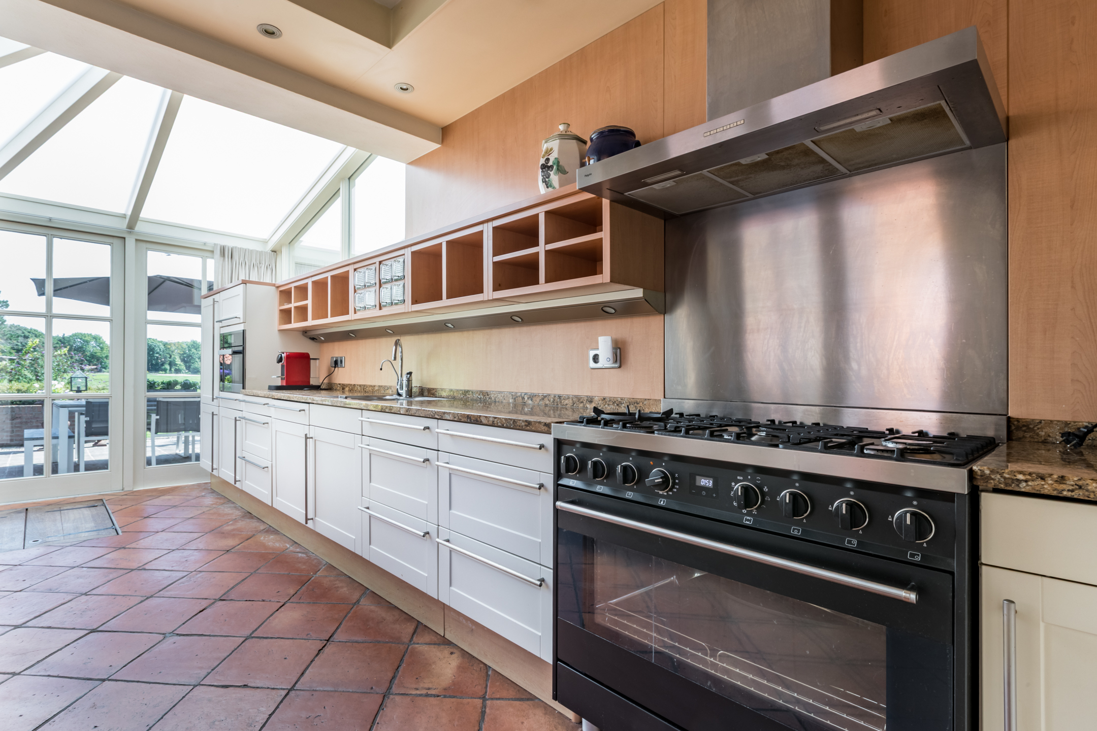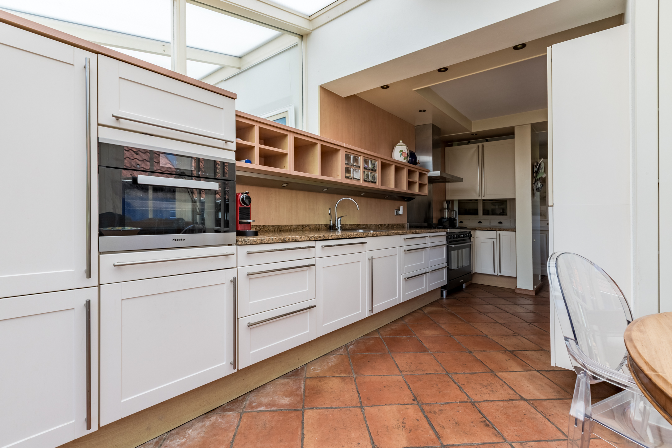 Grote, halfopen keuken met tegelvloer die eveneens geniet van een grote hoeveelheid lichtinval en ook openslaande deuren naar de tuin heeft. De keuken is voorzien van een gasfornuis, koelkast, stoomoven en een vaatwasser. Vanuit de keuken is er toegang tot de (wijn)kelder.