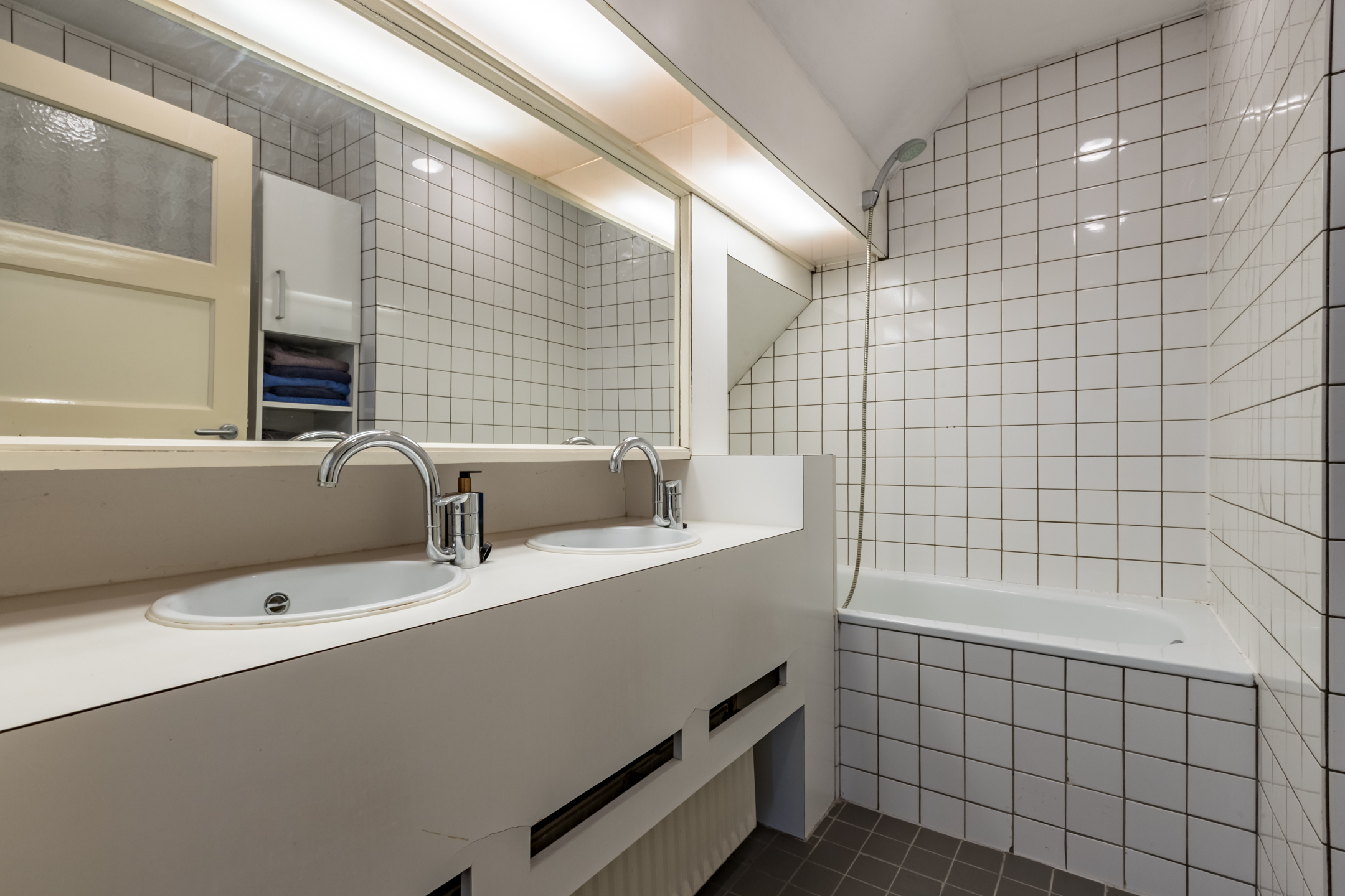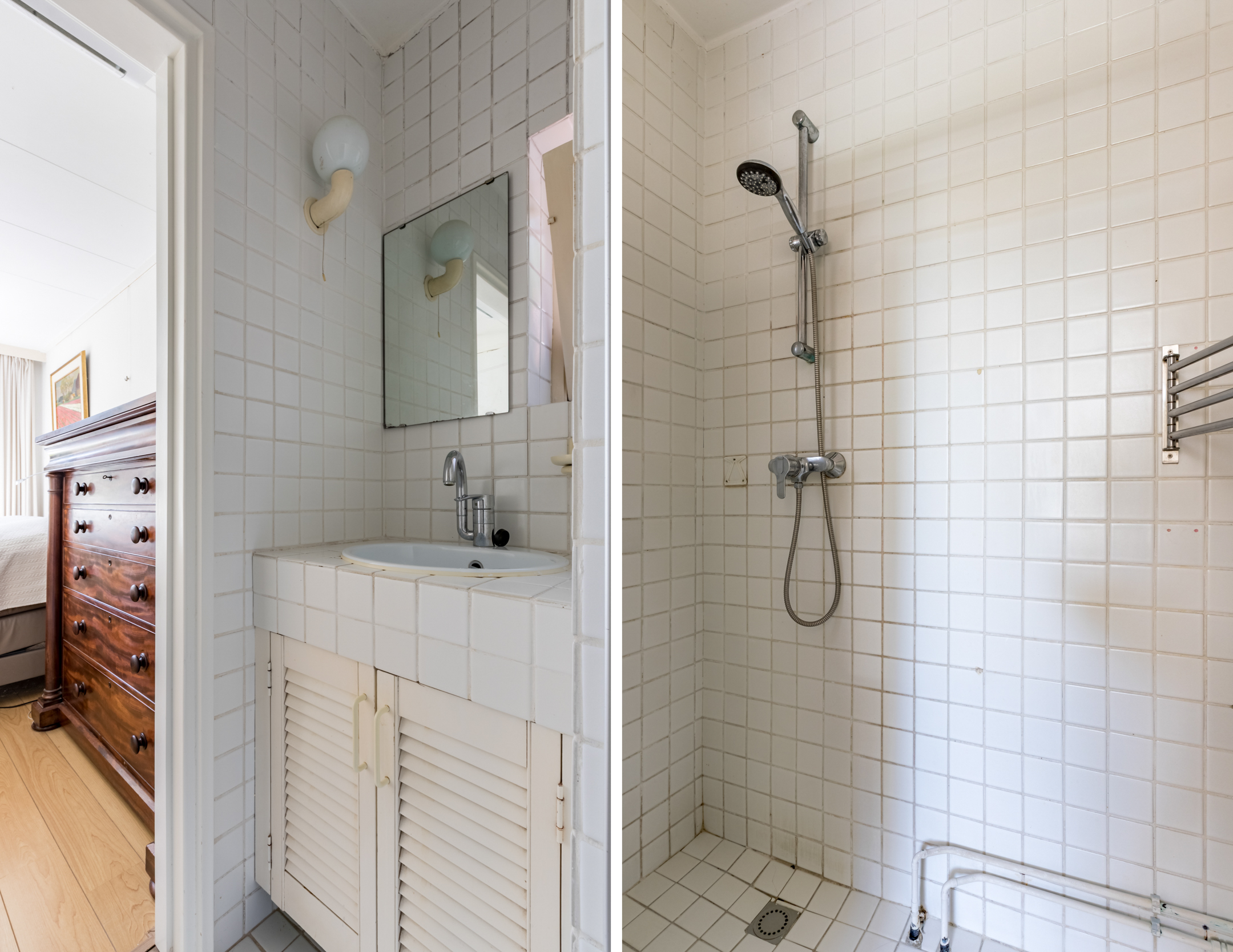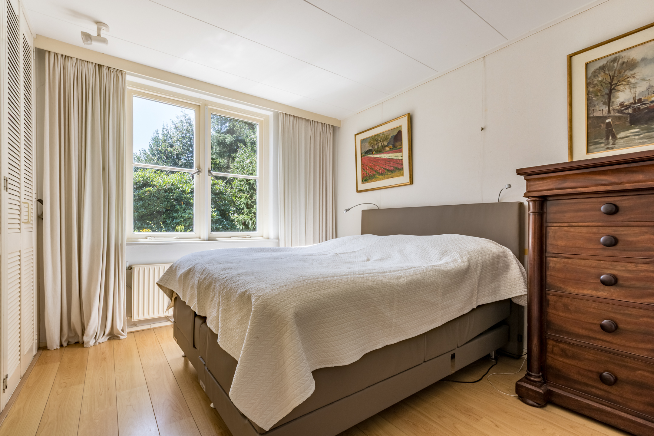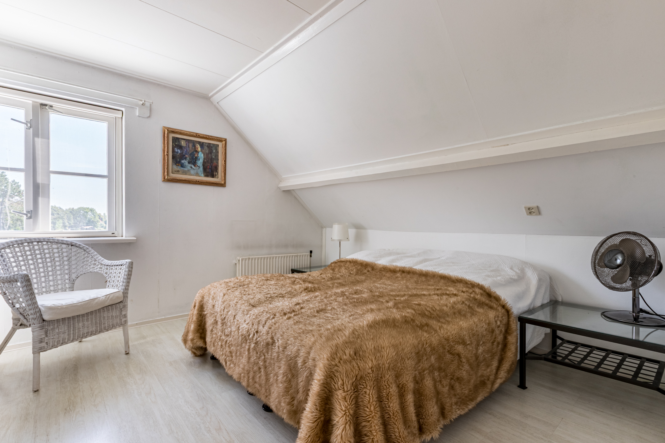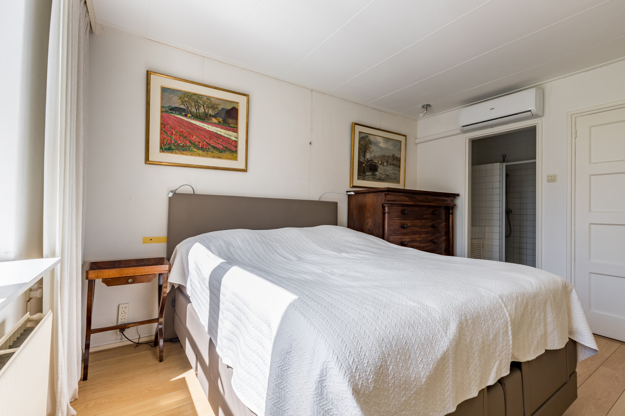 Op de begane grond is 1 slaapkamer met een inbouwwandkast aanwezig met en suite toegang tot een badkamer met een wastafel met meubel en een inloopdouche. Naast de badkamer zit een separaat toilet met fonteintje.
