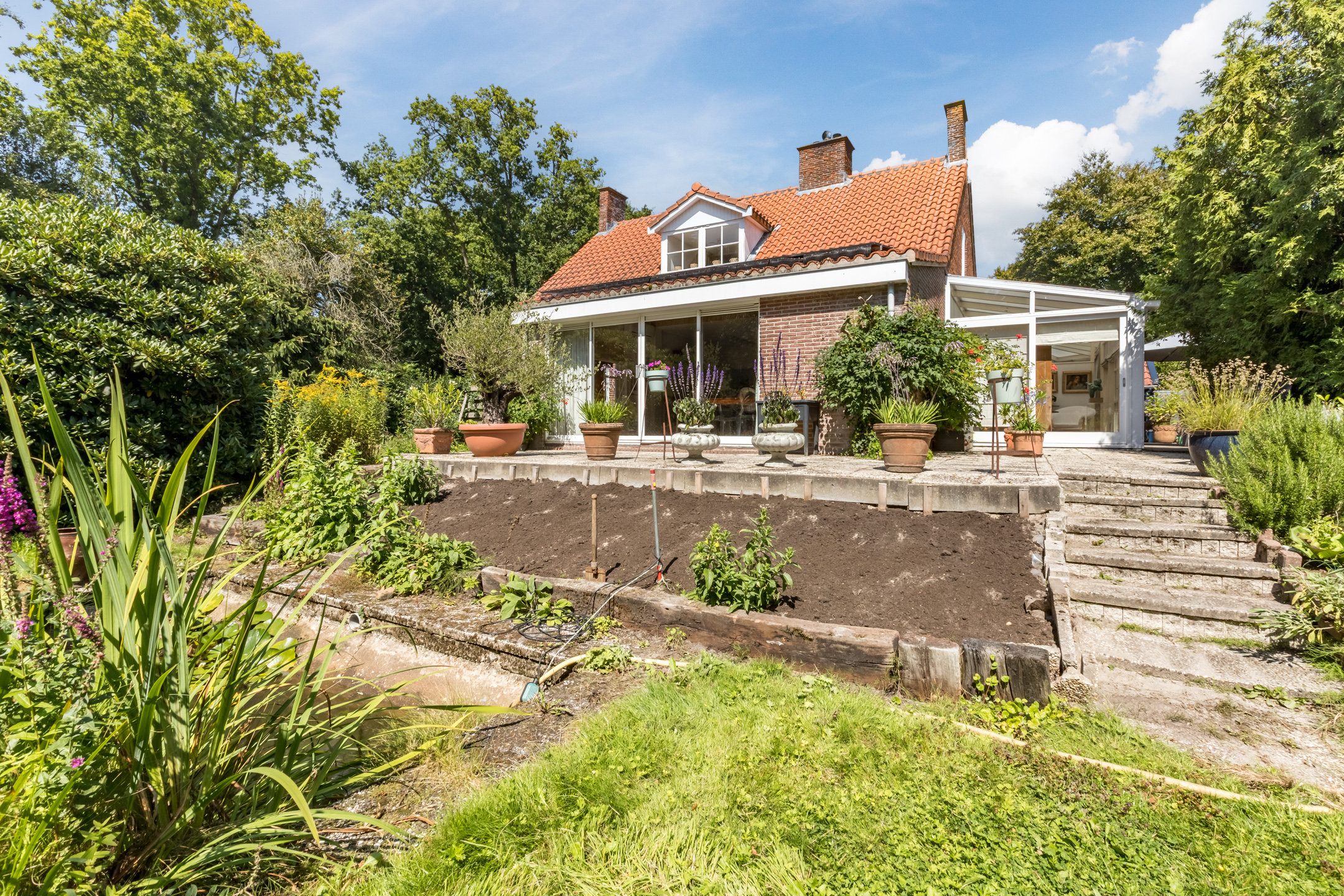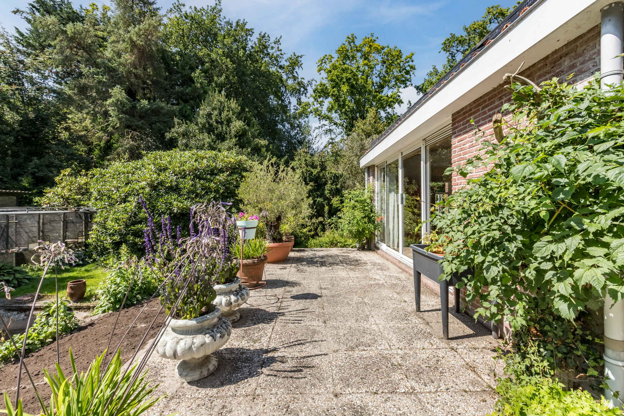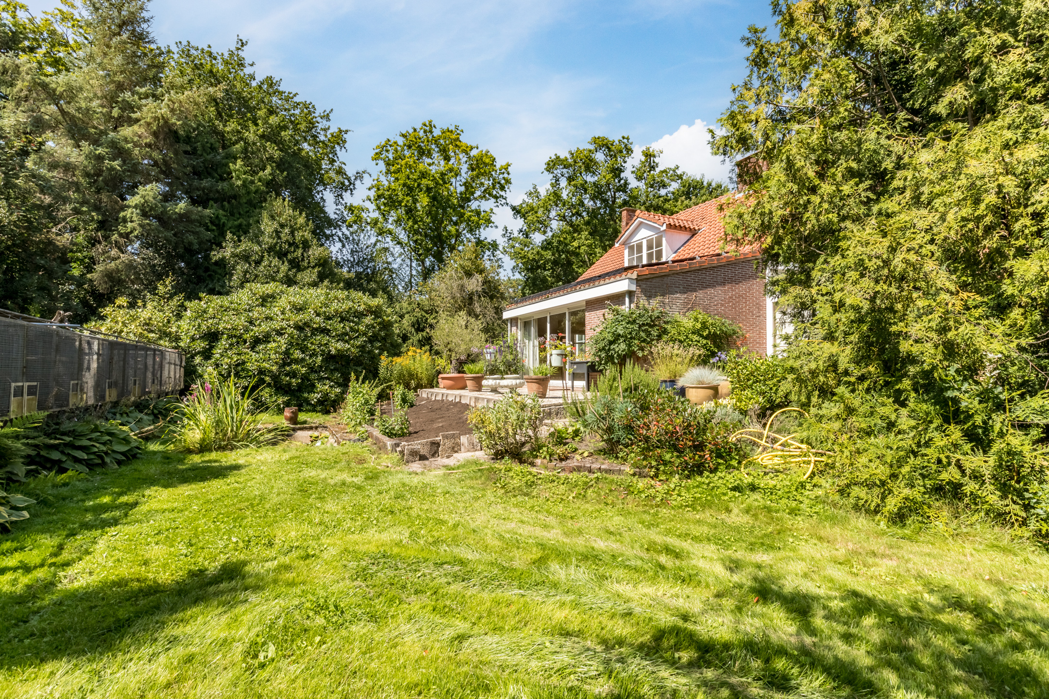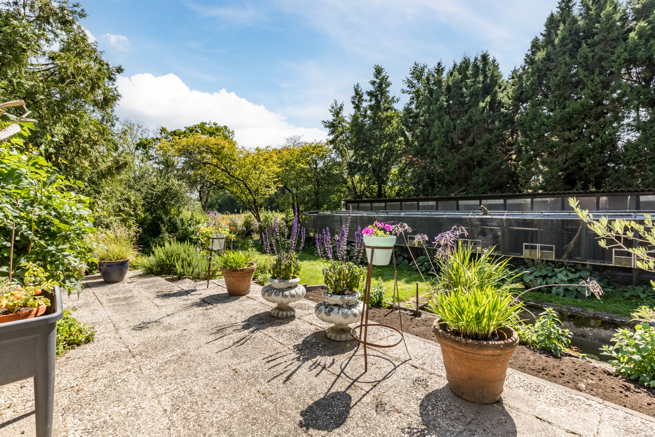 Royale tuin op het zuidoosten. De tuin heeft een parkachtig karakter met een groot betegeld terras dat wordt omlijst door groene borders, een groot grasveld, bomen en hagen. Er is vrij uitzicht over groen. Tevens staat er een ruime vrijstaande berging in de tuin met geschakelde overkapping.