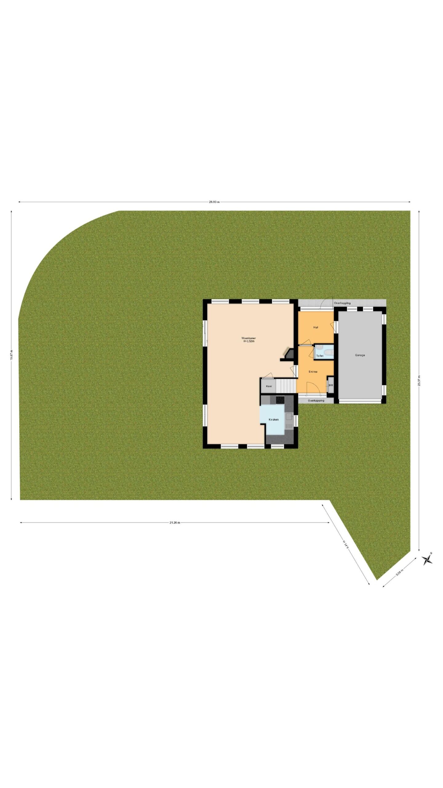 Grote, groene voortuin met ruime oprit richting de garage. Entreehal met gastentoilet, trapopgang naar de eerste verdieping, toegang tot een aparte hal (met achterdeur en inpandige toegang tot de garage) en tot de royale woonkamer met open keuken.