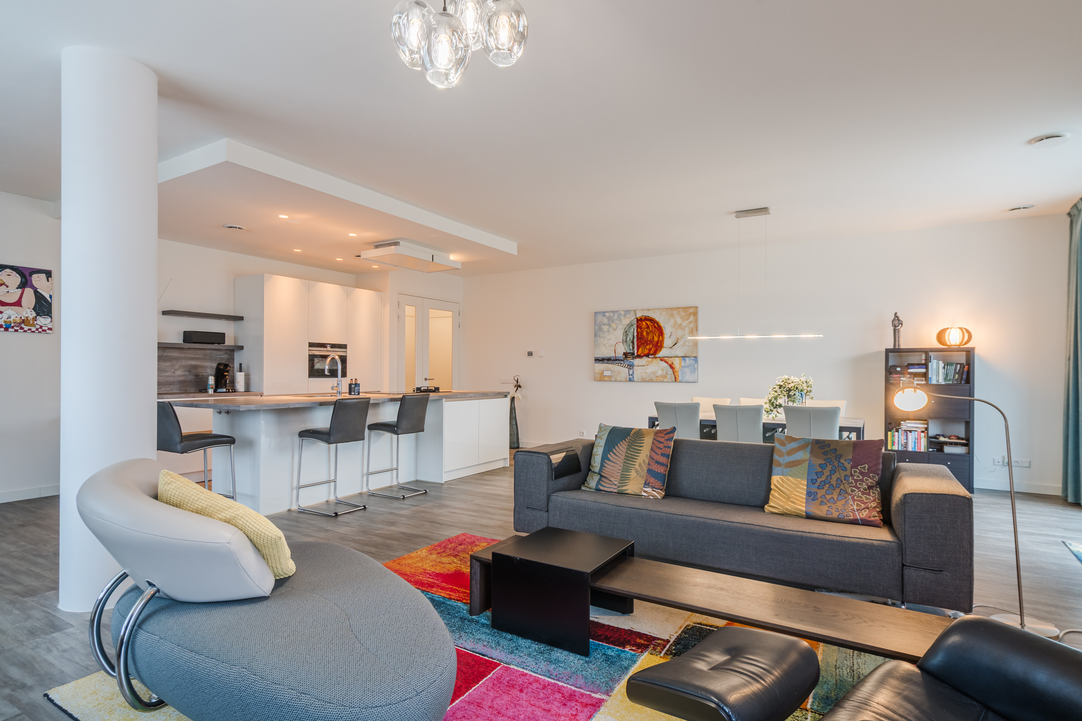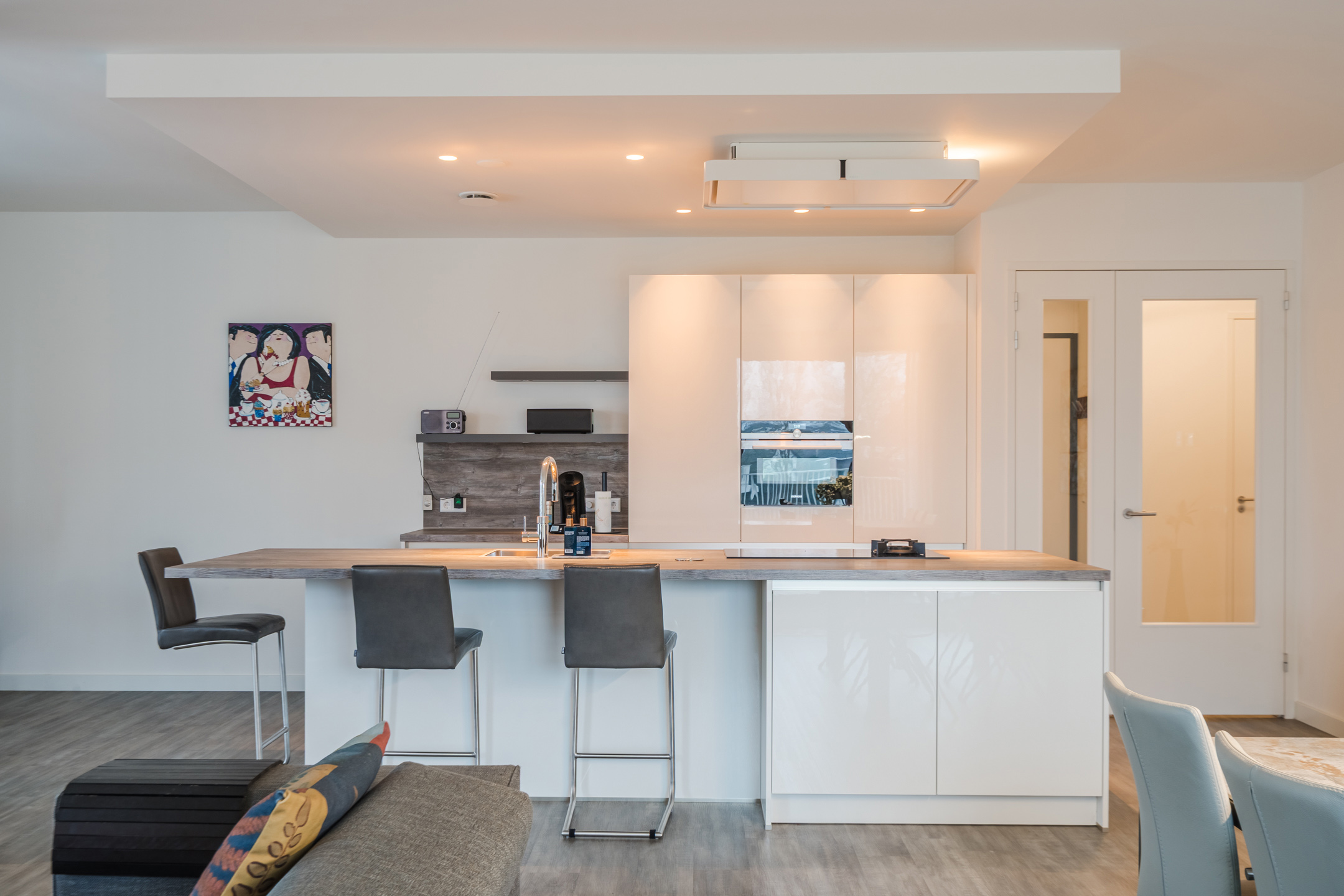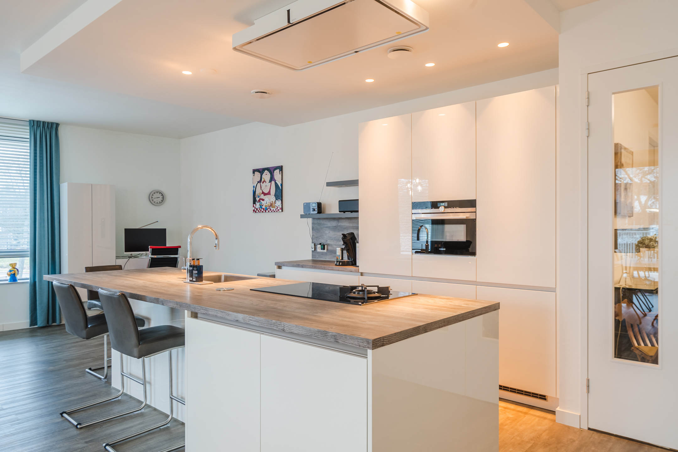 De royale woonkamer geniet door de rondlopende muren met een overdaad aan ramen van een riante hoeveelheid lichtinval. De open woonkeuken heeft een centrale plek in de woonkamer en is door het grote kookeiland met bar een echte leefkeuken waar je gezellig kunt aanschuiven. De moderne keuken met een strak design is voorzien van hoogwaardige inbouwapparatuur: een inductiefornuis, koelkast, vriezer en een vaatwasser.
