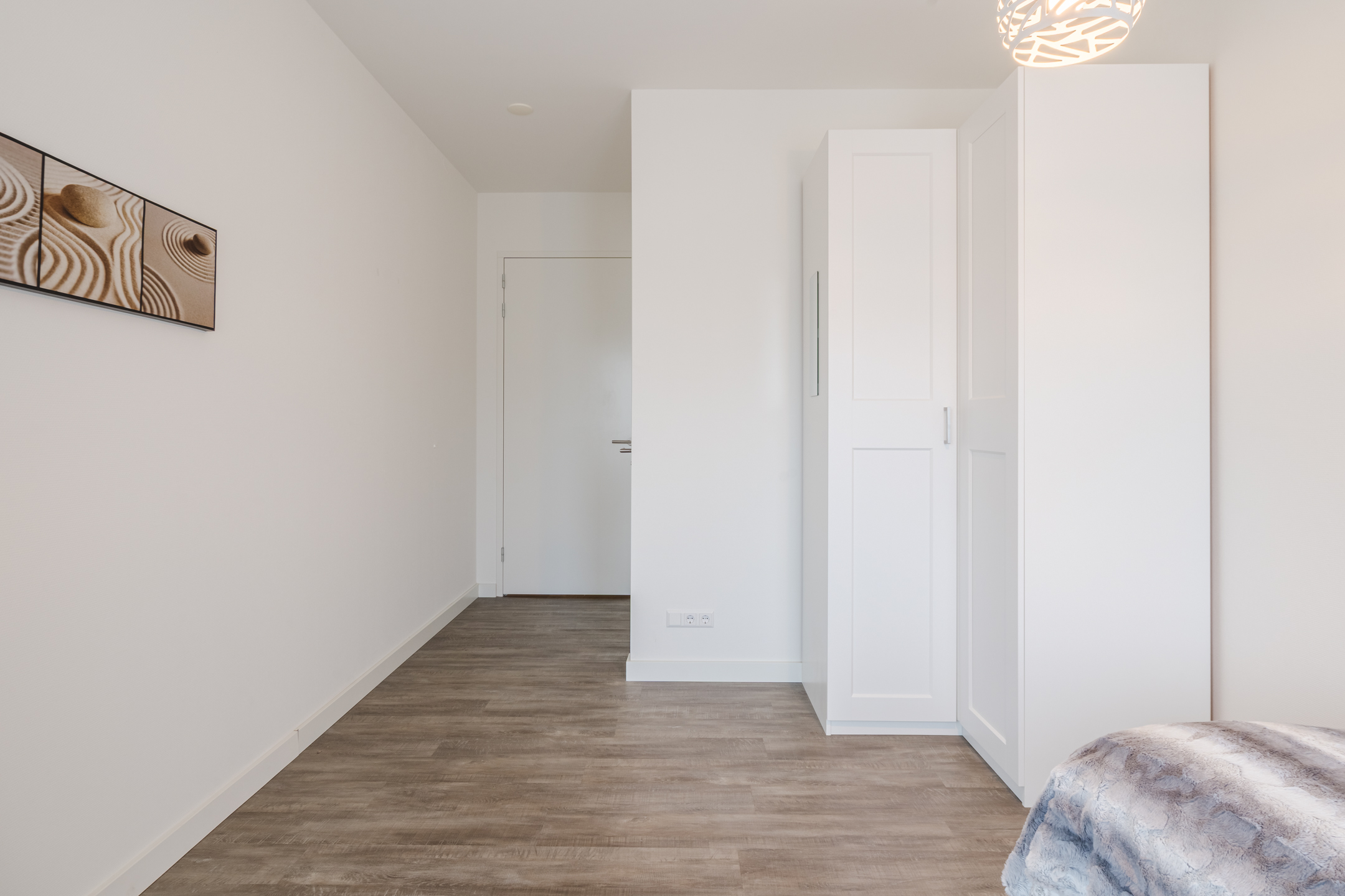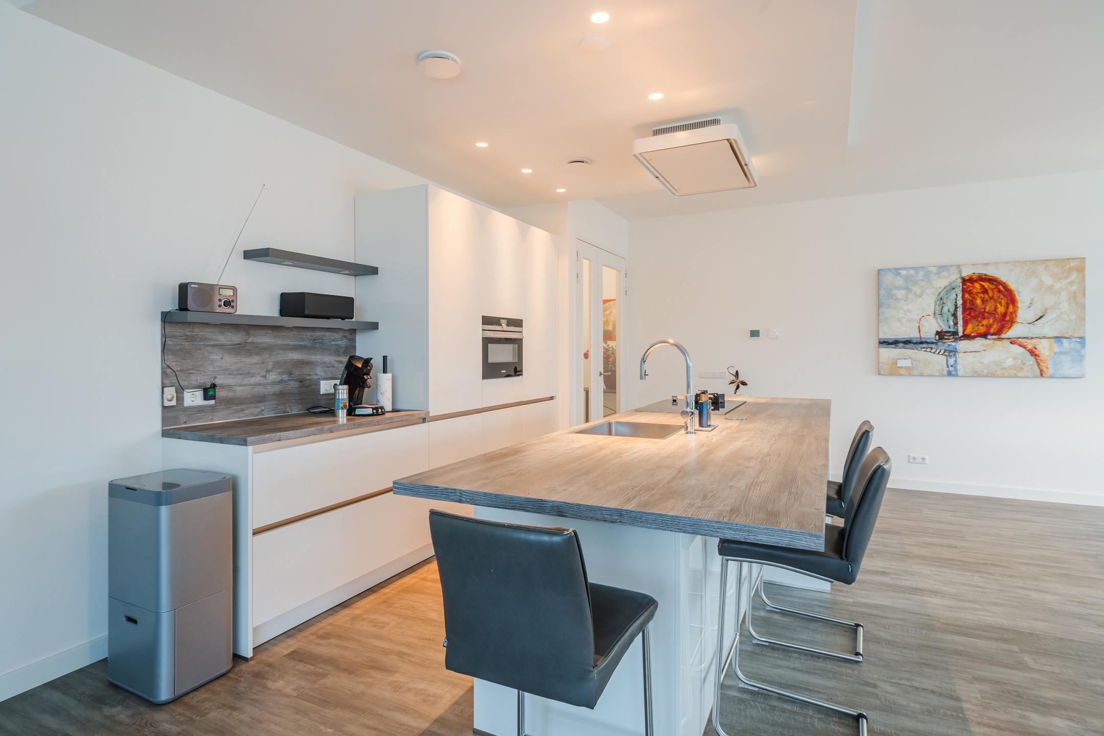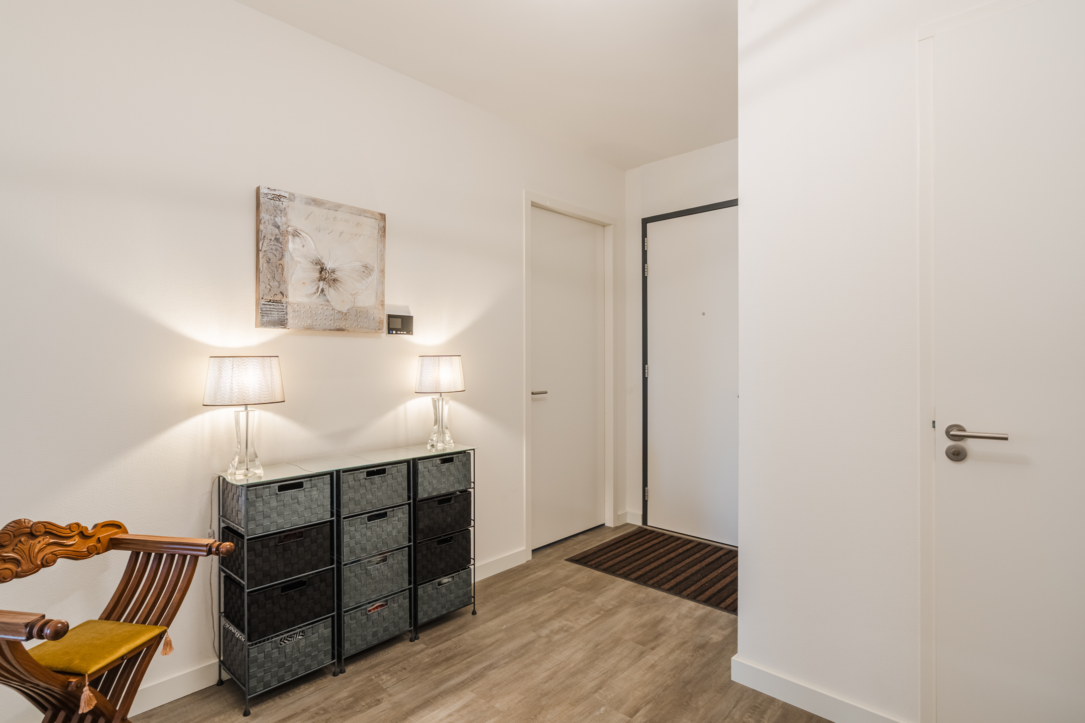 Het gehele appartement is luxe afgewerkt met een PVC-laminaatvloer met vloerverwarming en strakke muren en plafonds in een neutrale kleurstelling.
