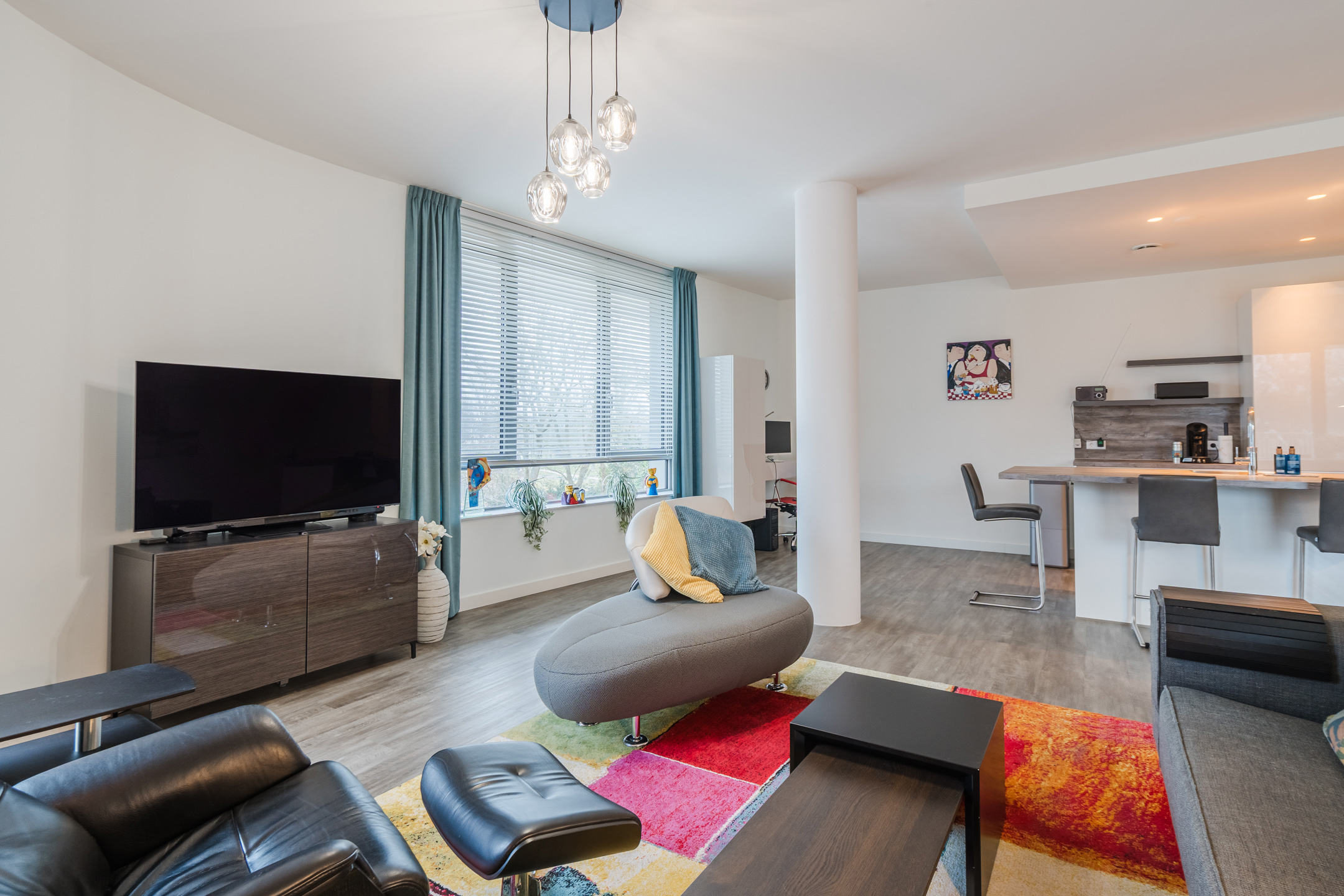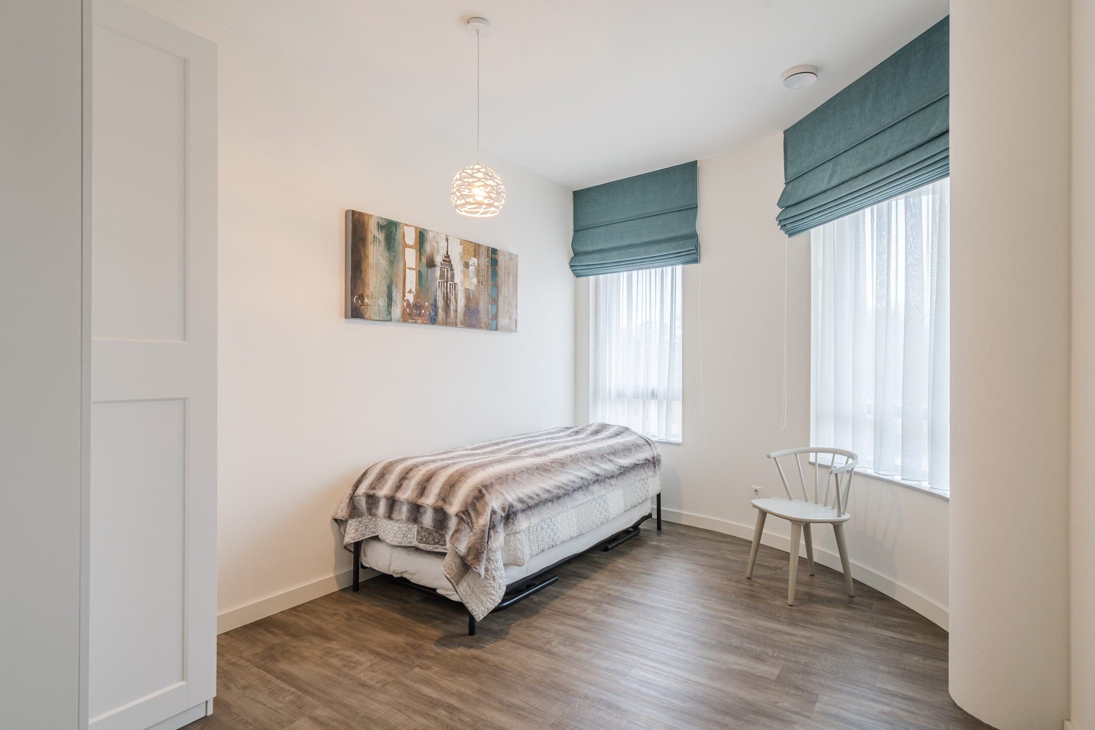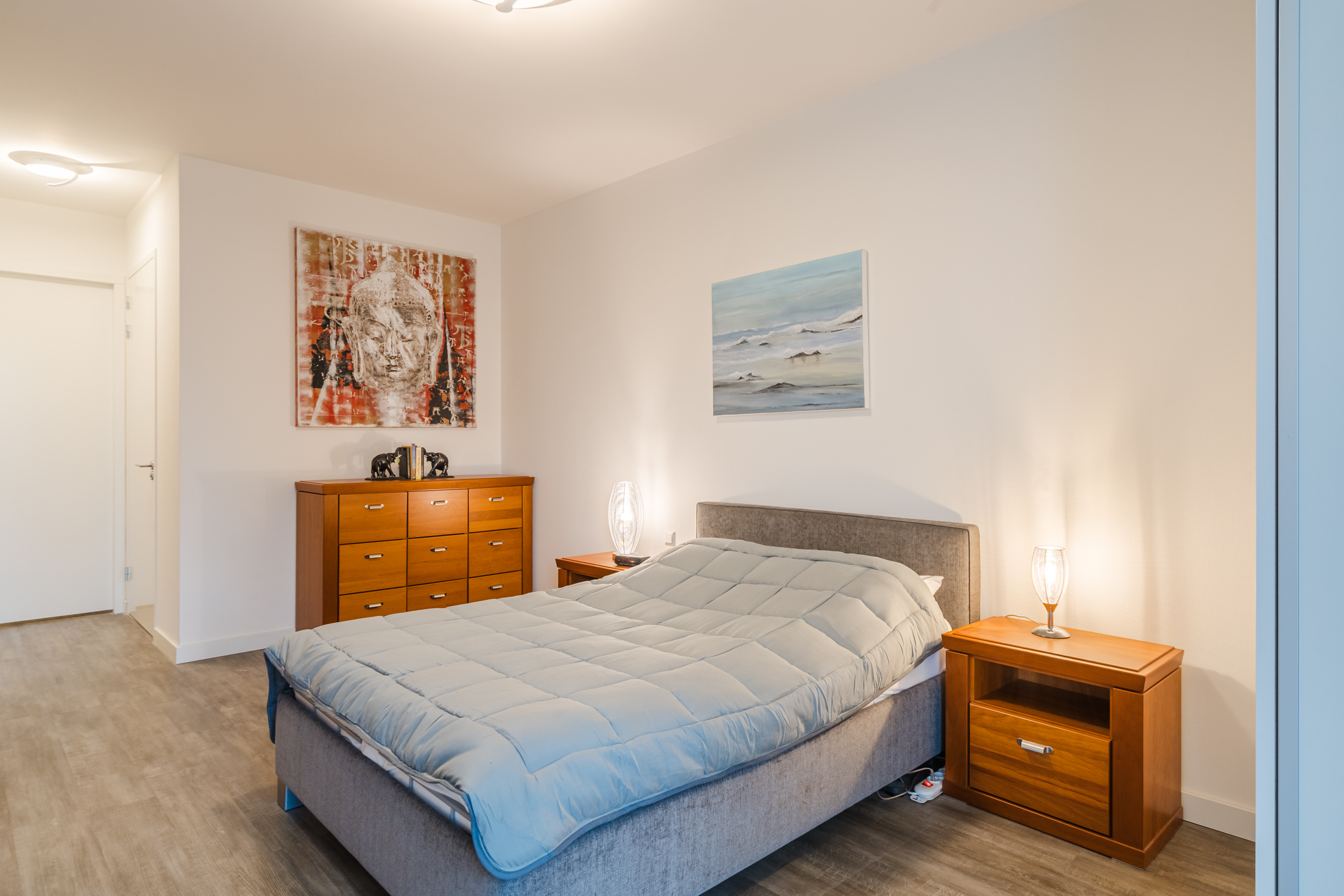 Het gehele appartement is luxe afgewerkt met een PVC-laminaatvloer met vloerverwarming en strakke muren en plafonds in een neutrale kleurstelling.
