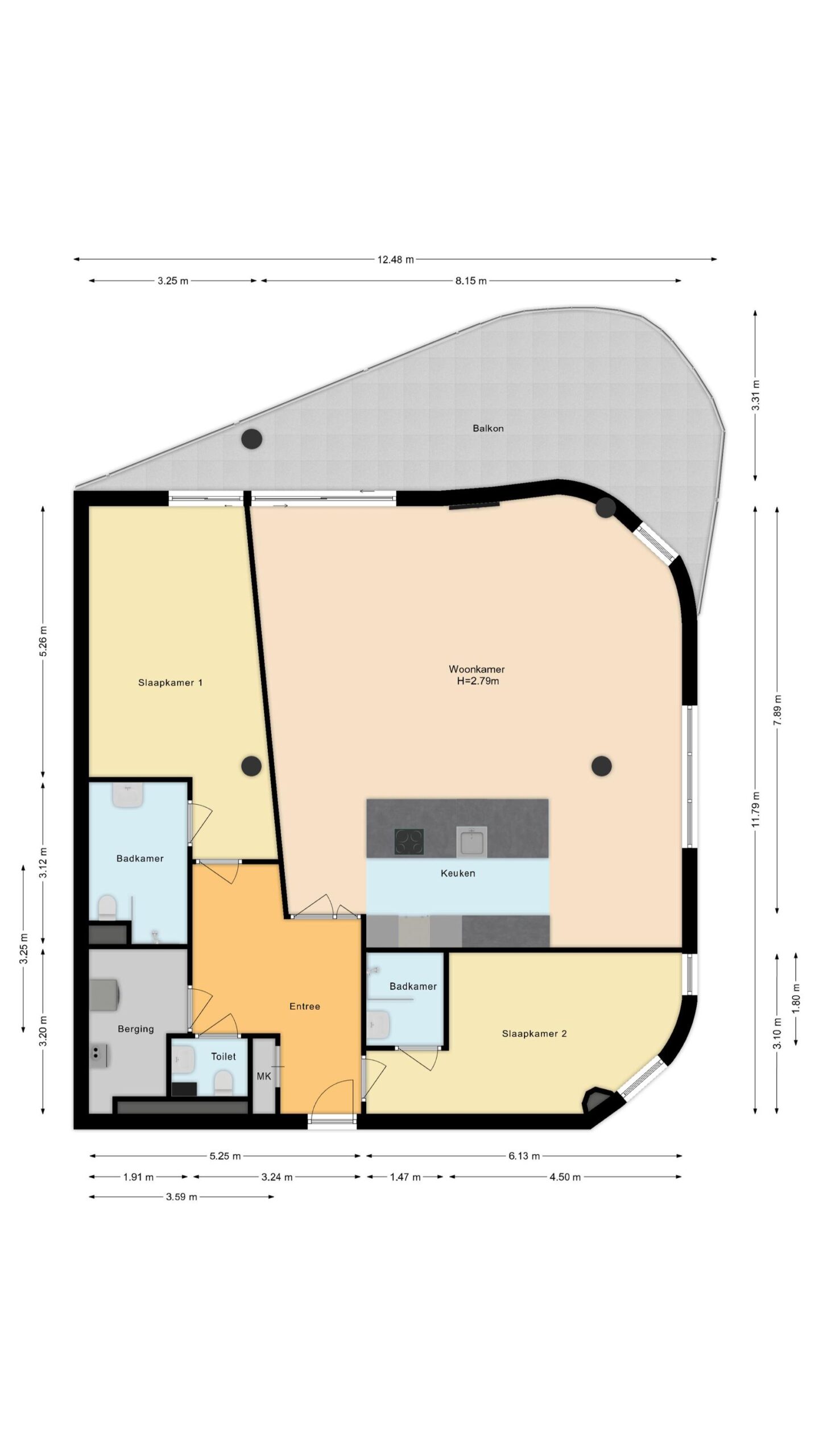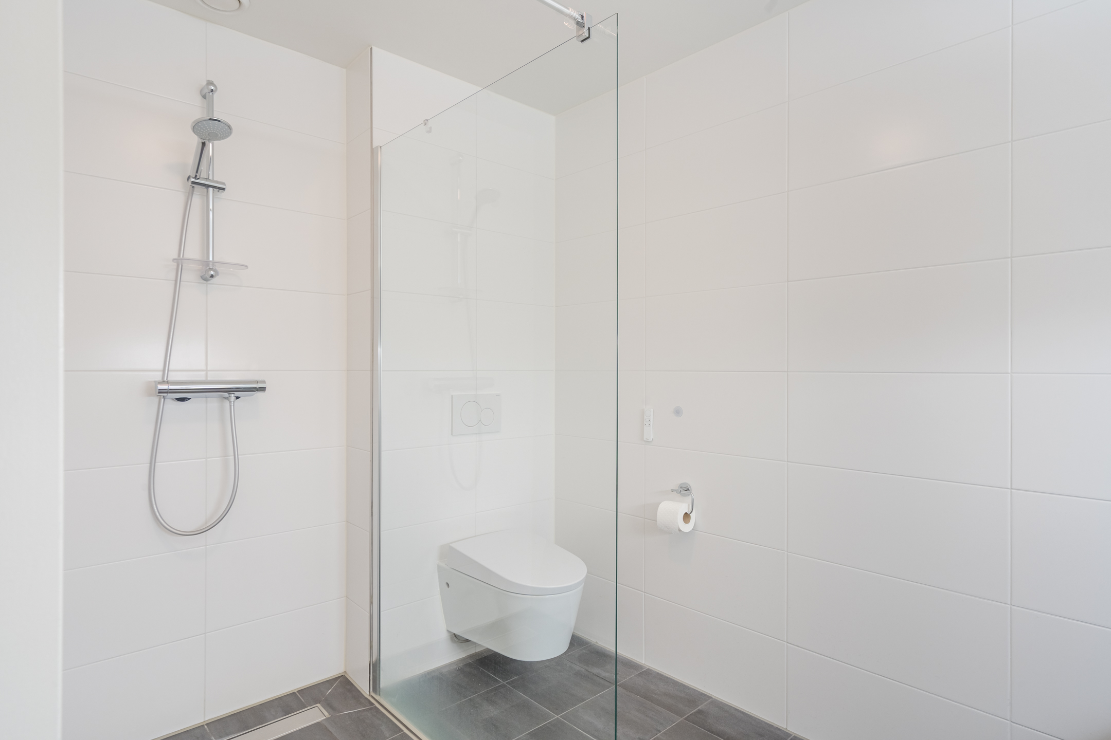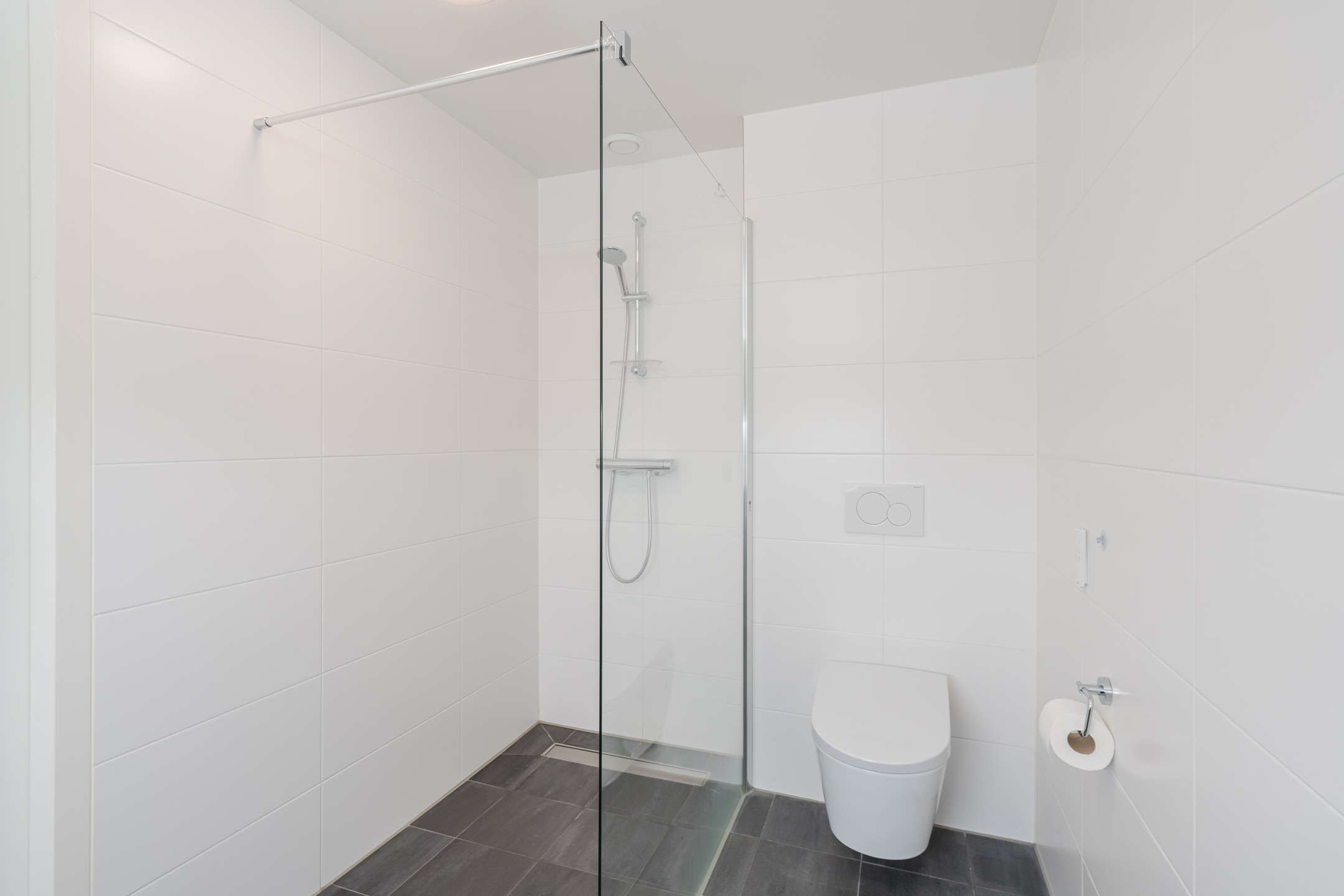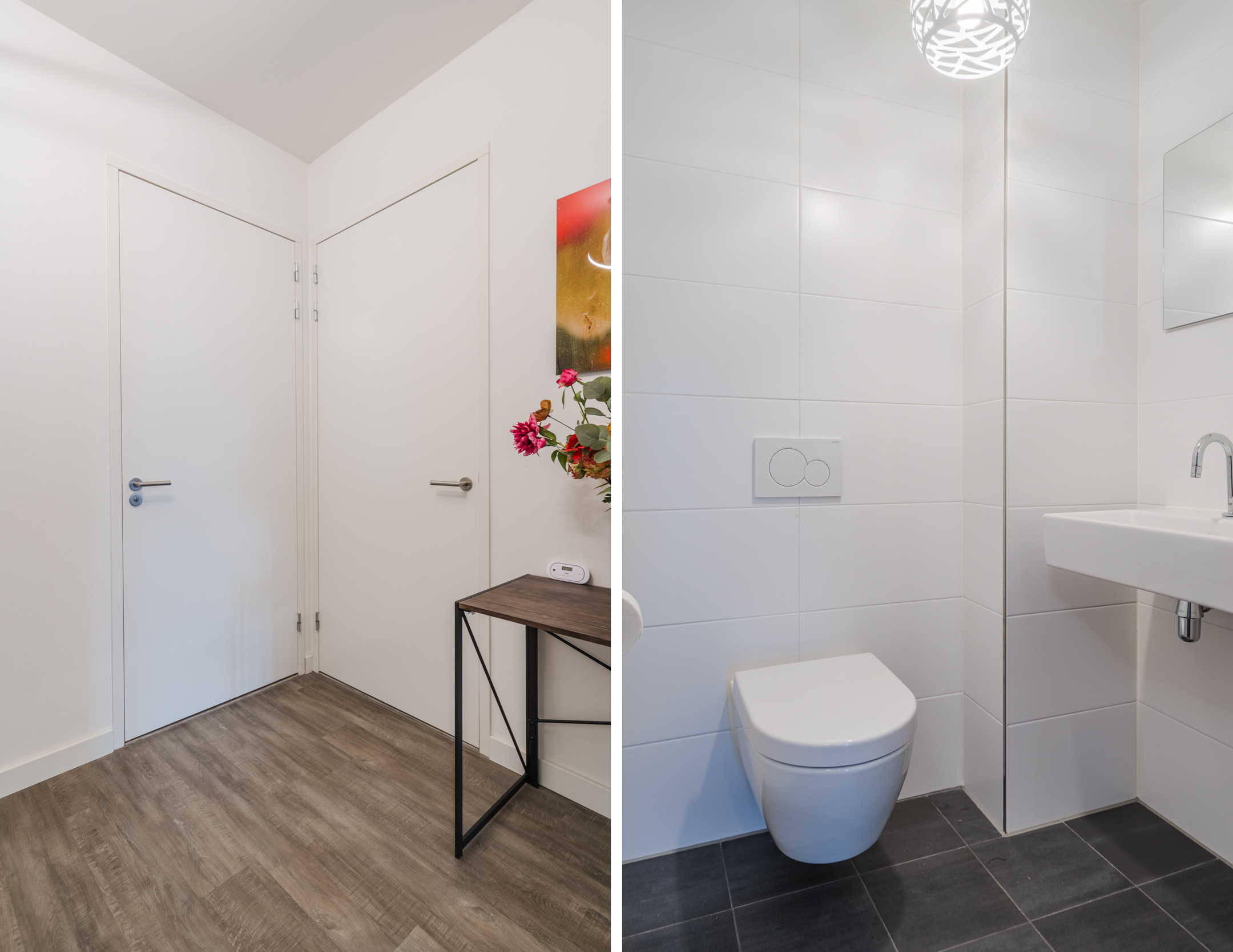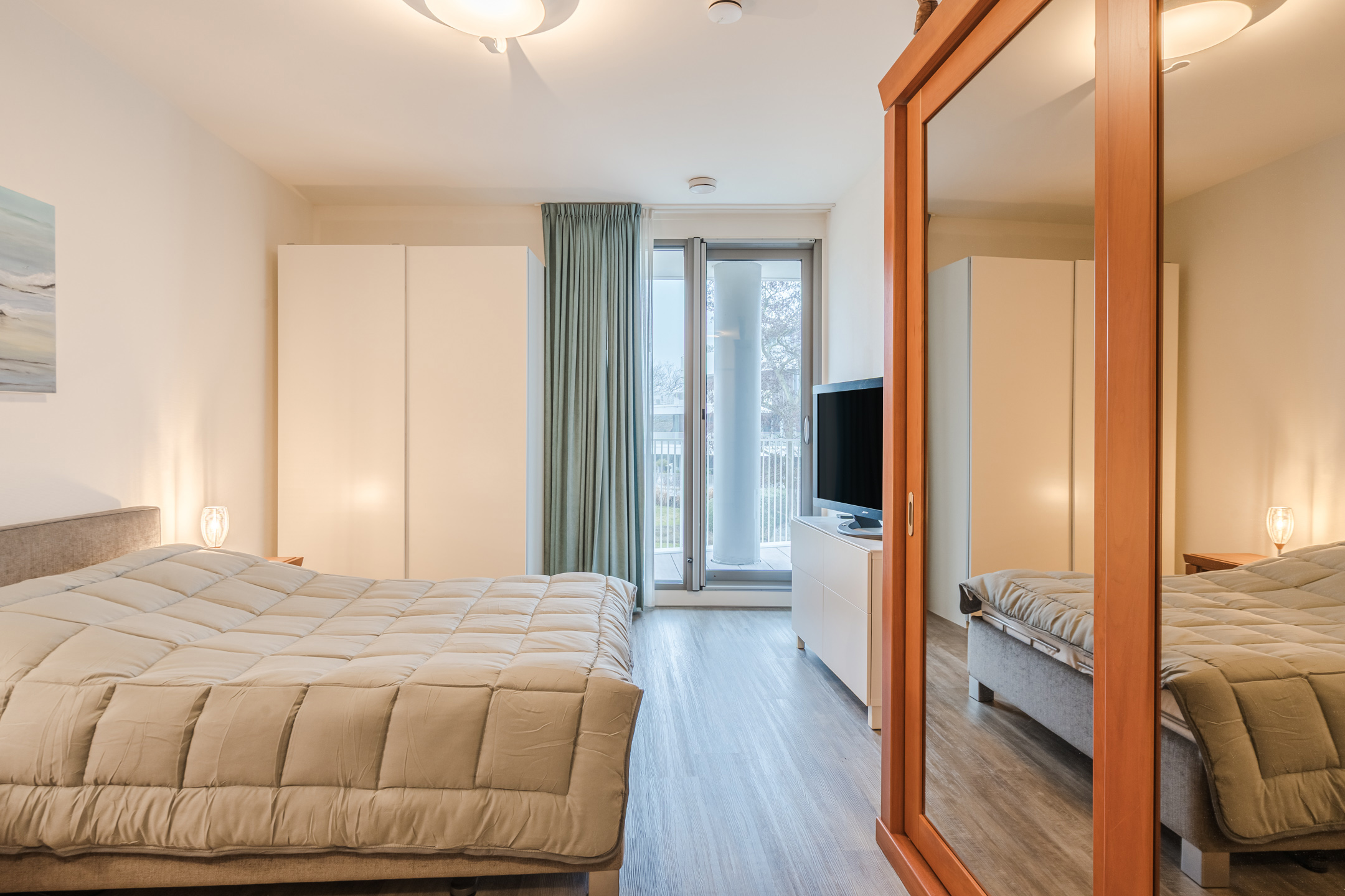 Het appartement beschikt over 2 ruim bemeten slaapkamer welke, net als de rest, zeer strak zijn afgewerkt. Beide kamers hebben een badkamer en suite met wastafel en douche. De badkamer van de grootste slaapkamer heeft tevens een toilet. Een separaat, tweede (gasten)toilet bevindt zich in de entreehal. De aansluitingen voor de witgoedopstelling zijn discreet weggewerkt in een aparte ruimte.