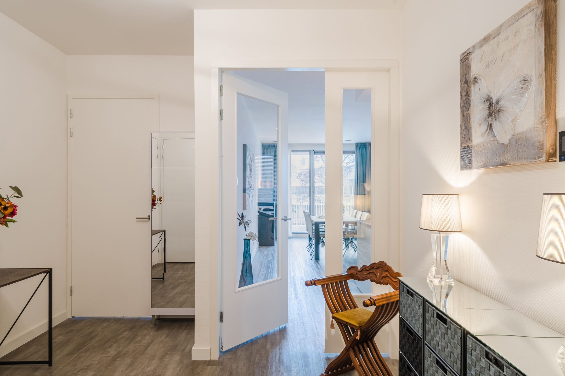 Met de lift of via het centrale trappenhuis, komen we aan bij de woning op de eerste verdieping. Achter de voordeur vinden we de centrale entreehal die toegang biedt tot alle ruimtes van het appartement, behalve tot de badkamers, die en suite toegankelijk zijn vanuit de slaapkamers.