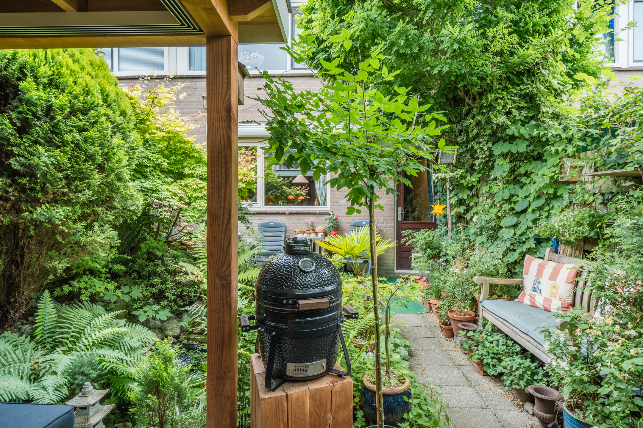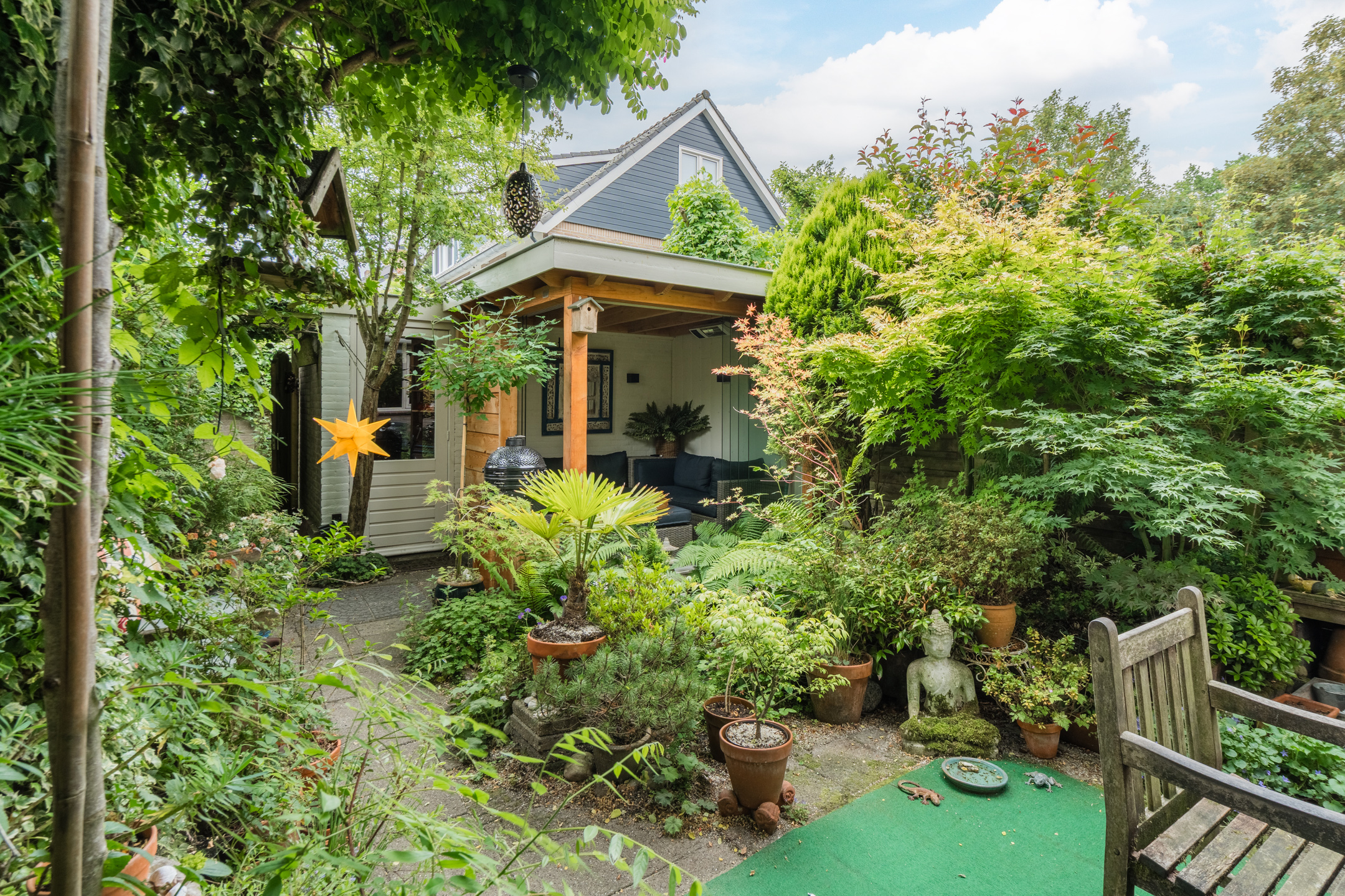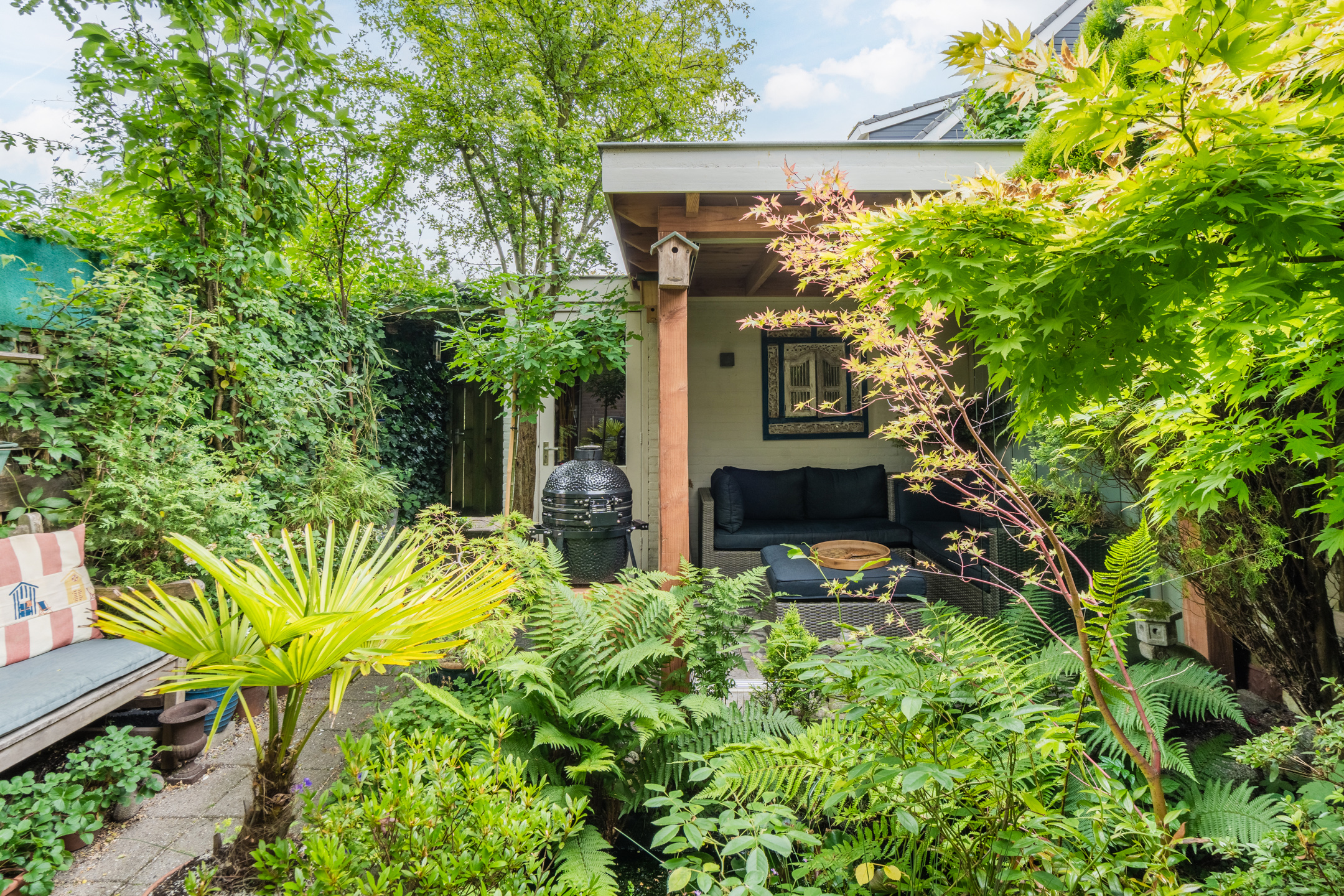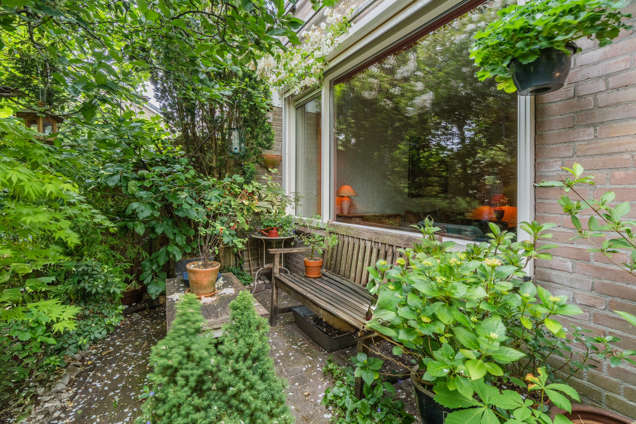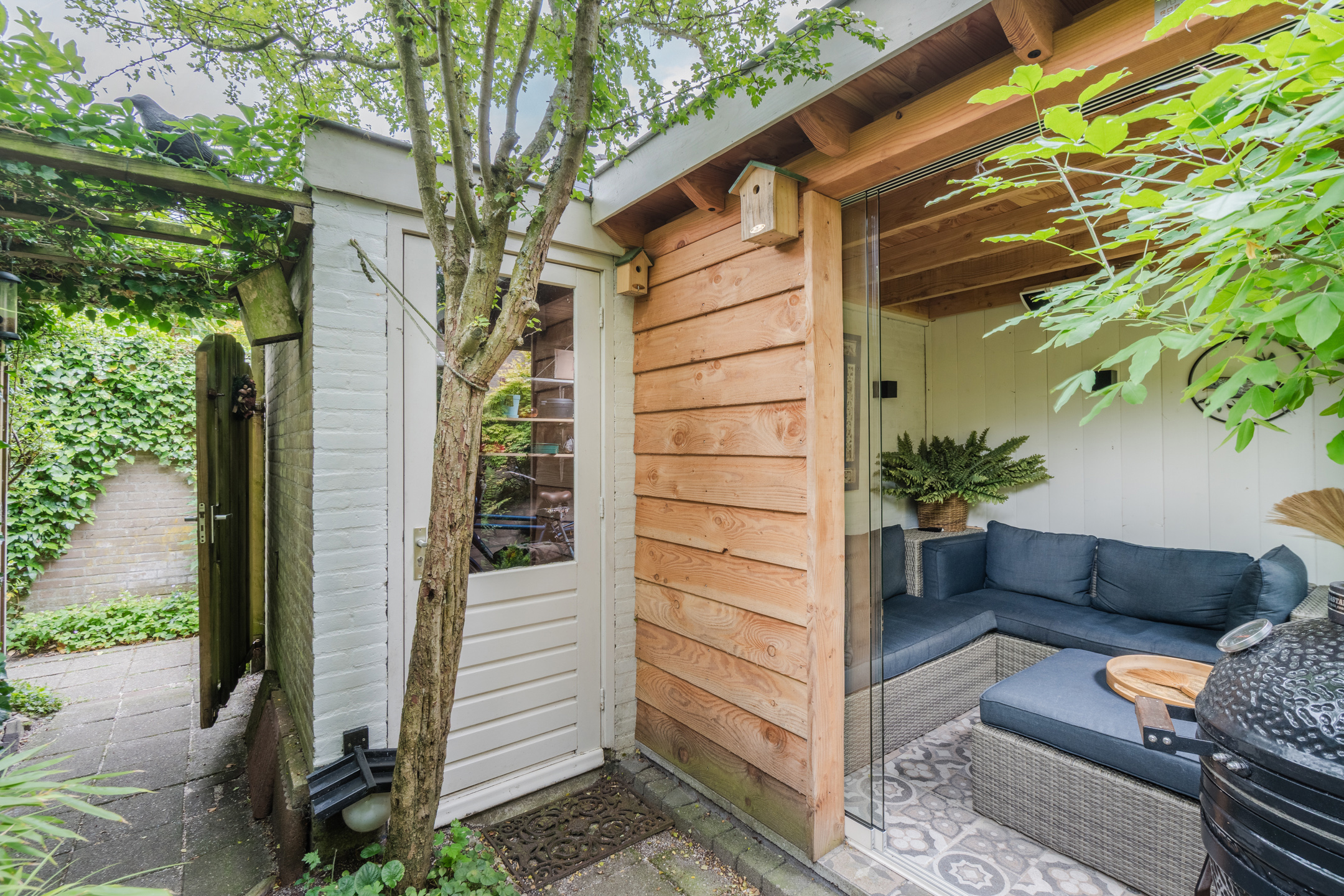De fraai aangelegde achtertuin is gelegen op het oosten en is voorzien van een groot betegeld terras dat wordt afgewisseld met groene borders en boompjes. Achterin de tuin staat een stenen berging welke voorzien is van elektriciteit. Geschakeld aan deze berging zit een gezellige (nieuwe) veranda die afgesloten kan worden met schuifdeuren.