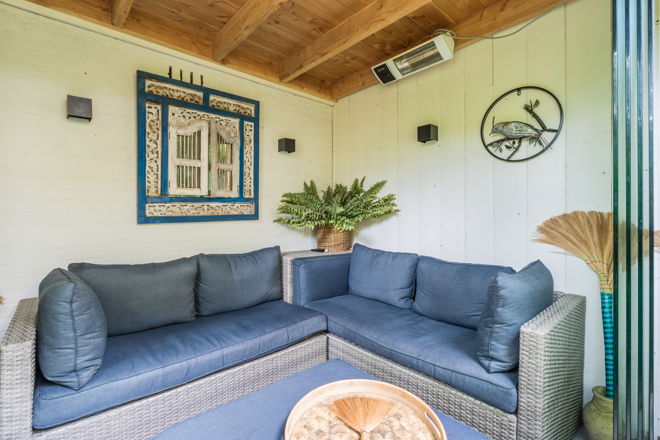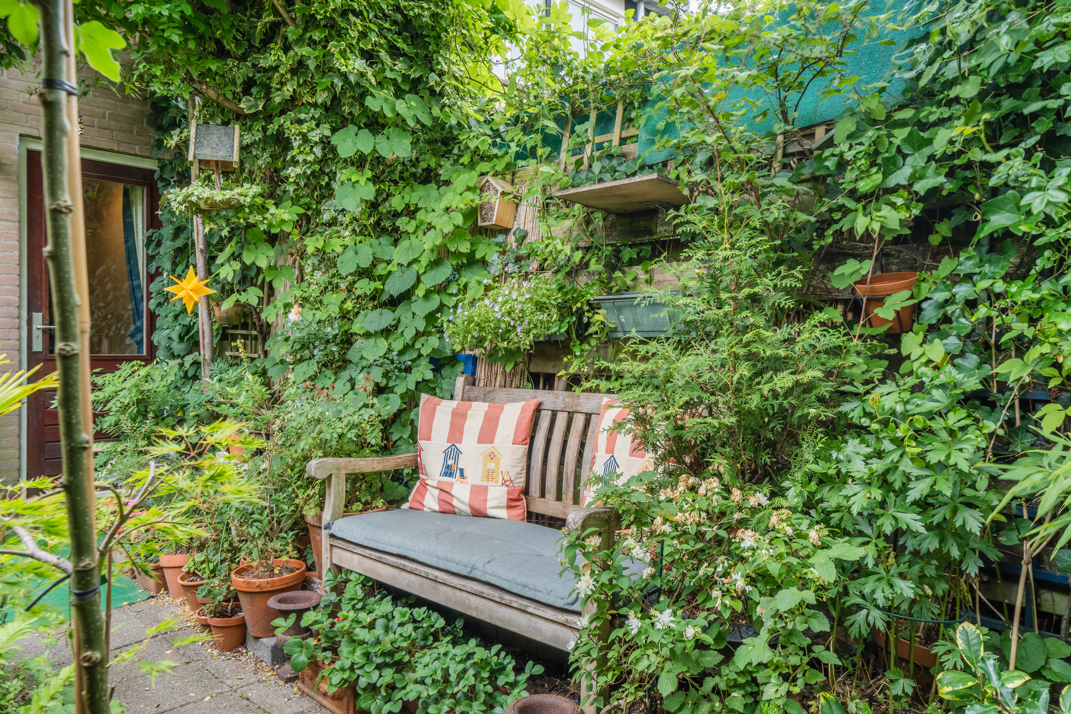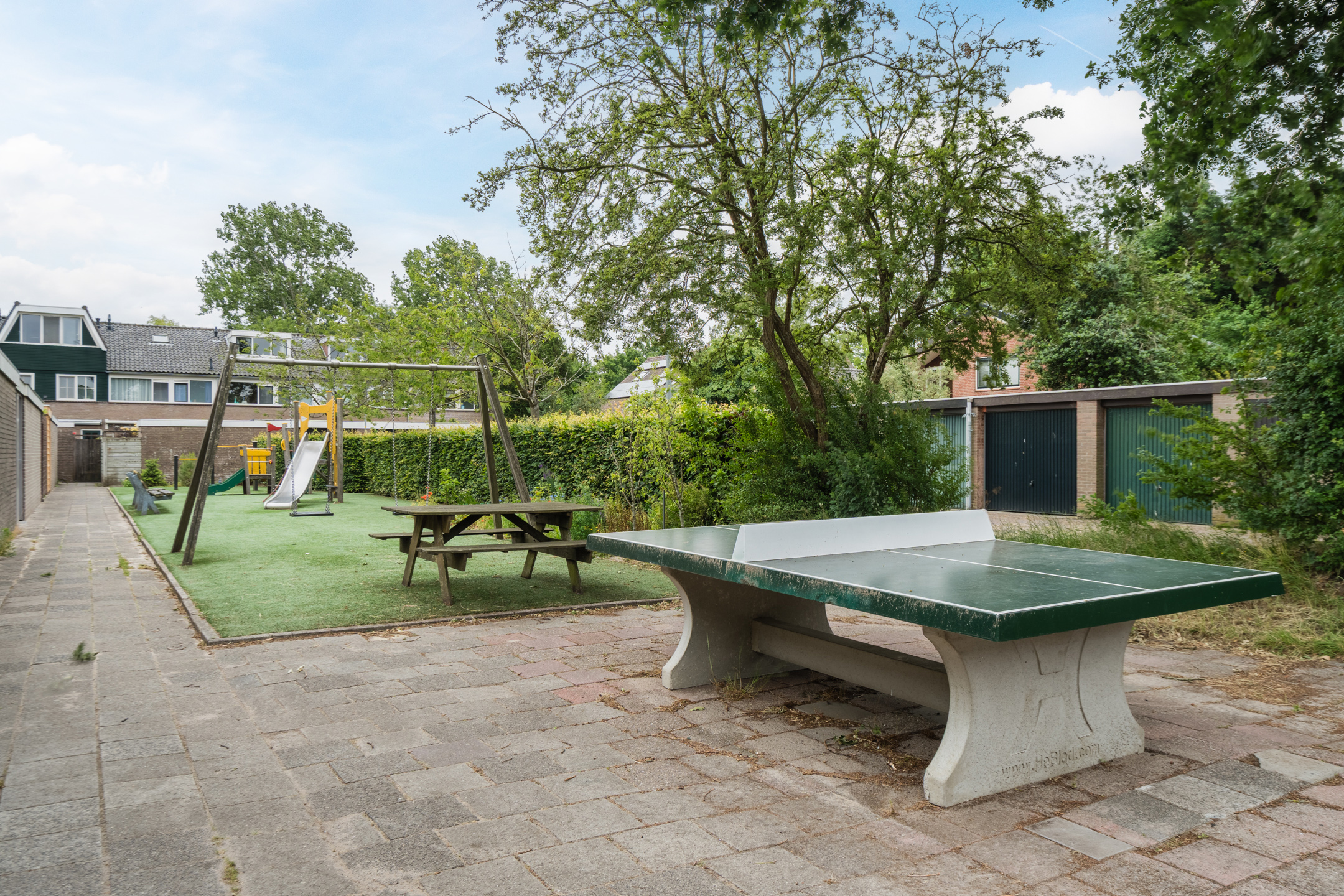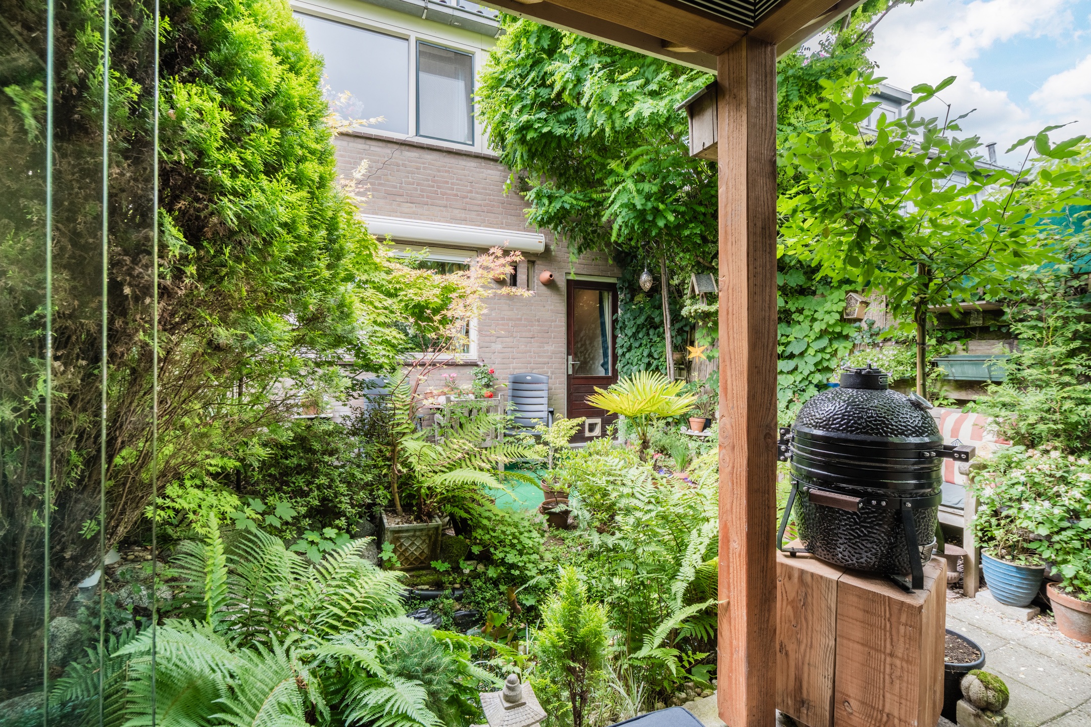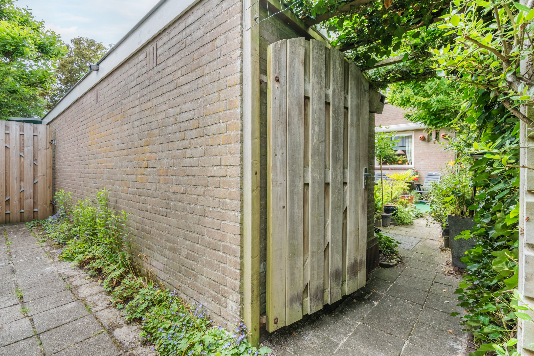 De fraai aangelegde achtertuin is gelegen op het oosten en is voorzien van een groot betegeld terras dat wordt afgewisseld met groene borders en boompjes. Achterin de tuin staat een stenen berging welke voorzien is van elektriciteit. Geschakeld aan deze berging zit een gezellige (nieuwe) veranda die afgesloten kan worden met schuifdeuren.