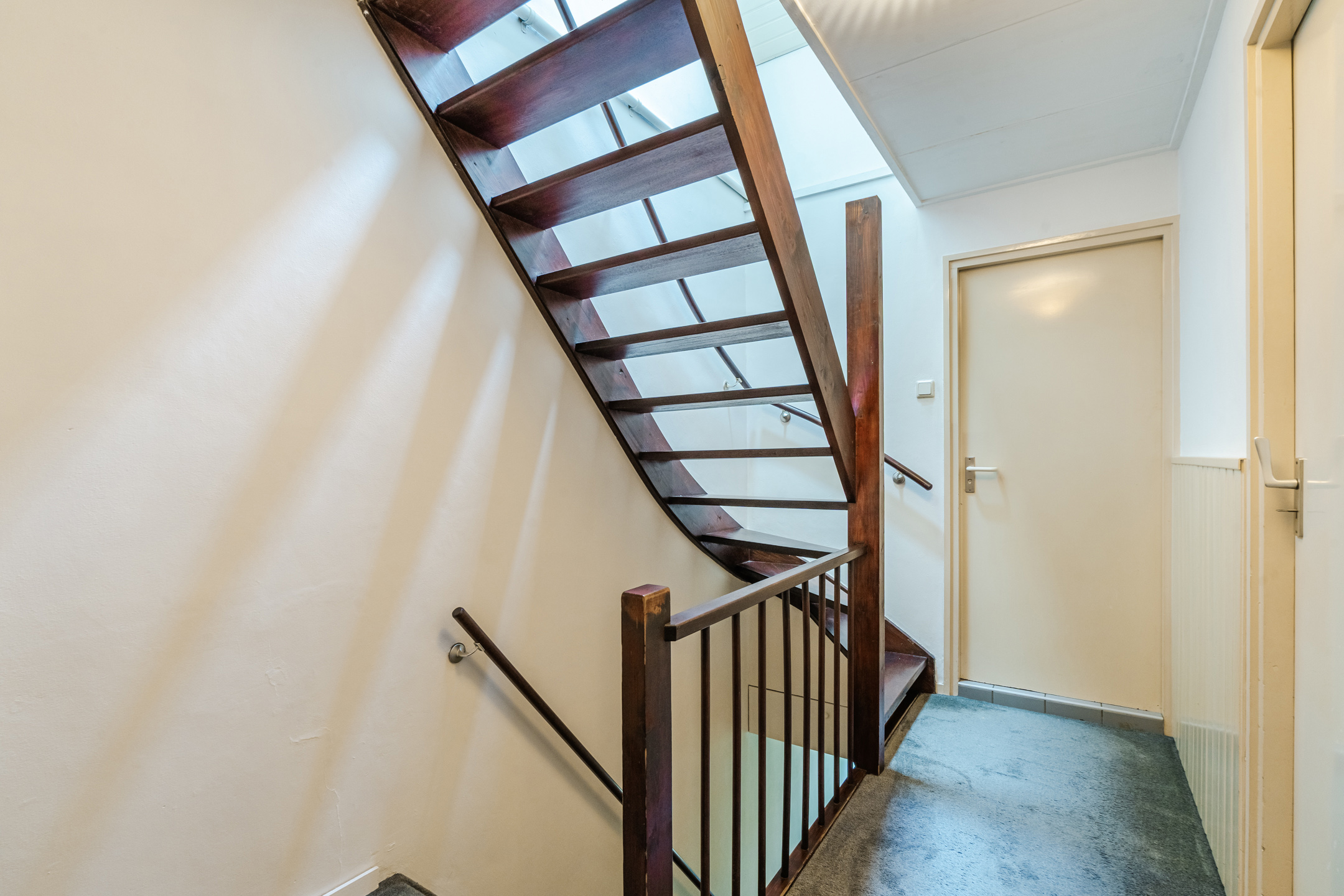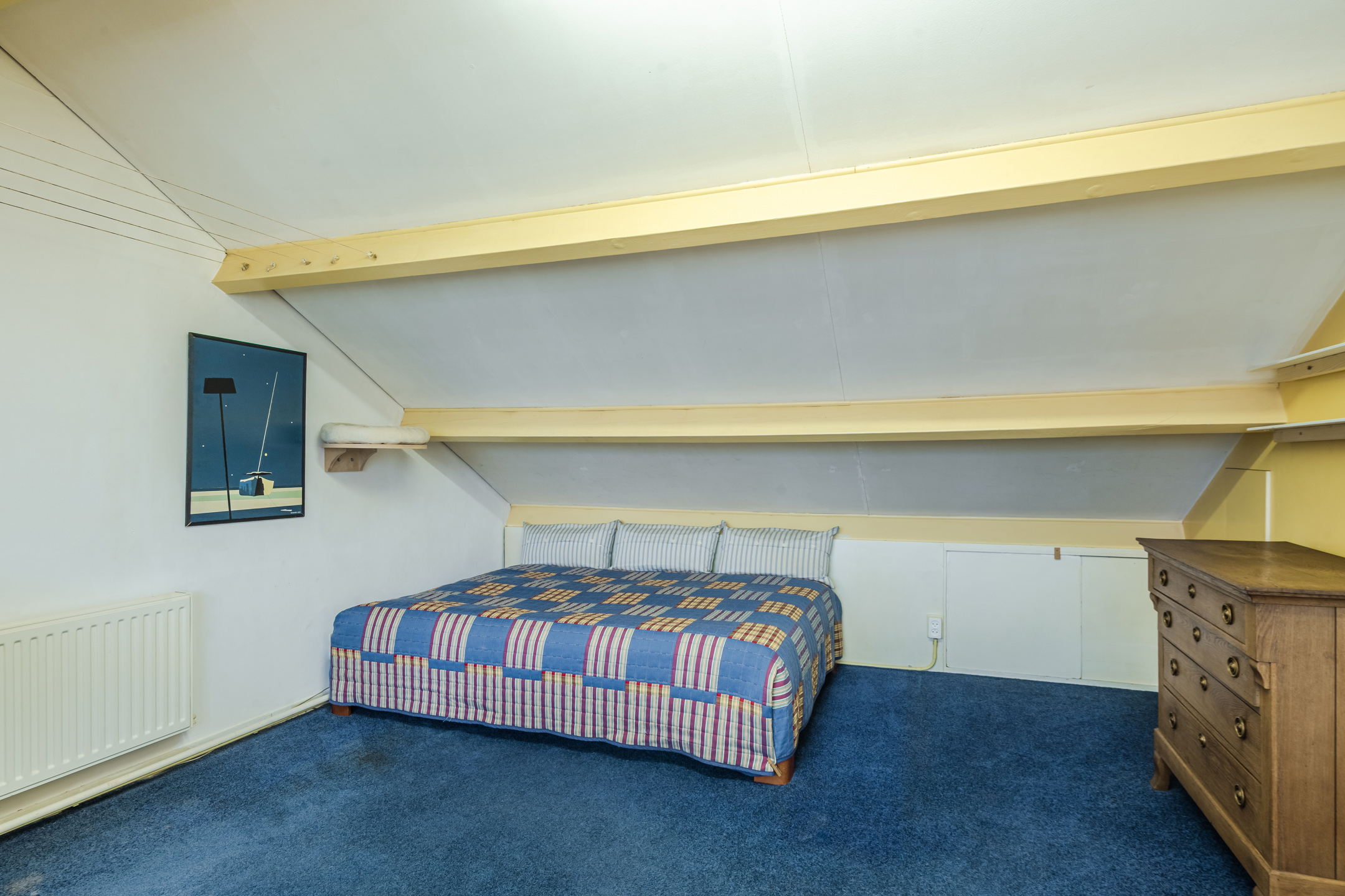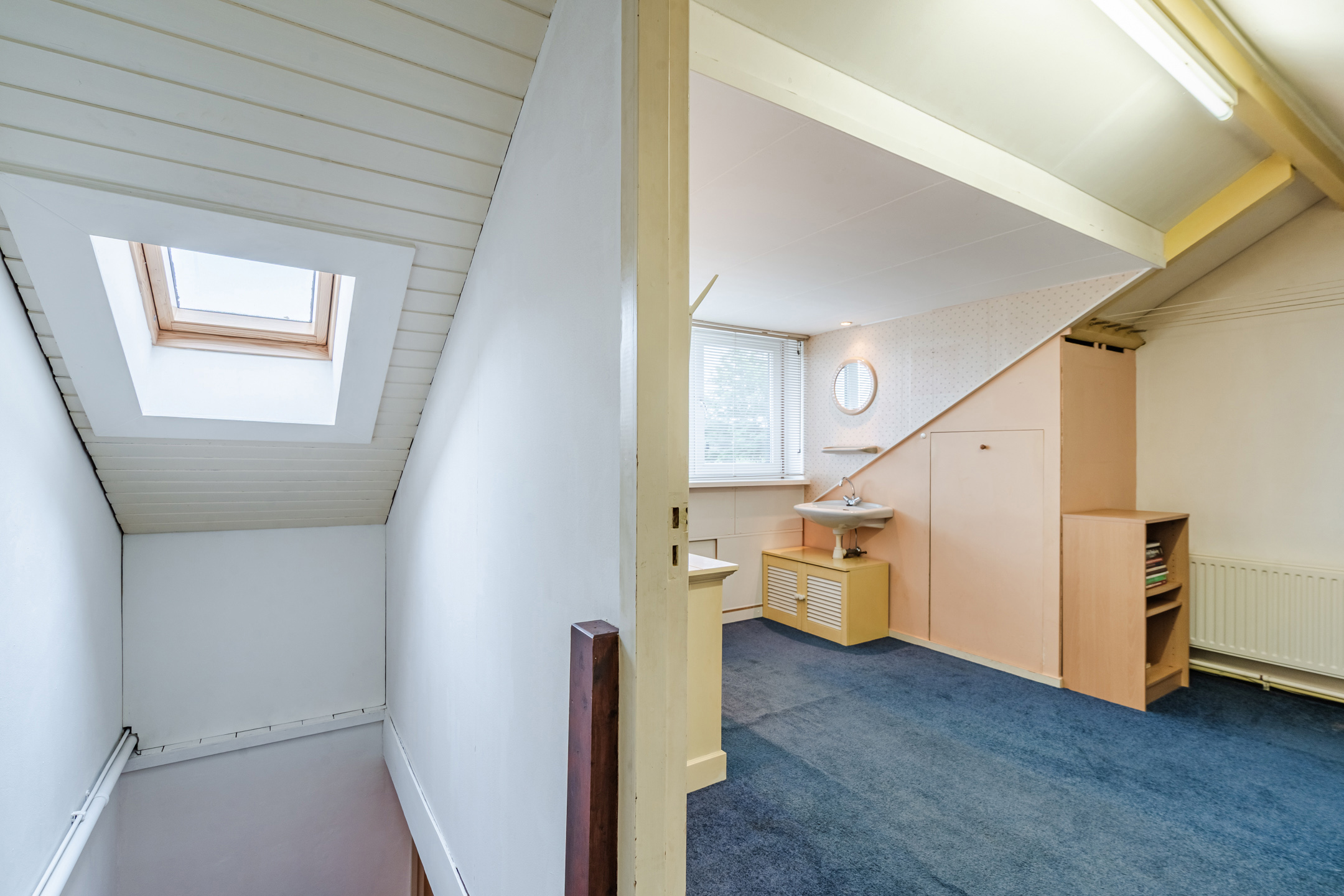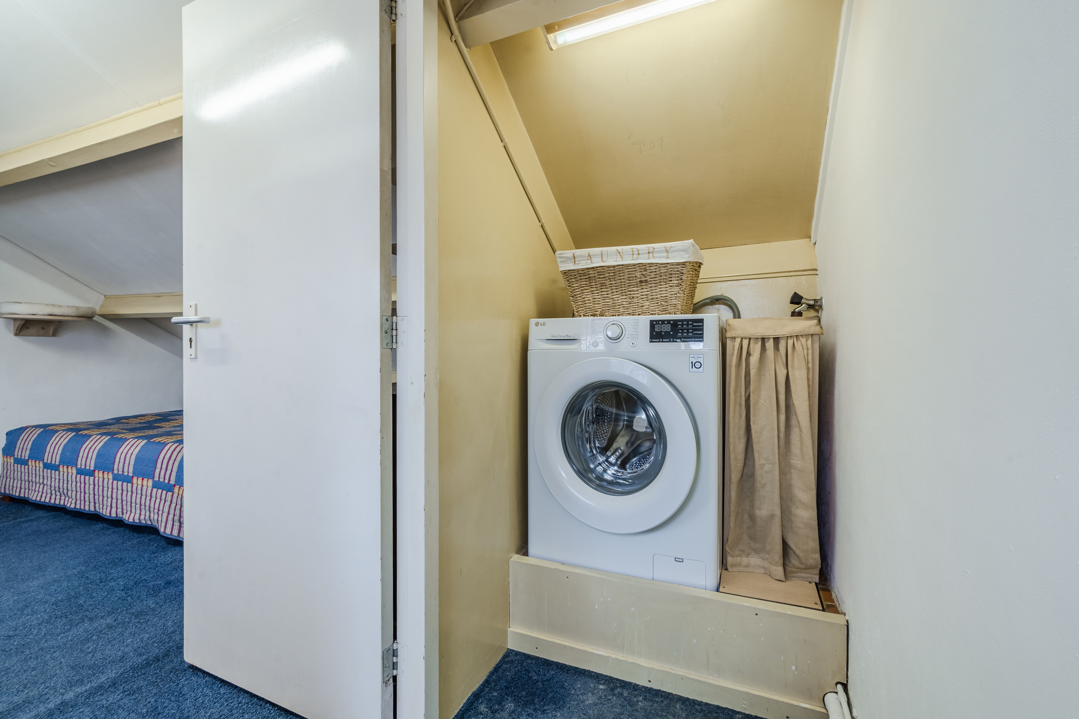 Vaste trap naar grote zolder met aparte 4e slaapkamer met eigen wastafel. De aansluitingen voor de witgoedopstelling bevinden zich op de overloop.