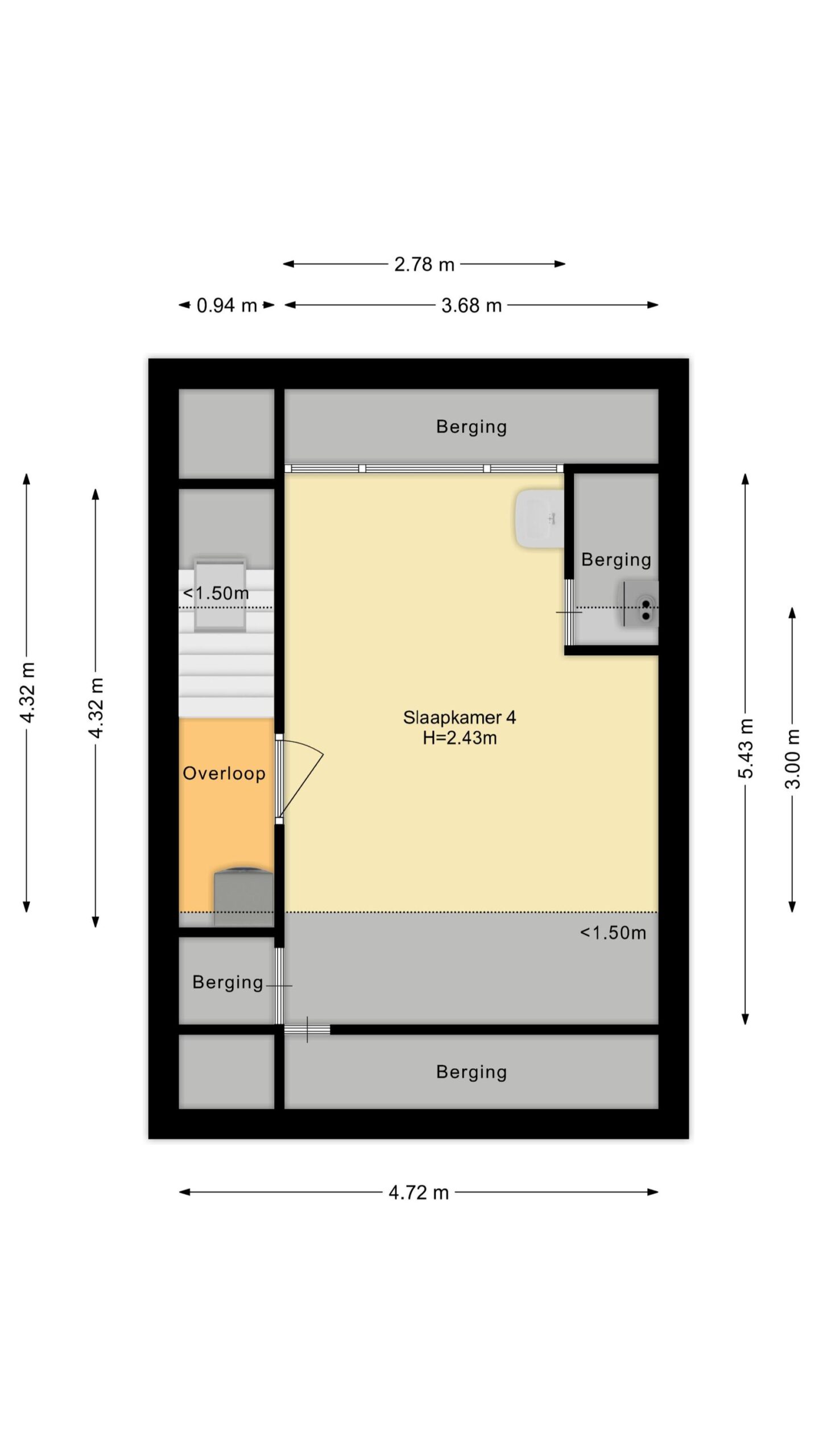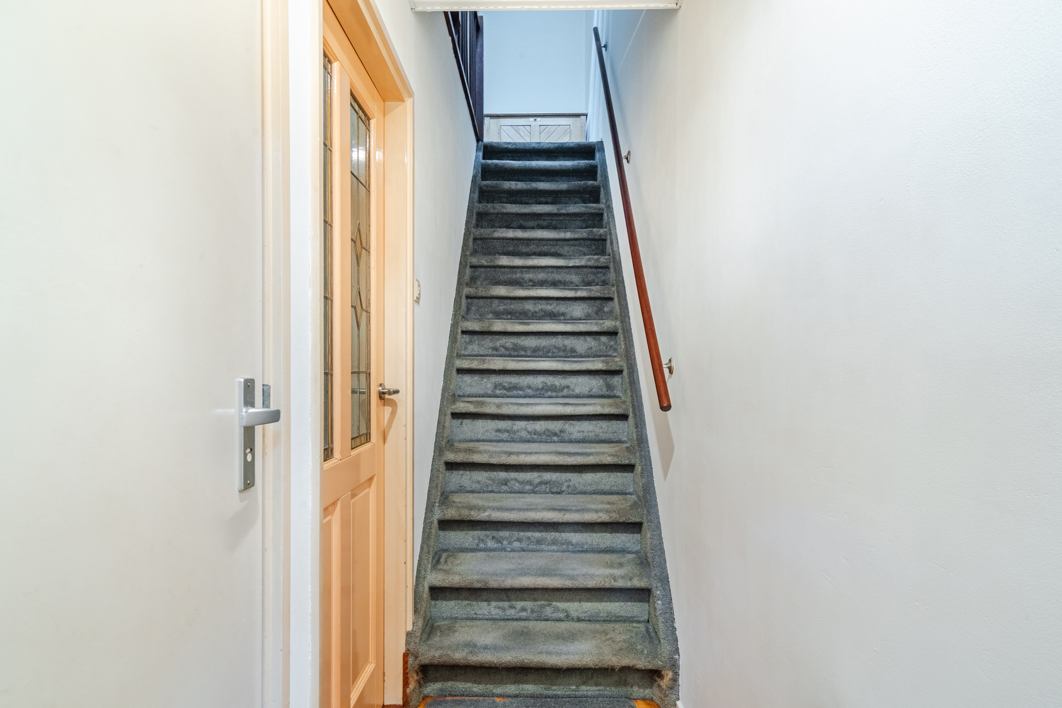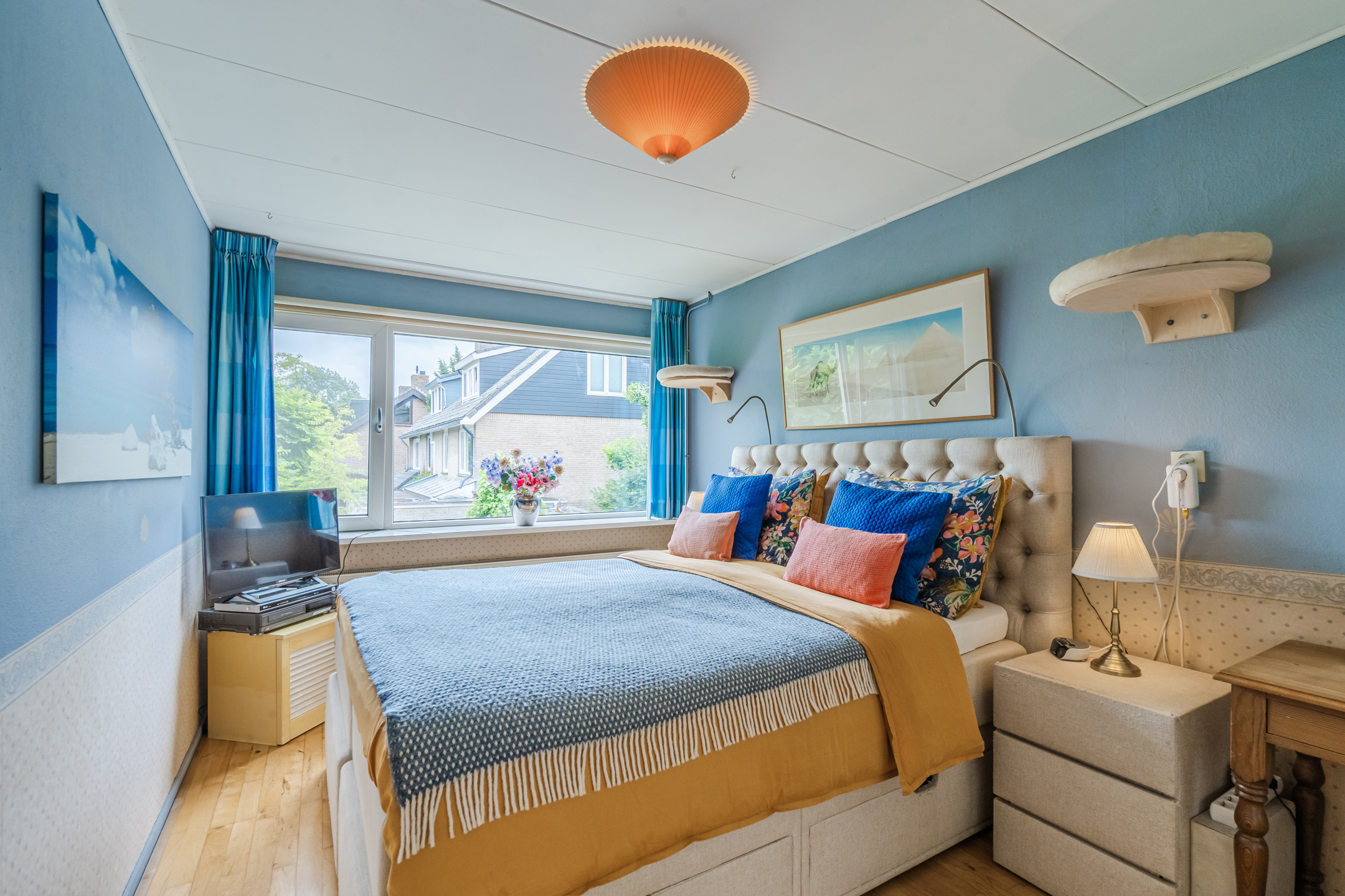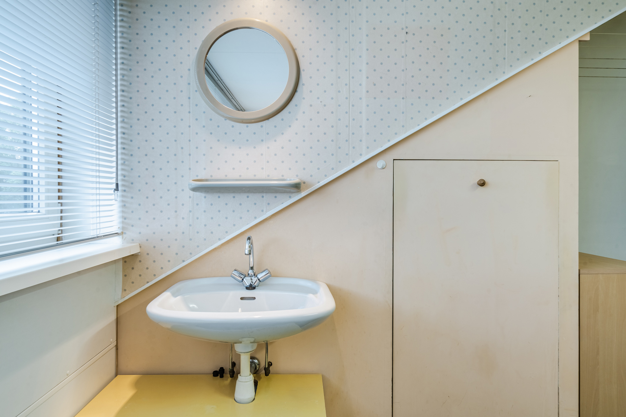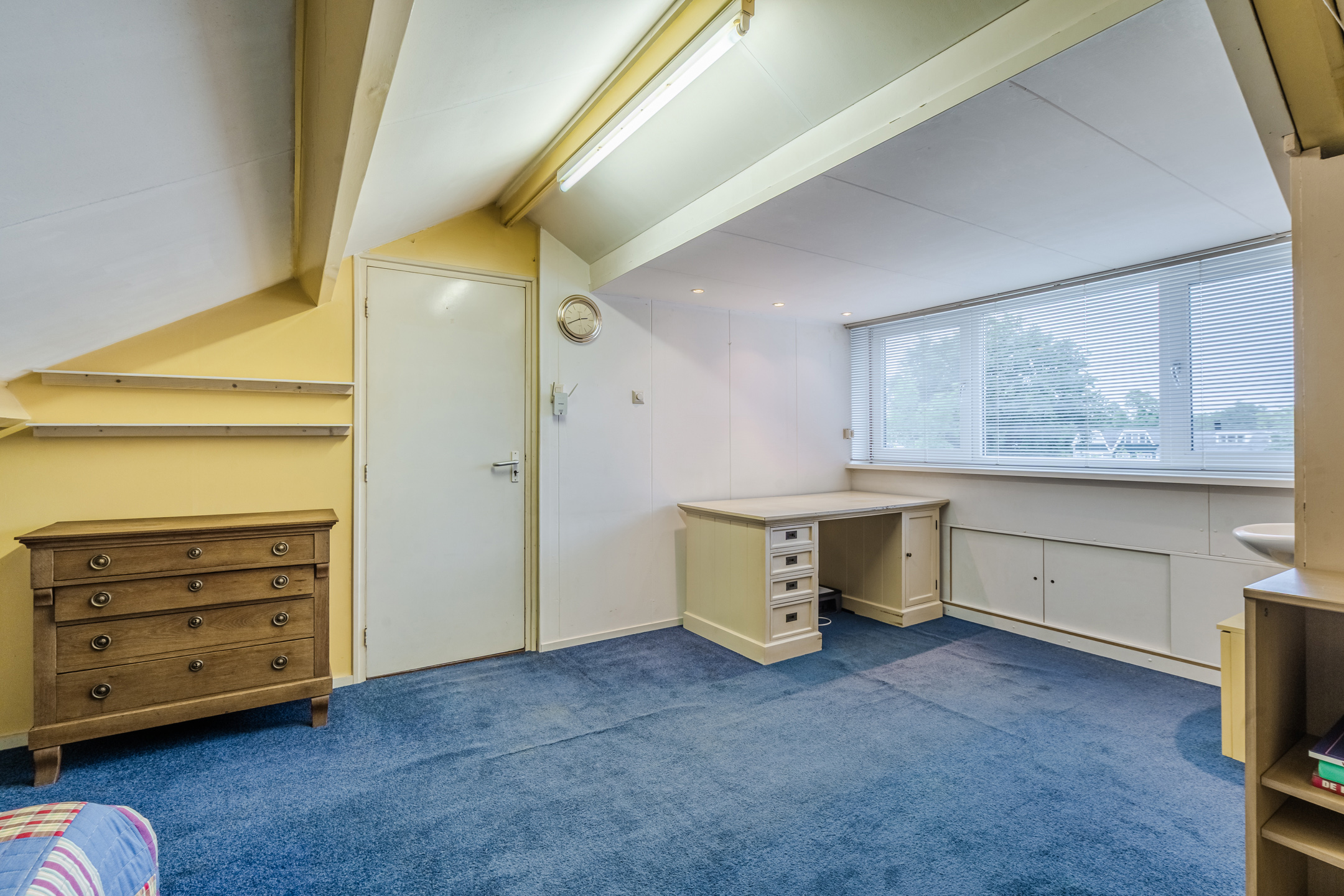 Vaste trap naar grote zolder met aparte 4e slaapkamer met eigen wastafel. De aansluitingen voor de witgoedopstelling bevinden zich op de overloop.