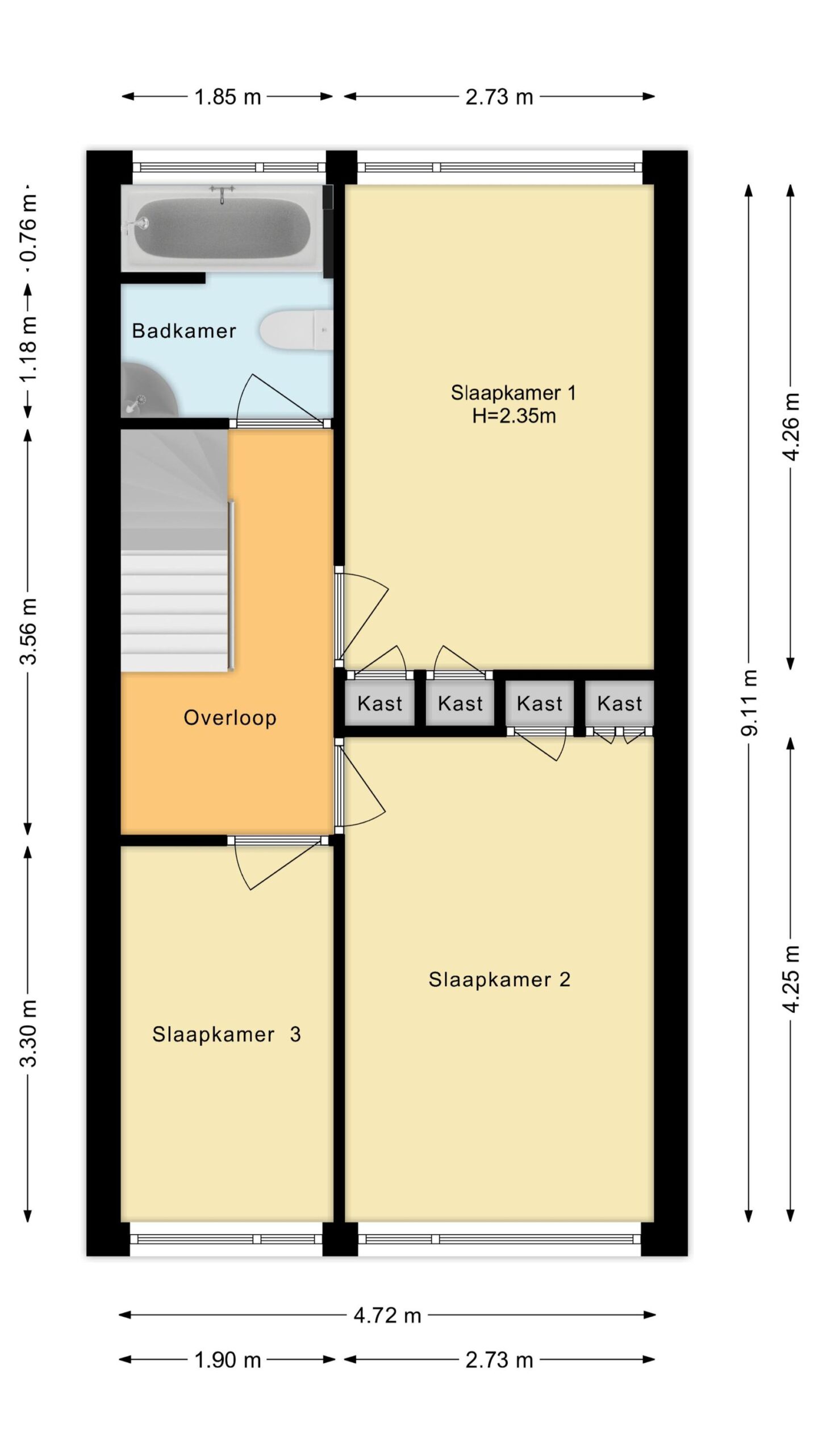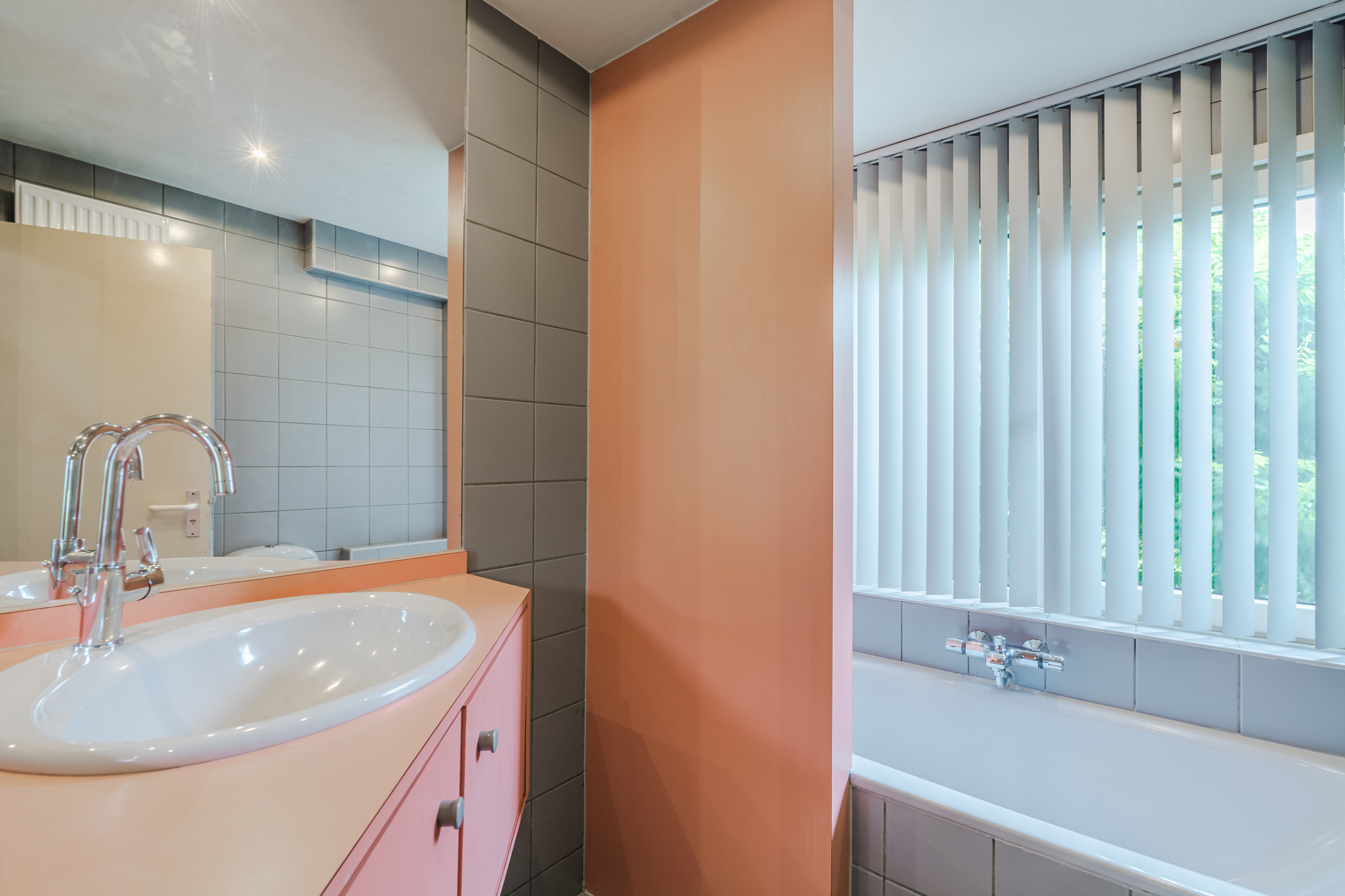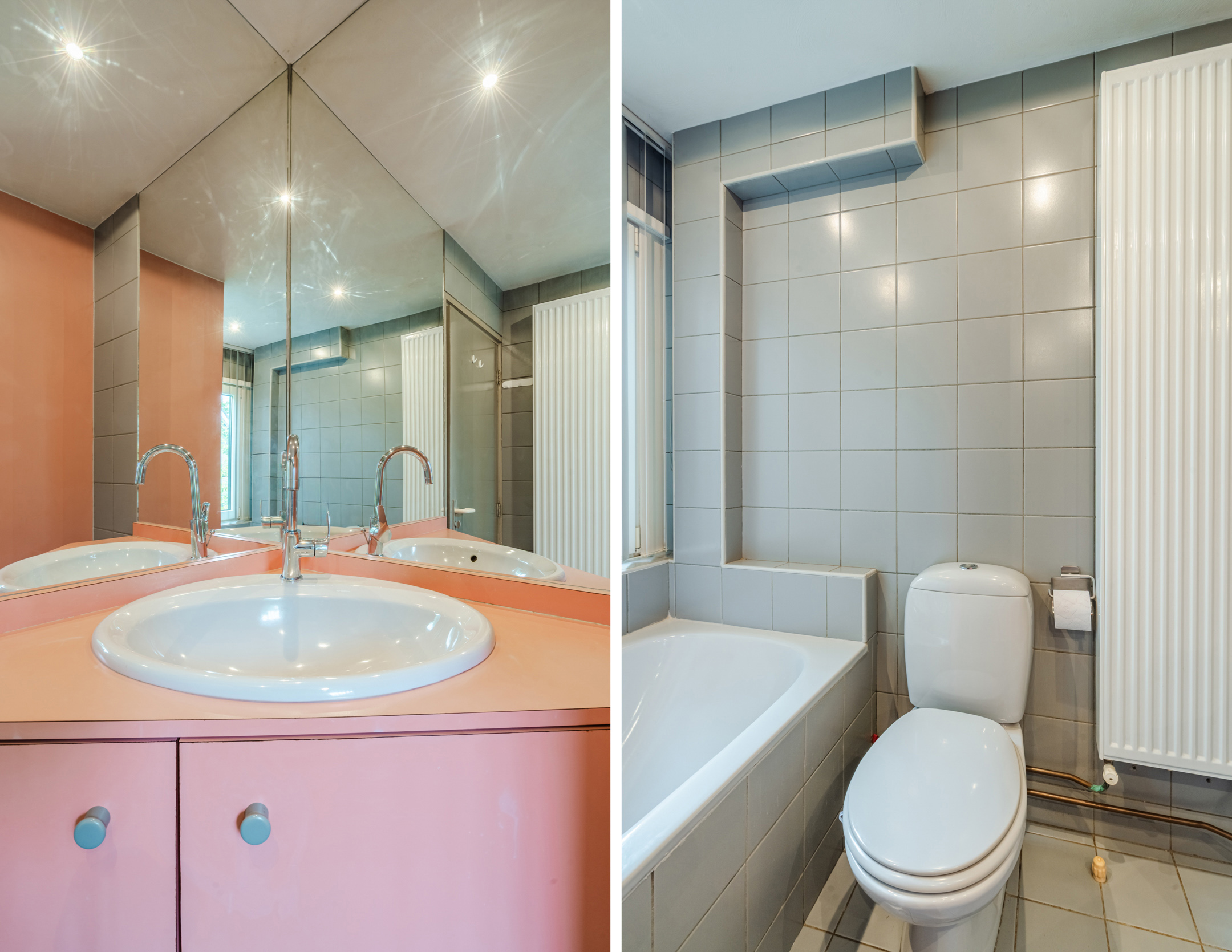 Overloop, 3 slaapkamers ā waarvan 2 met inbouwwandkasten ā en de badkamer met tweede toilet, wastafel met meubel en ligbad met douche.