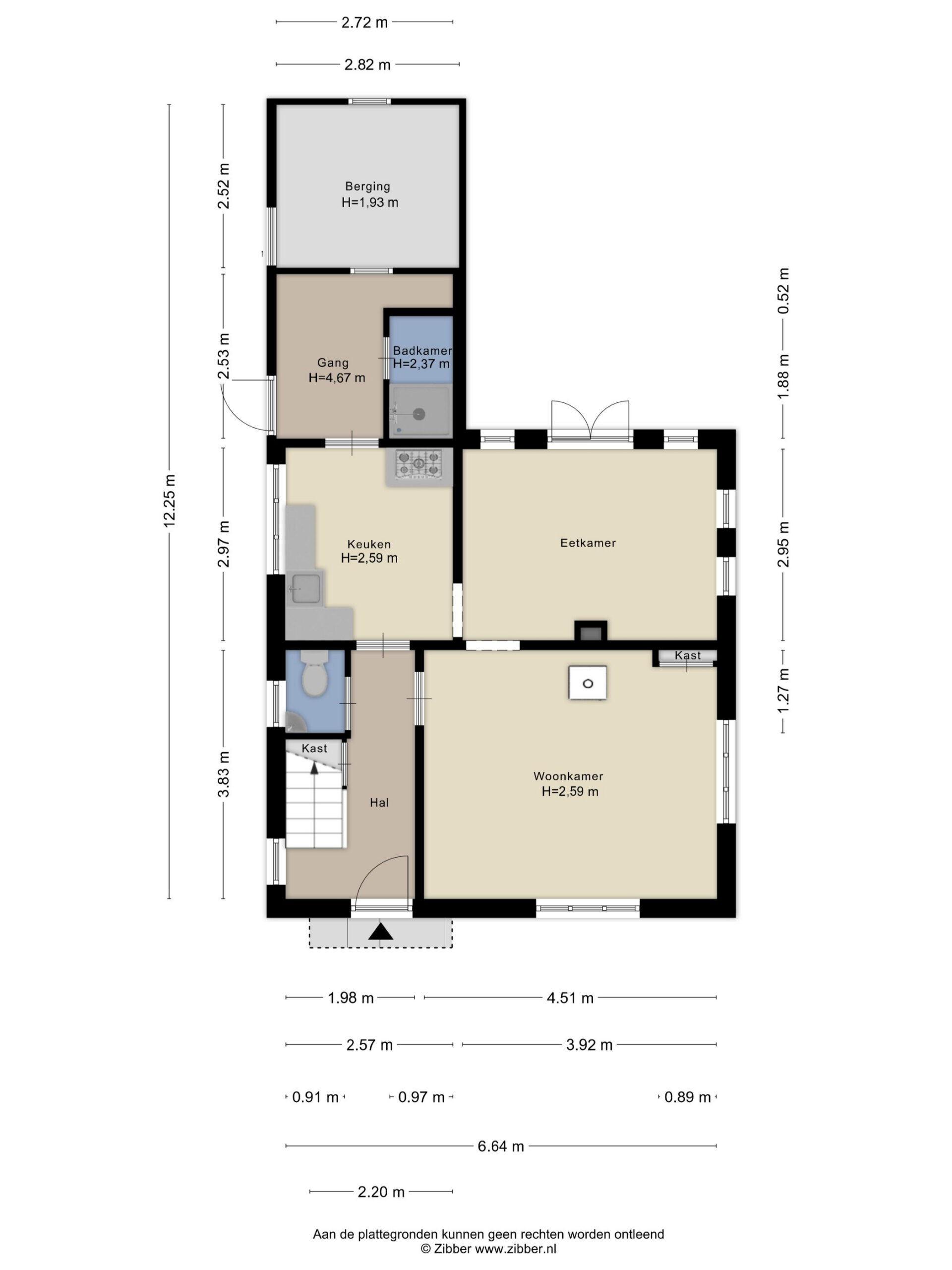 Via de eetkamer is de keuken bereikbaar, uitgevoerd in een eenvoudige opstelling. Achter de keuken bevinden zich een tussenhal, badkamer met douche en aangebouwd nog een berging.