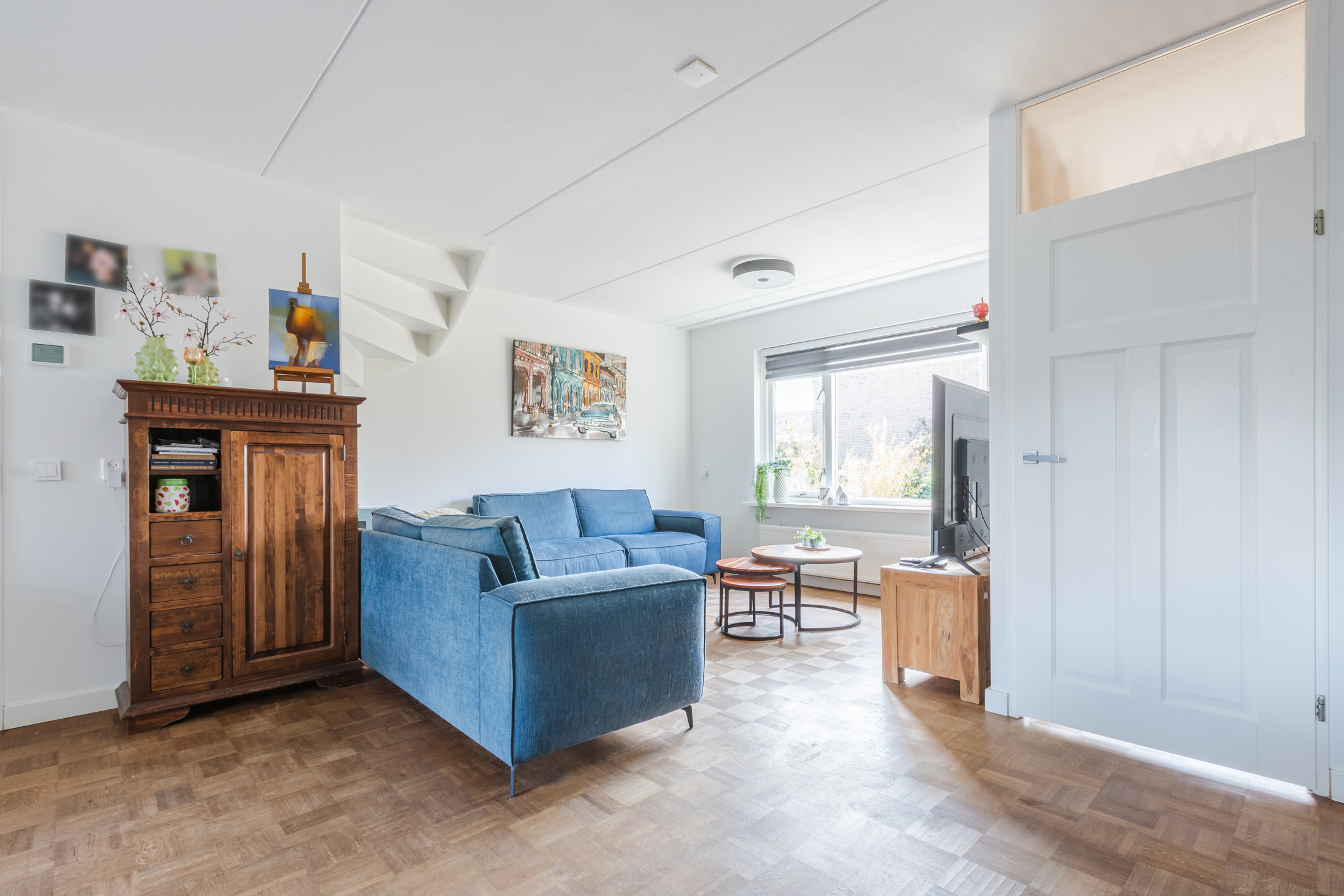 Entree via een verzorgde voortuin met haag en poortje. De hal biedt toegang tot de meterkast. De doorzonwoonkamer is heerlijk licht en voorzien van een warme parketvloer. De royale zithoek aan de voorzijde en de eetkamer aan de tuinzijde vormen samen een sfeervol geheel.