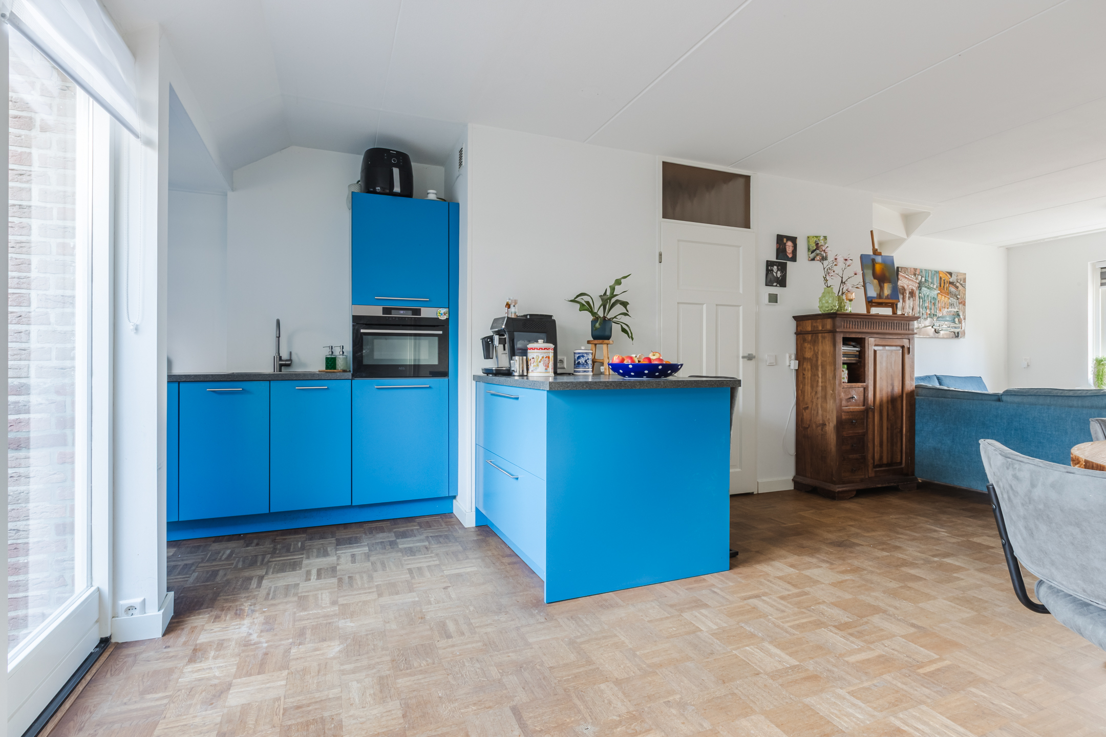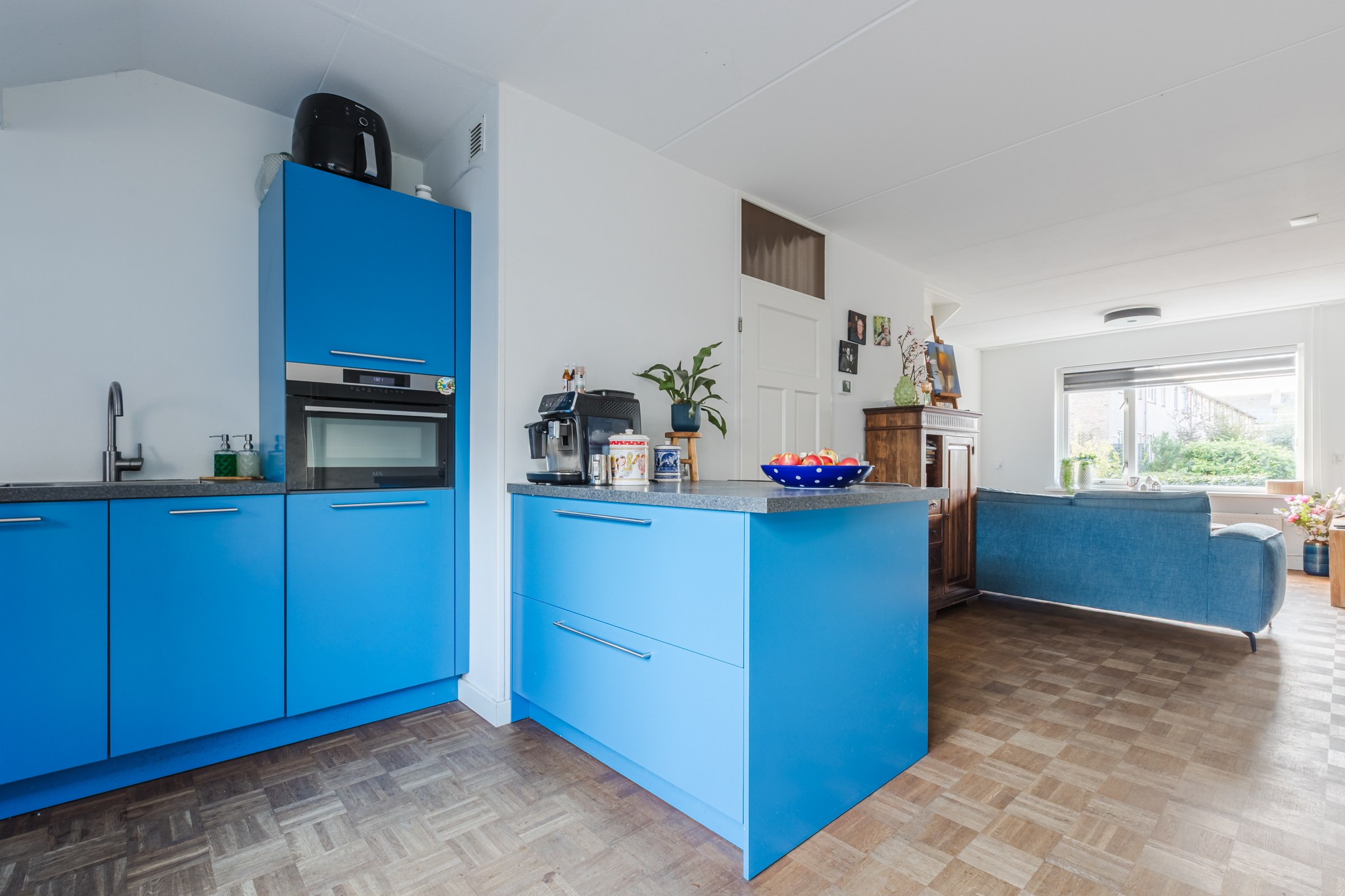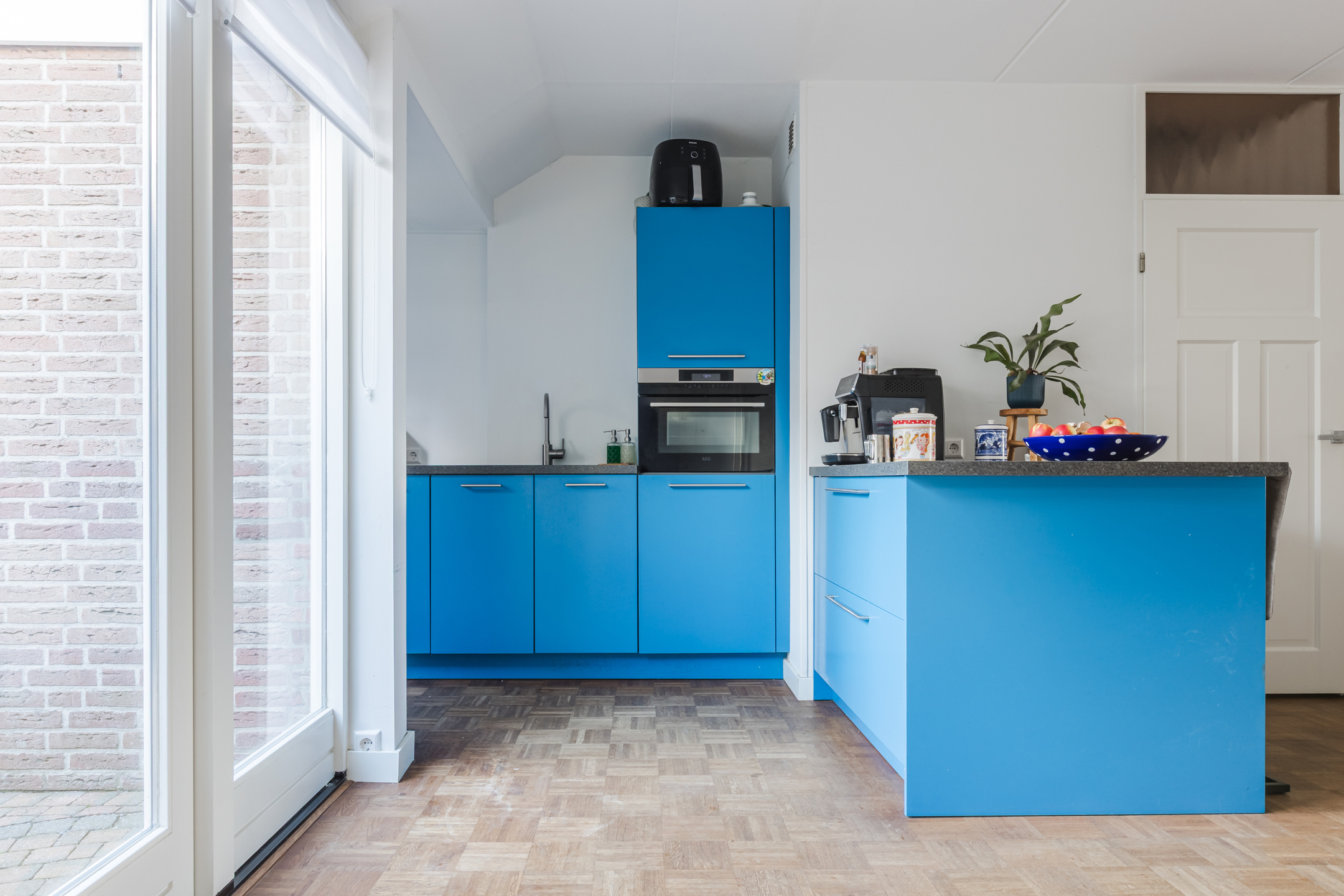 De moderne open keuken (2020) is in opvallende blauwe kleurstelling slim geplaatst in een L-opstelling met bar en is voorzien van diverse inbouwapparatuur zoals een inductiekookplaat, combimagnetron, vaatwasser, koel-vriescombinatie en een strak werkblad. Vanuit de keuken en eetkamer heb je via openslaande deuren direct toegang tot de zonnige tuin.