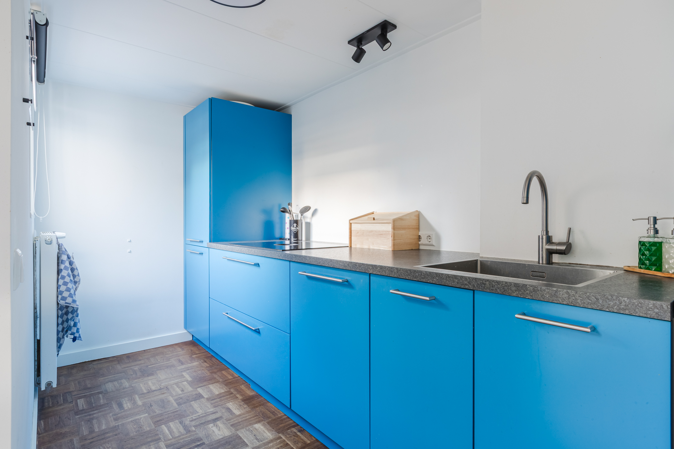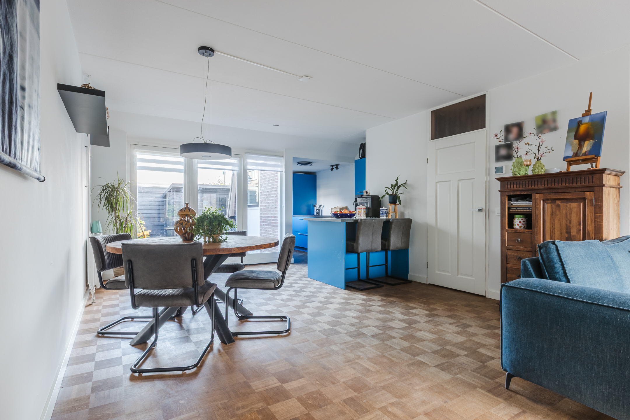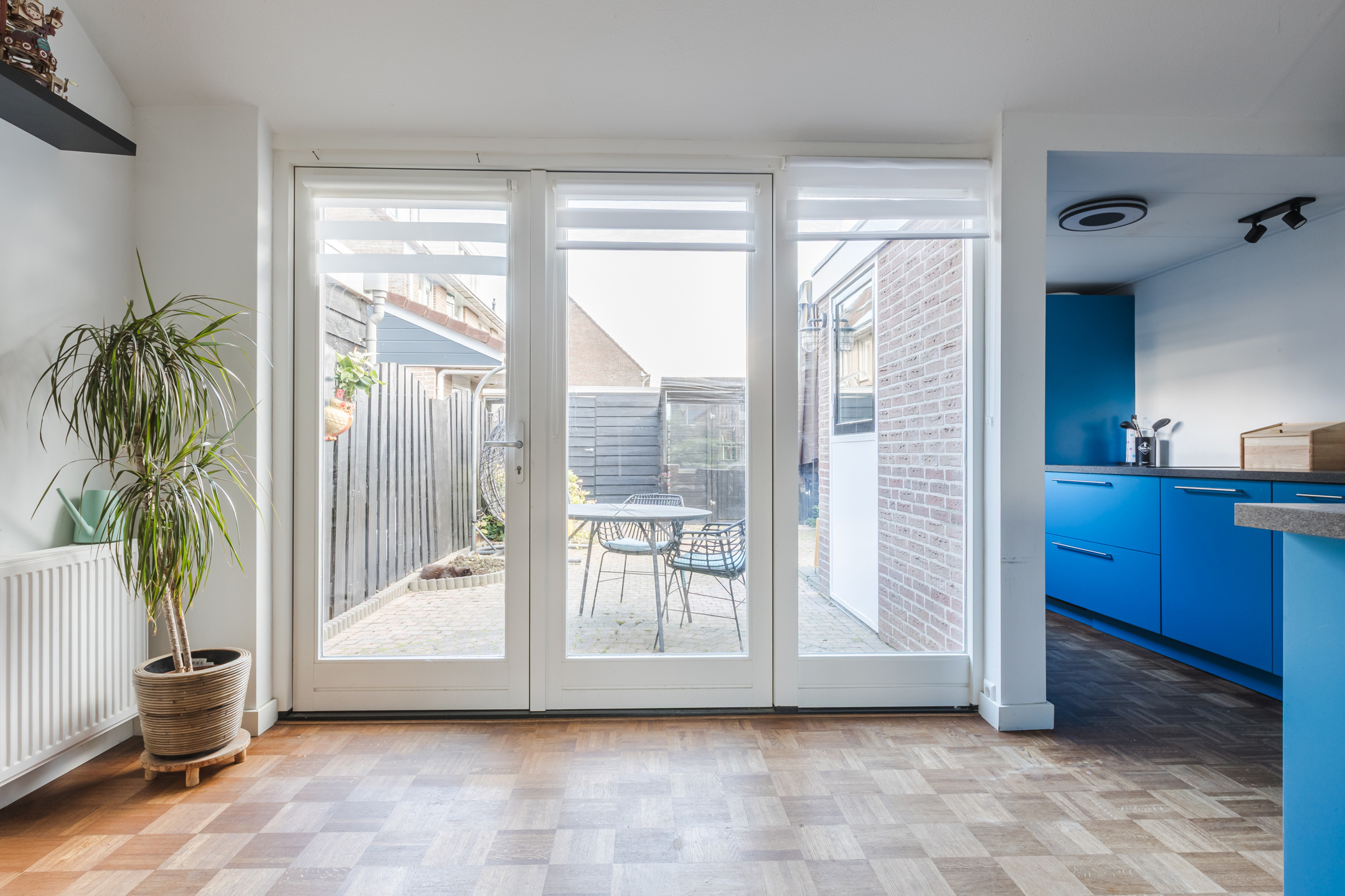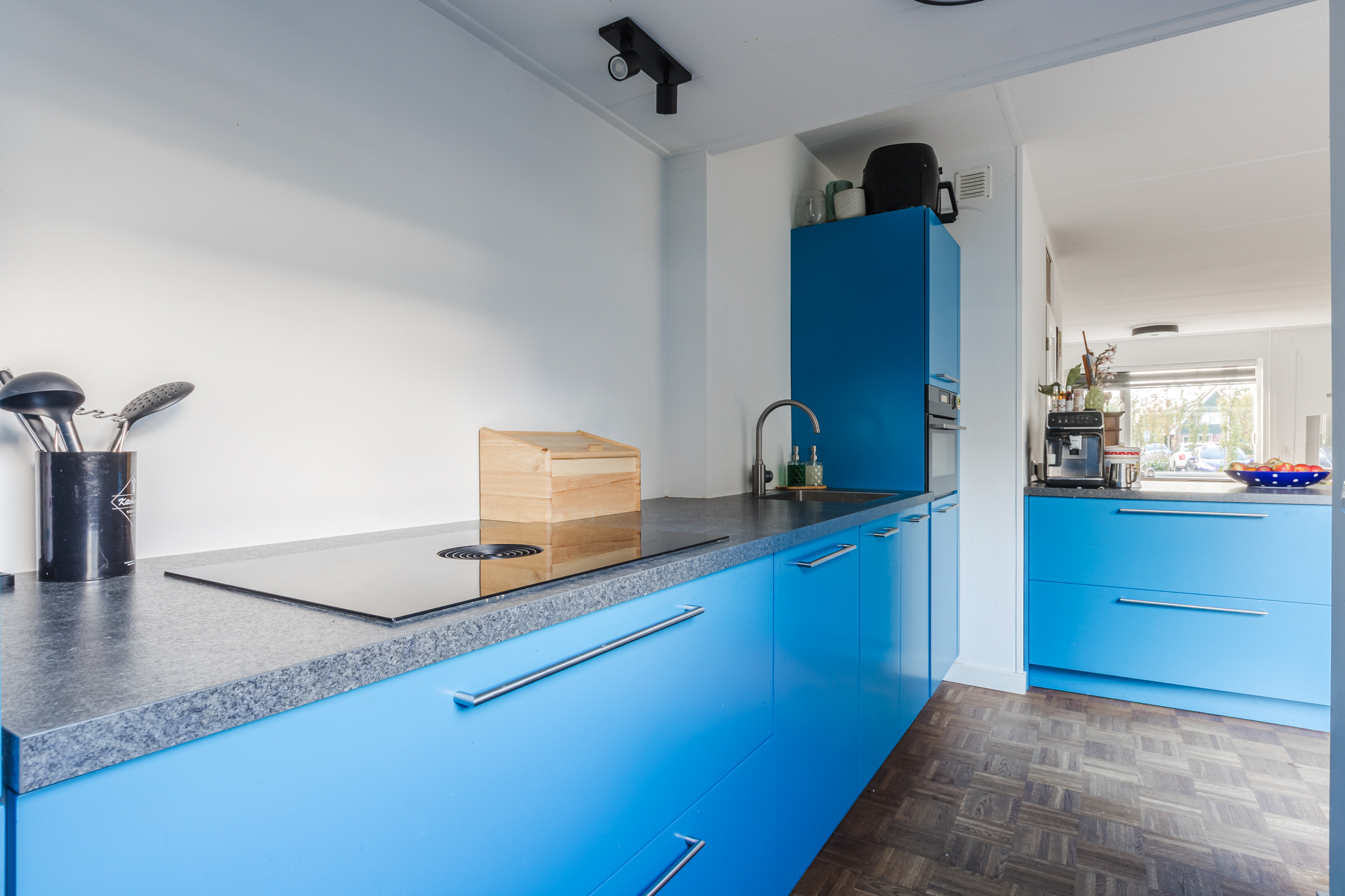 De moderne open keuken (2020) is in opvallende blauwe kleurstelling slim geplaatst in een L-opstelling met bar en is voorzien van diverse inbouwapparatuur zoals een inductiekookplaat, combimagnetron, vaatwasser, koel-vriescombinatie en een strak werkblad. Vanuit de keuken en eetkamer heb je via openslaande deuren direct toegang tot de zonnige tuin.