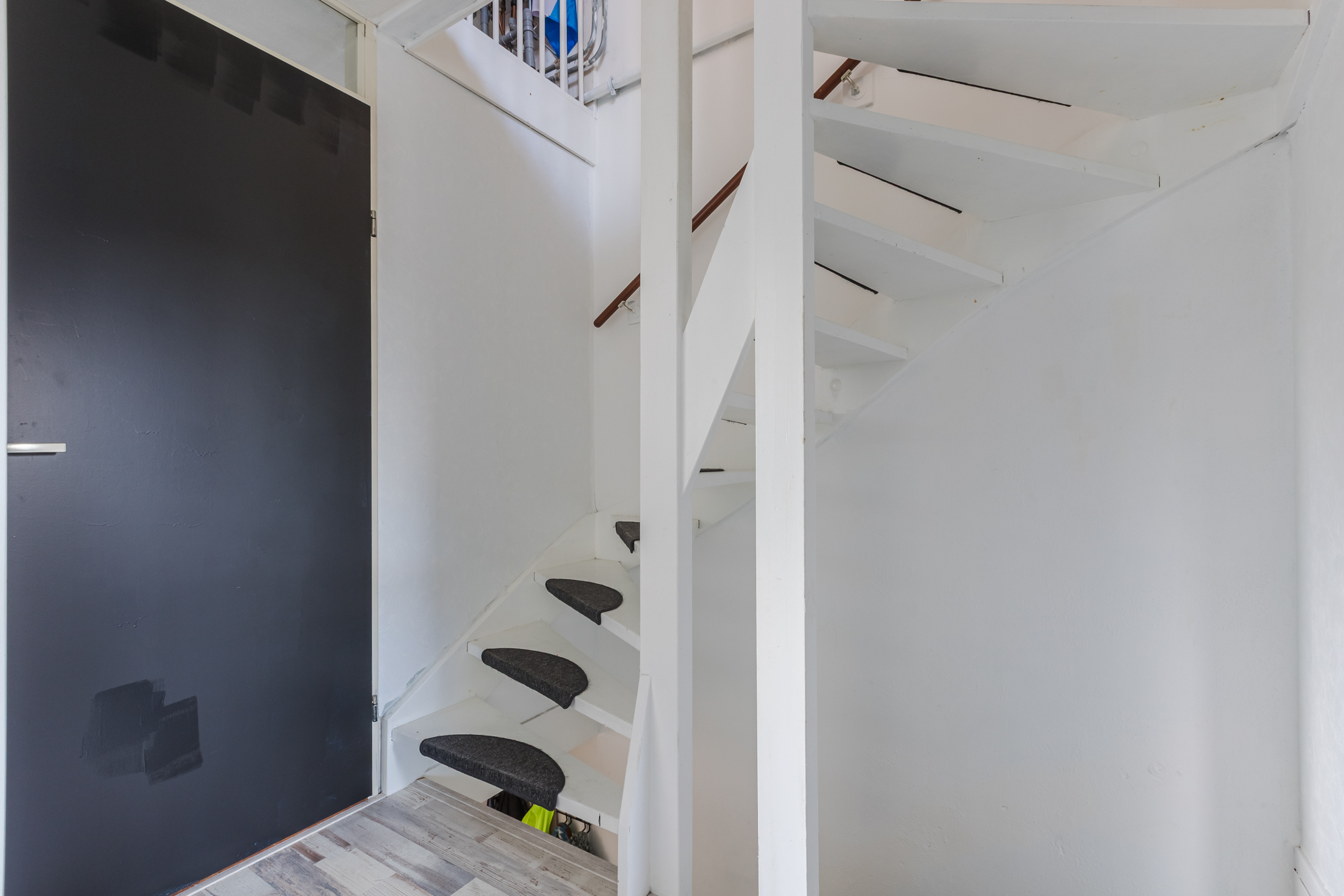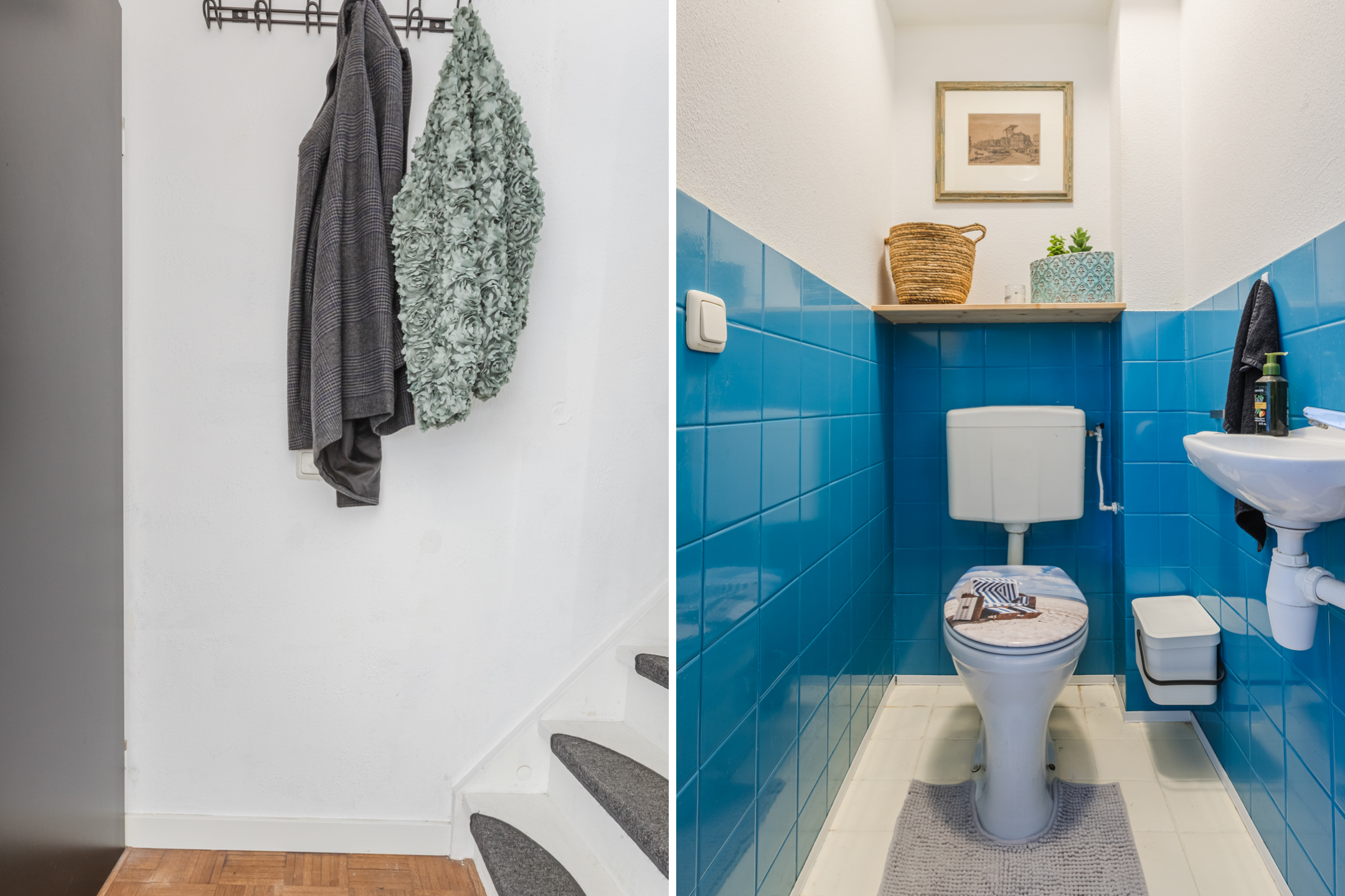Via de tussenhal met een kleurrijk betegeld toilet met fonteintje bereik je via de trap een