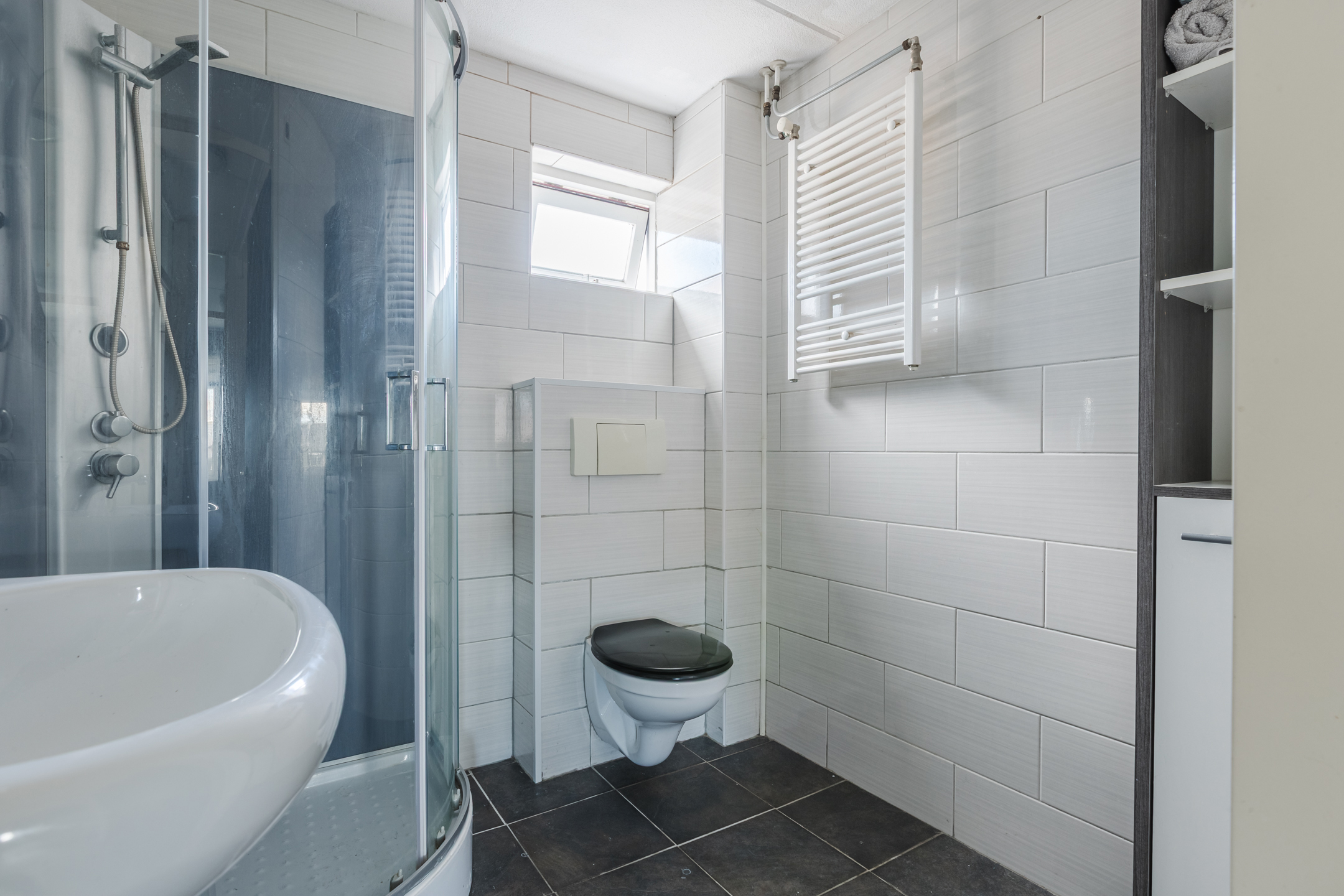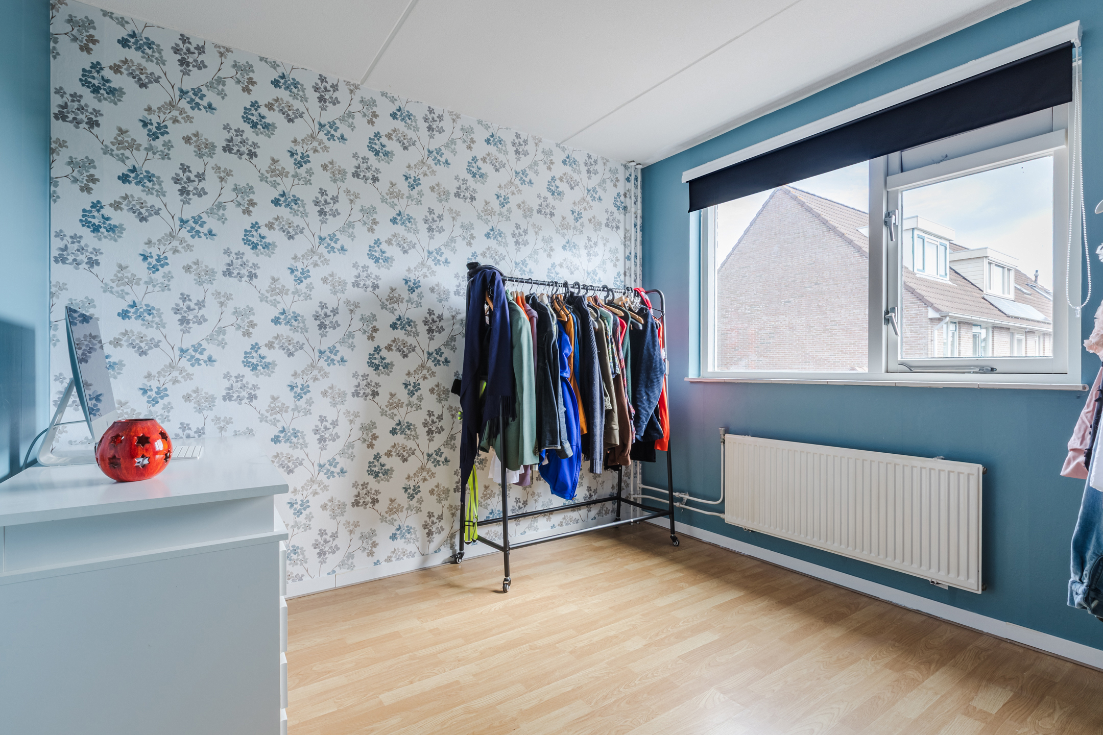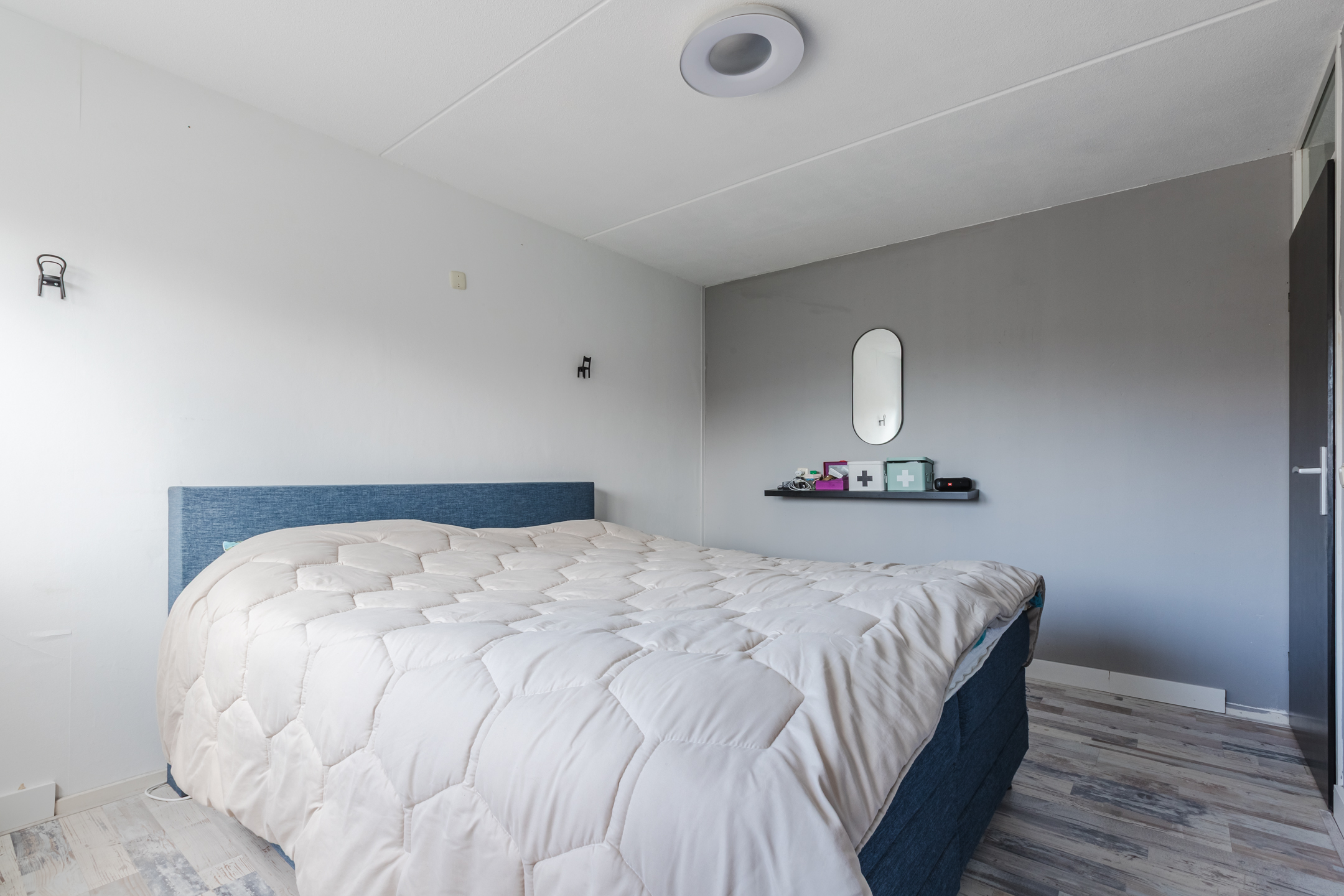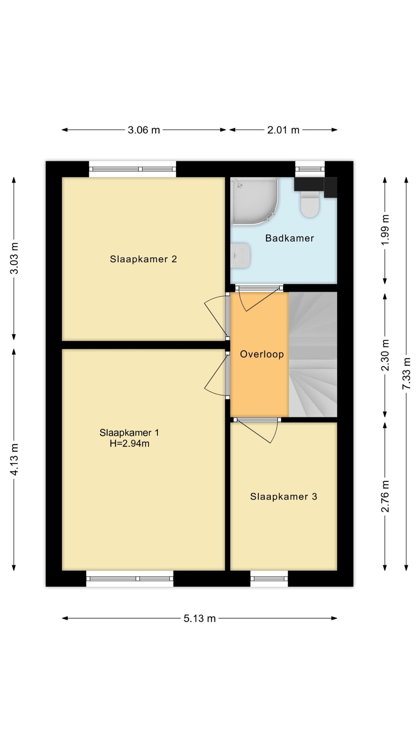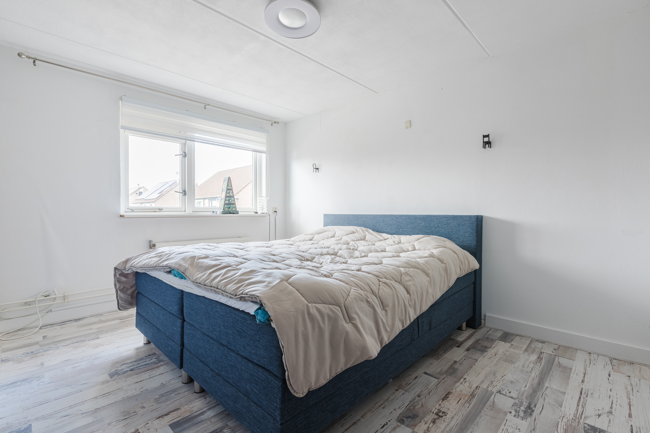 ruime overloop met toegang tot drie lichte slaapkamers, waarvan de hoofdslaapkamer over de volledige breedte is gelegen. Alle kamers zijn voorzien van een nette laminaatvloer, kleurrijk behang en goede daglichttoetreding. De badkamer (1999) is praktisch ingericht met een luxe douchecabine, wastafel, spiegel en een wandcloset.