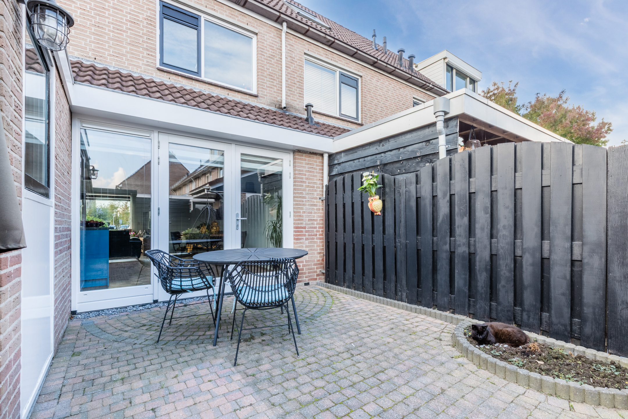 De onderhoudsvriendelijke achtertuin is op het oosten gelegen en is strak aangelegd met sierbestrating, een terras en een berging. Er is tevens een achterom aanwezig.