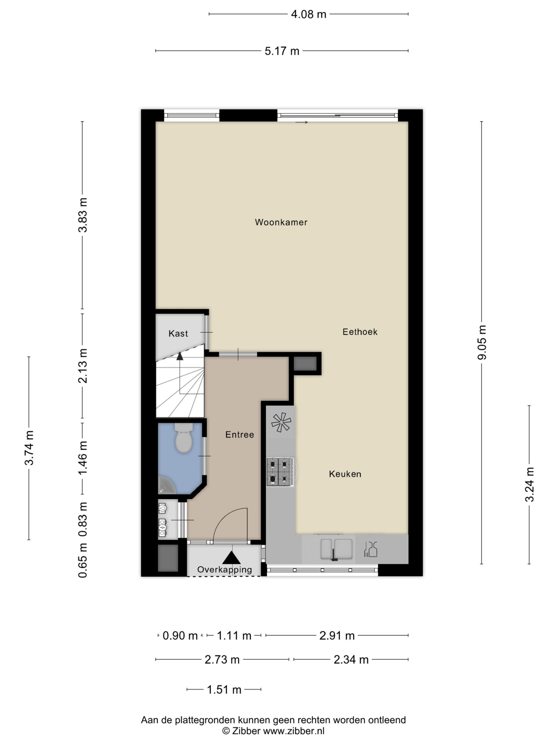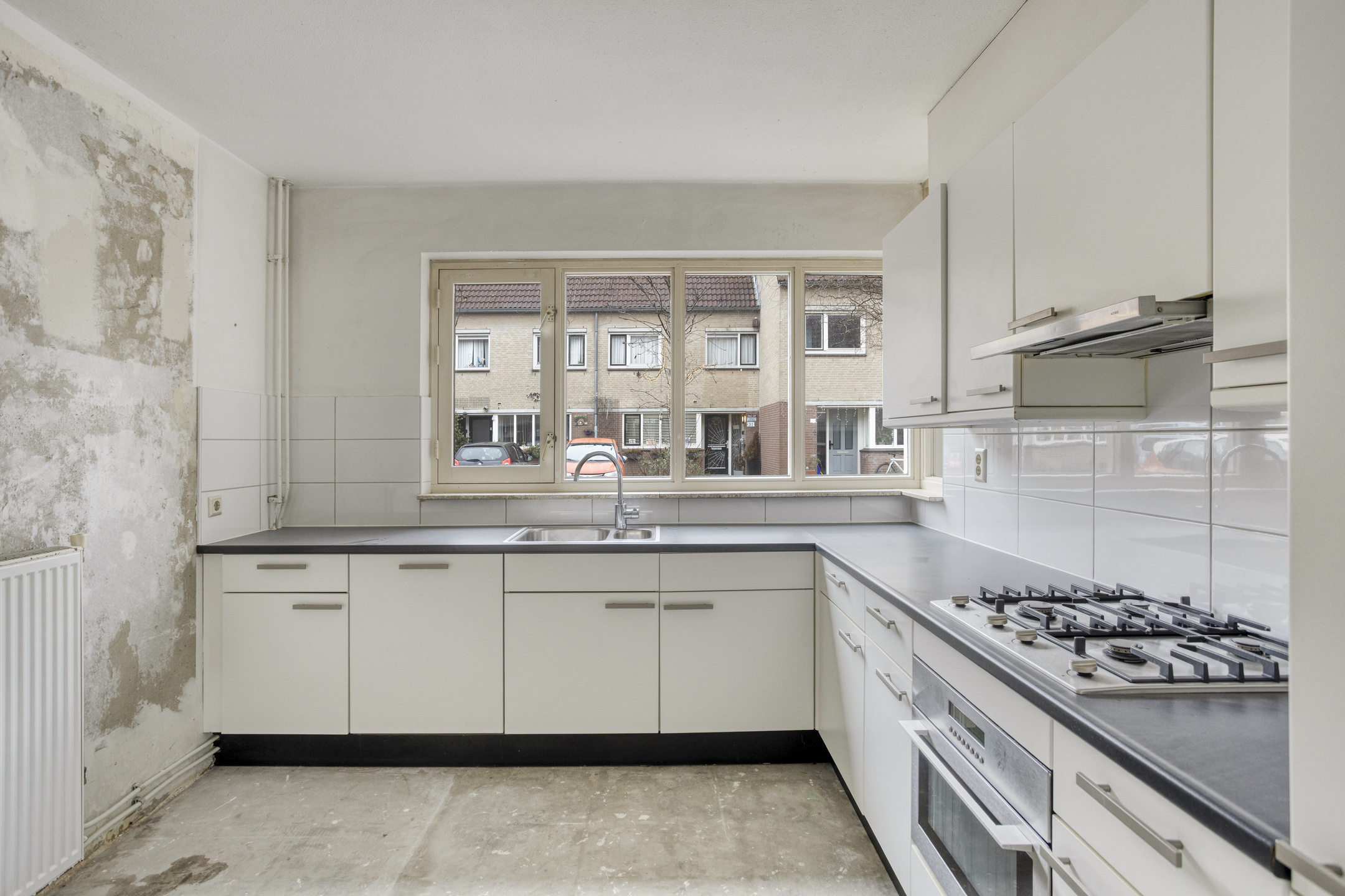 You enter the home from the street side. The hallway gives access to the toilet, the stairs to the first floor, and the living room. The living room forms the heart of the ground floor and is wonderfully bright thanks to the open layout and large windows. There is ample space for a comfortable seating area and a generous dining area. Through the sliding door, you have direct access to the backyard. At the front of the house is the open kitchen with an L-shaped countertop, equipped with a gas stove, sink, built-in oven combination, refrigerator, dishwasher, and plenty of storage space. The kitchen provides a solid base and can be fully modernized to your own taste.