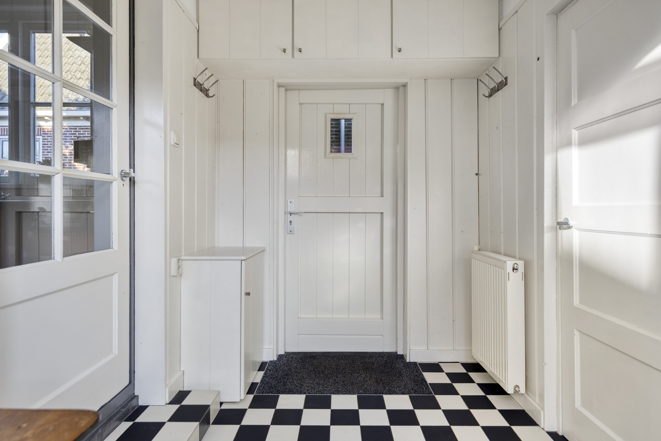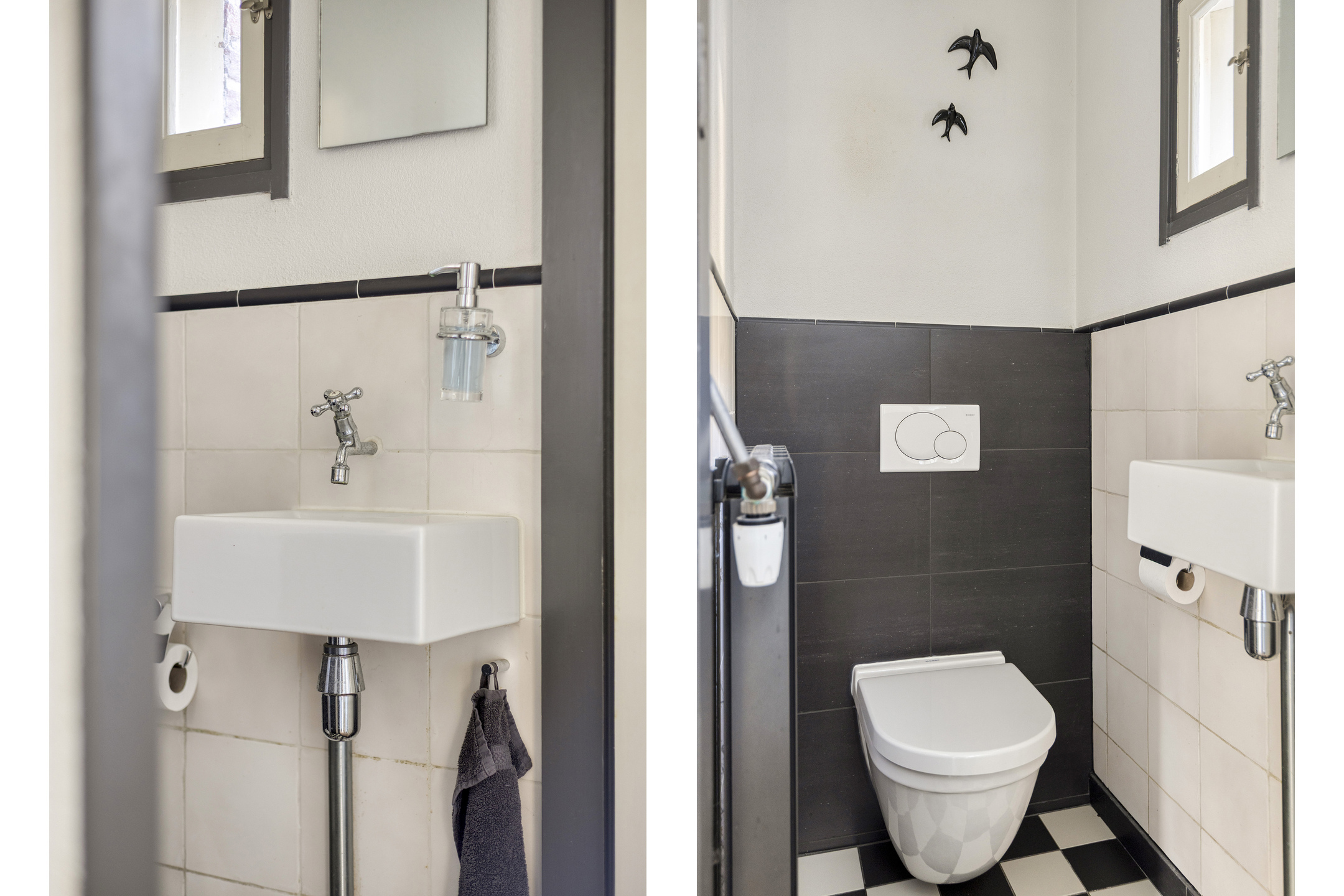 The kitchen adjoins the hallway and is practically laid out with two worktops along the wall and a black-and-white tiled floor that creates a playful accent. The kitchen is equipped with a gas stove with extractor hood, an oven, a sink with tap, a dishwasher and ample storage space. The kitchen is ready to move into but also offers opportunities to modernize to your own taste. From the kitchen there is direct access to an original basement storage space (cellar), which is dry and in good condition. Through a small additional hallway you reach the utility room with connections for a washing machine and dryer — a practical and functional addition.