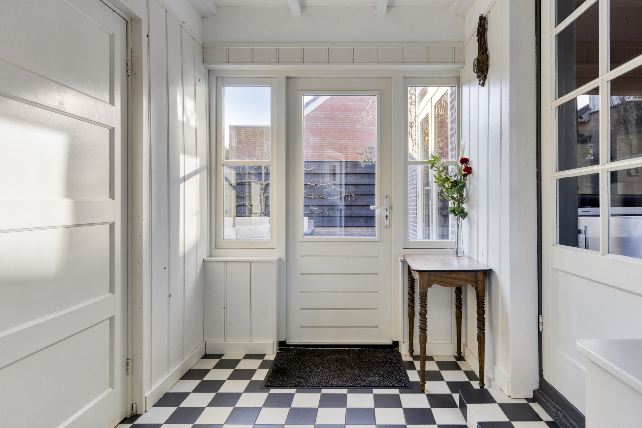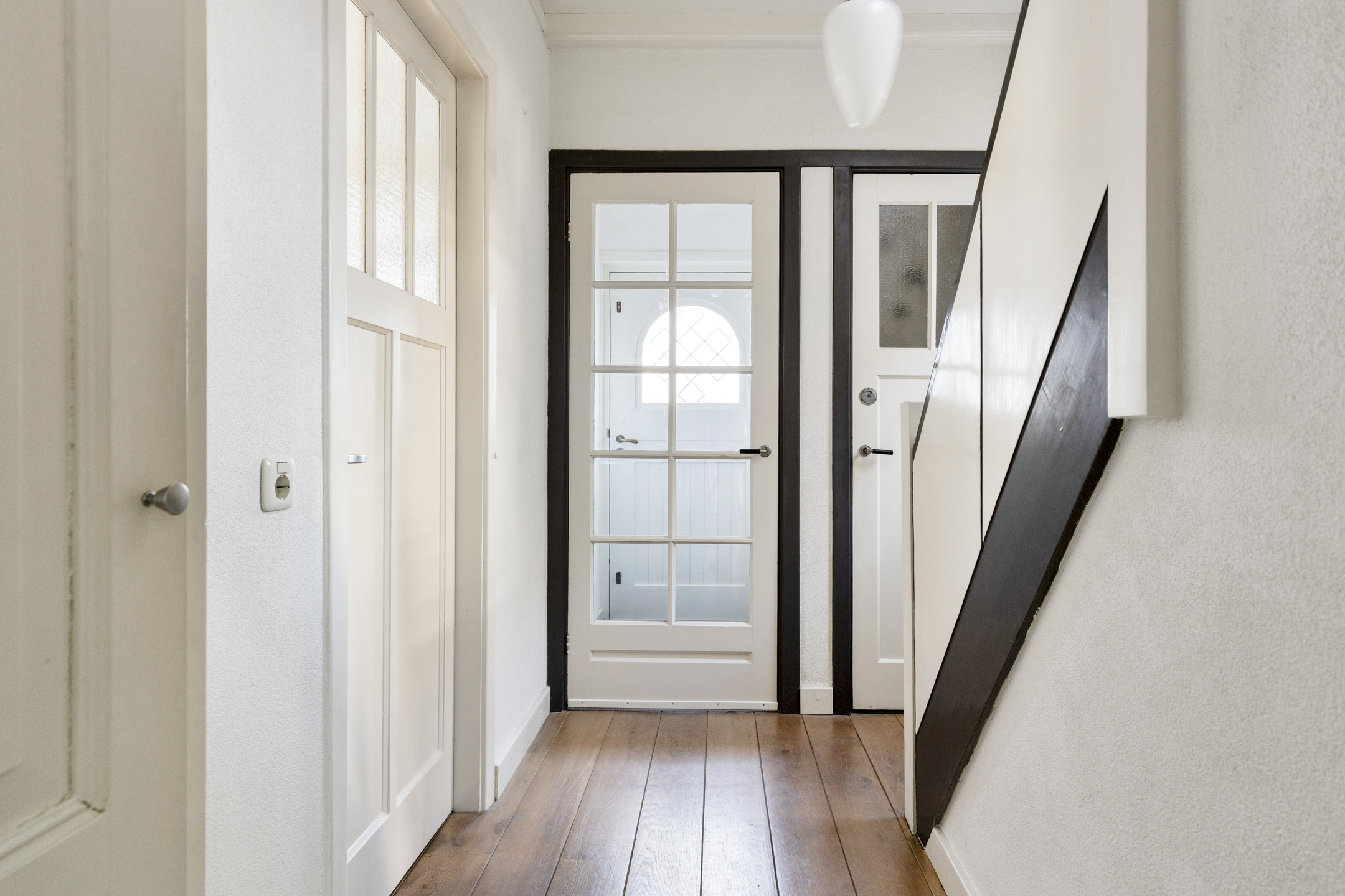 Via de voortuin betreedt u de woning. In de hal vallen direct de karakteristieke elementen op. Hier vindt u de toegang tot de woonkamer, de keuken, de toiletruimte en de trap naar de 1e verdieping.