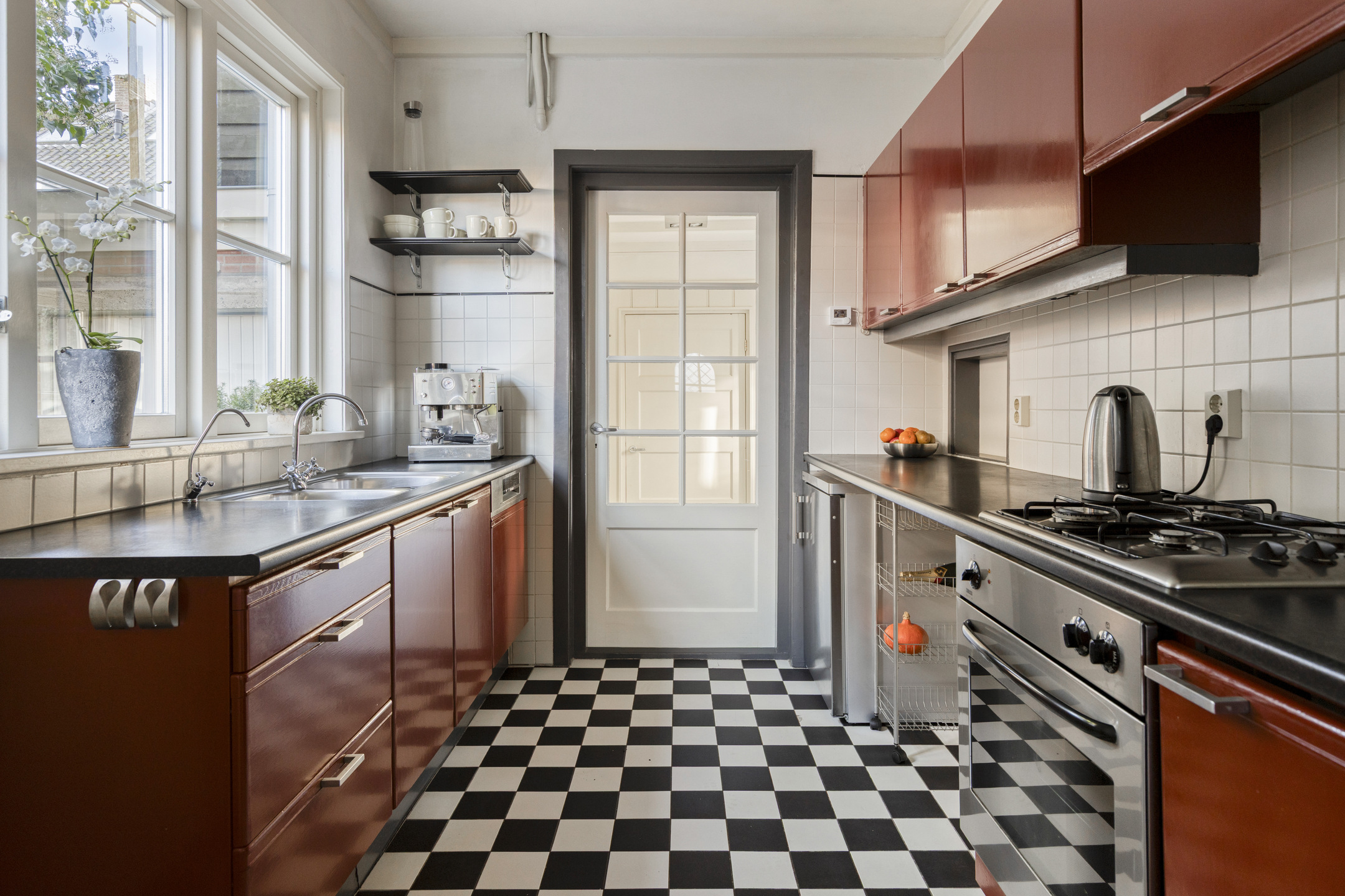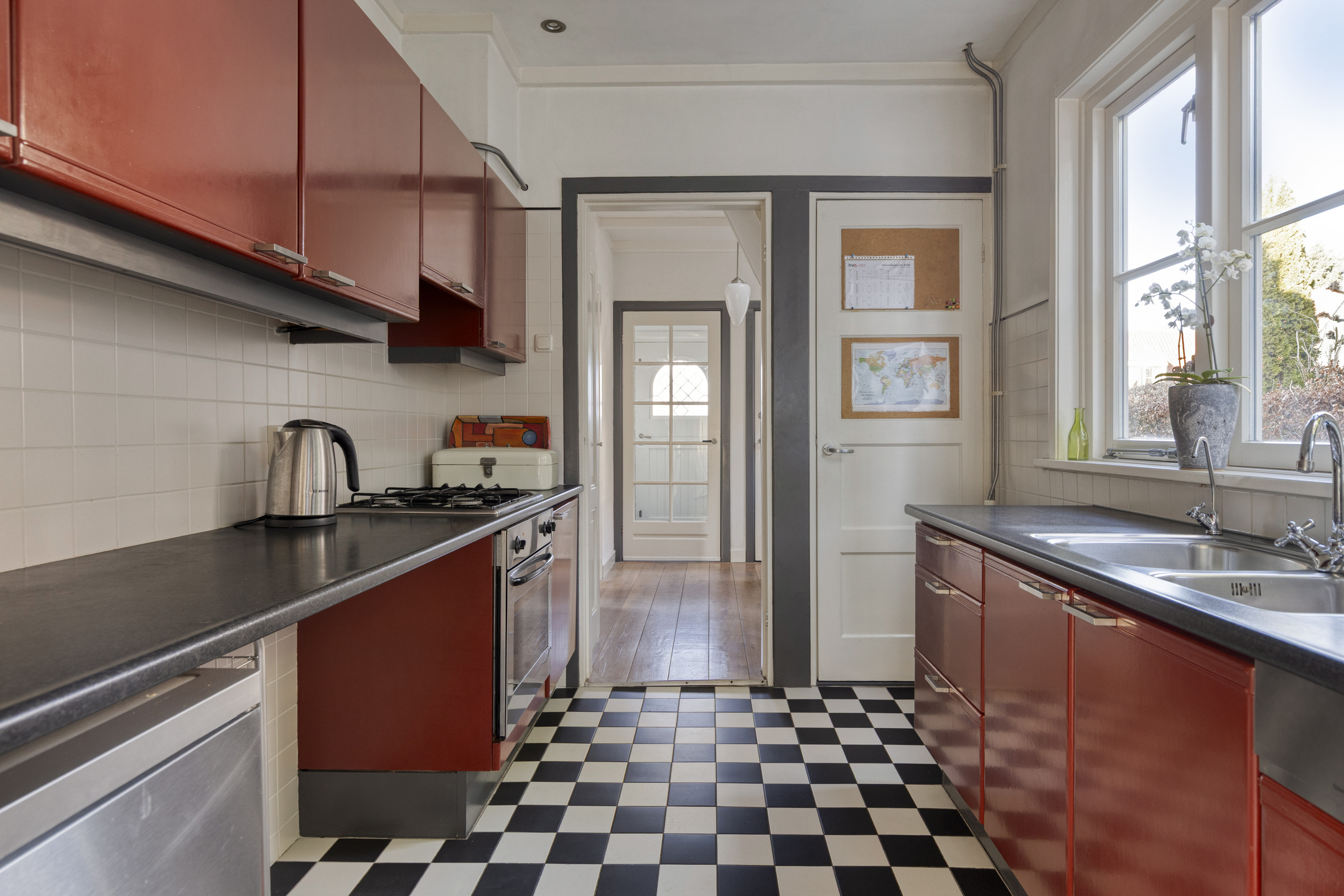 De keuken grenst aan de hal en is praktisch ingericht met twee aanrechten langs de wand en een zwart-witte tegelvloer die zorgt voor een speels accent. U beschikt hier over een gasfornuis met afzuigkap, een oven, een spoelbak met kraan, een vaatwasmachine en volop opbergruimte. De keuken is instapklaar, maar biedt ook mogelijkheden om naar eigen wens te moderniseren. Vanuit de keuken is direct toegang tot een originele trapkelder die in goede staat en droog is. Via een extra halletje vindt u de bijkeuken met witgoedaansluitingen, een fijne en functionele toevoeging aan het geheel.