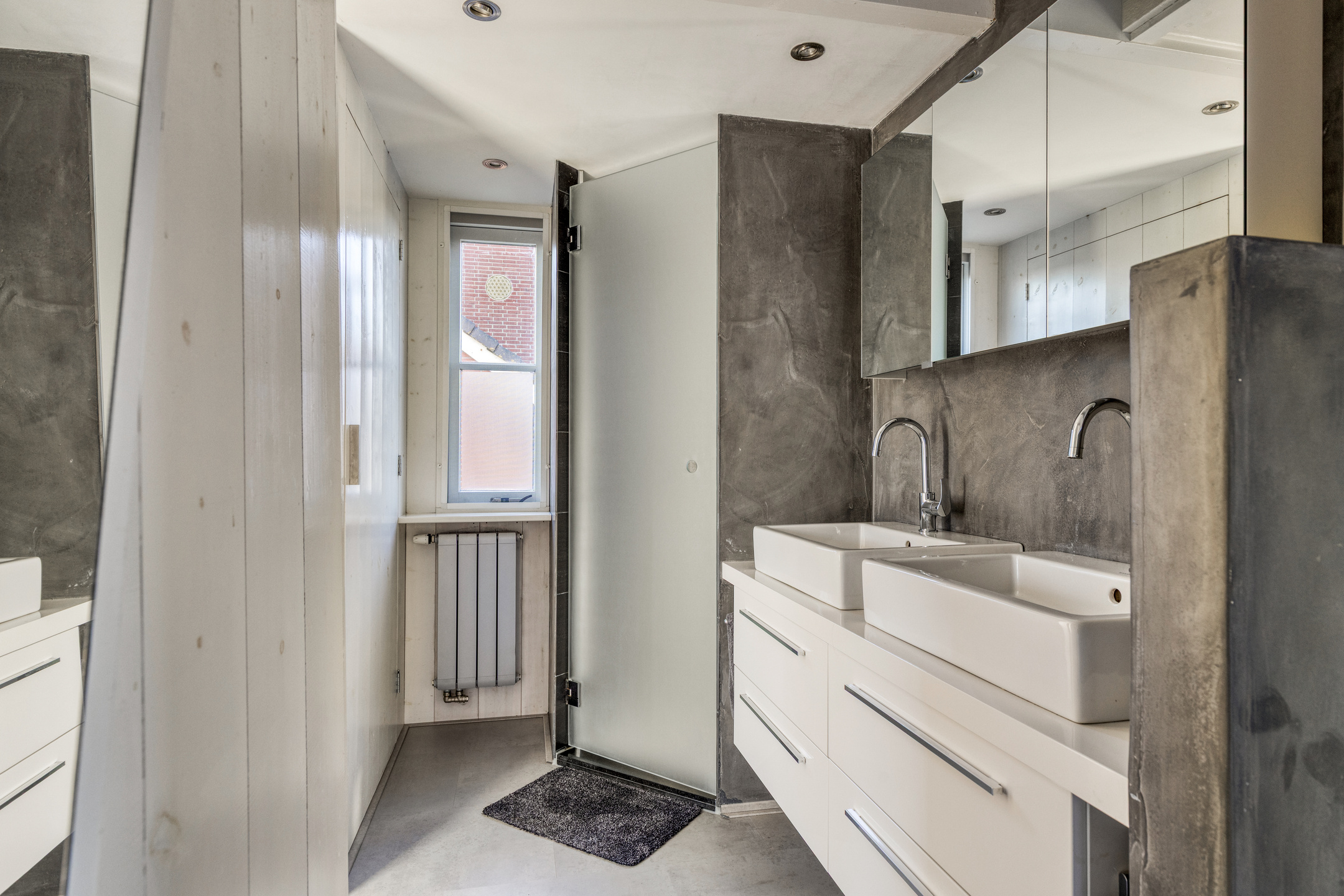De badkamer grenst aan de slaapkamer en is voorzien van een douche met glazen deur en een dubbele wastafel met spiegel. De ruimte is goed onderhouden en functioneel ingericht.