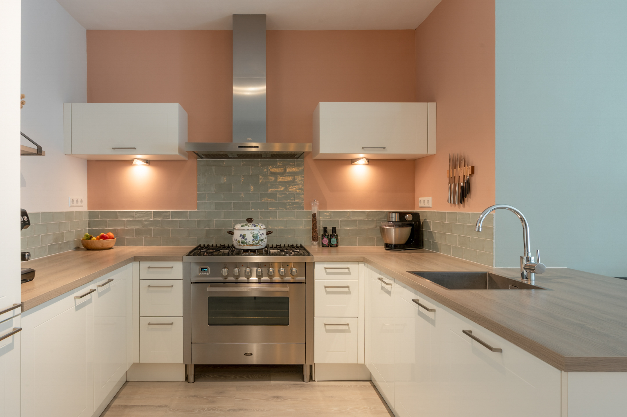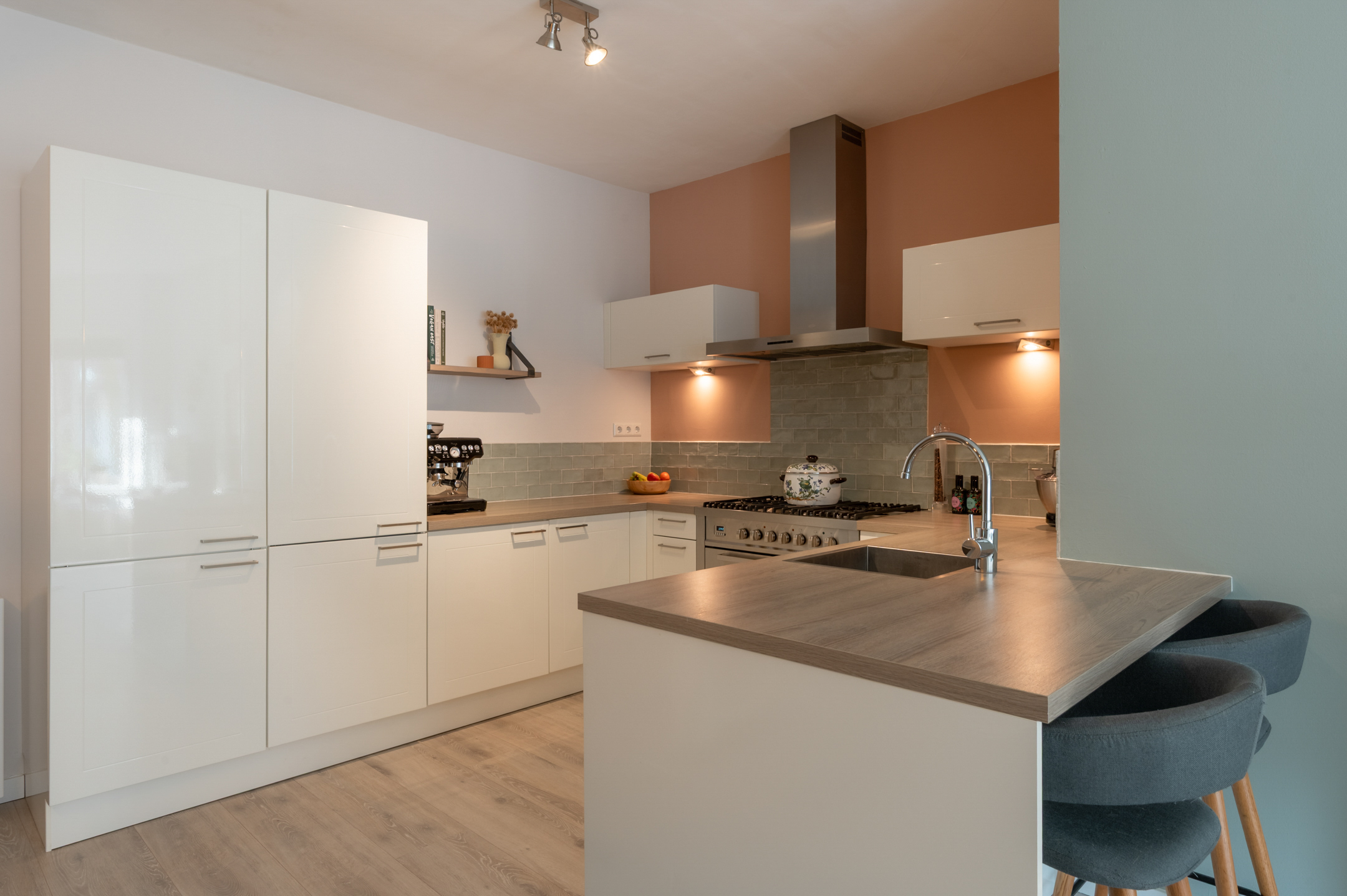 De zonnige woonkamer heeft een mooi hoog plafond en erker, waardoor de ruimte heel ruimtelijk en licht is. De moderne open keuken met een gezellig barretje is voorzien van uitgebreide apparatuur: een Boretti gasfornuis met oven, een koelkast, vriezer en een vaatwasser. Naast de keuken is genoeg ruimte voor een eethoek en is er een zeer handige en grote inbouwwandkast gecreƫerd.